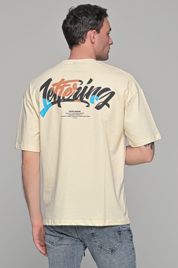 Oversized ανδρικό t-shirt μπεζ με στάμπα στην πλάτη