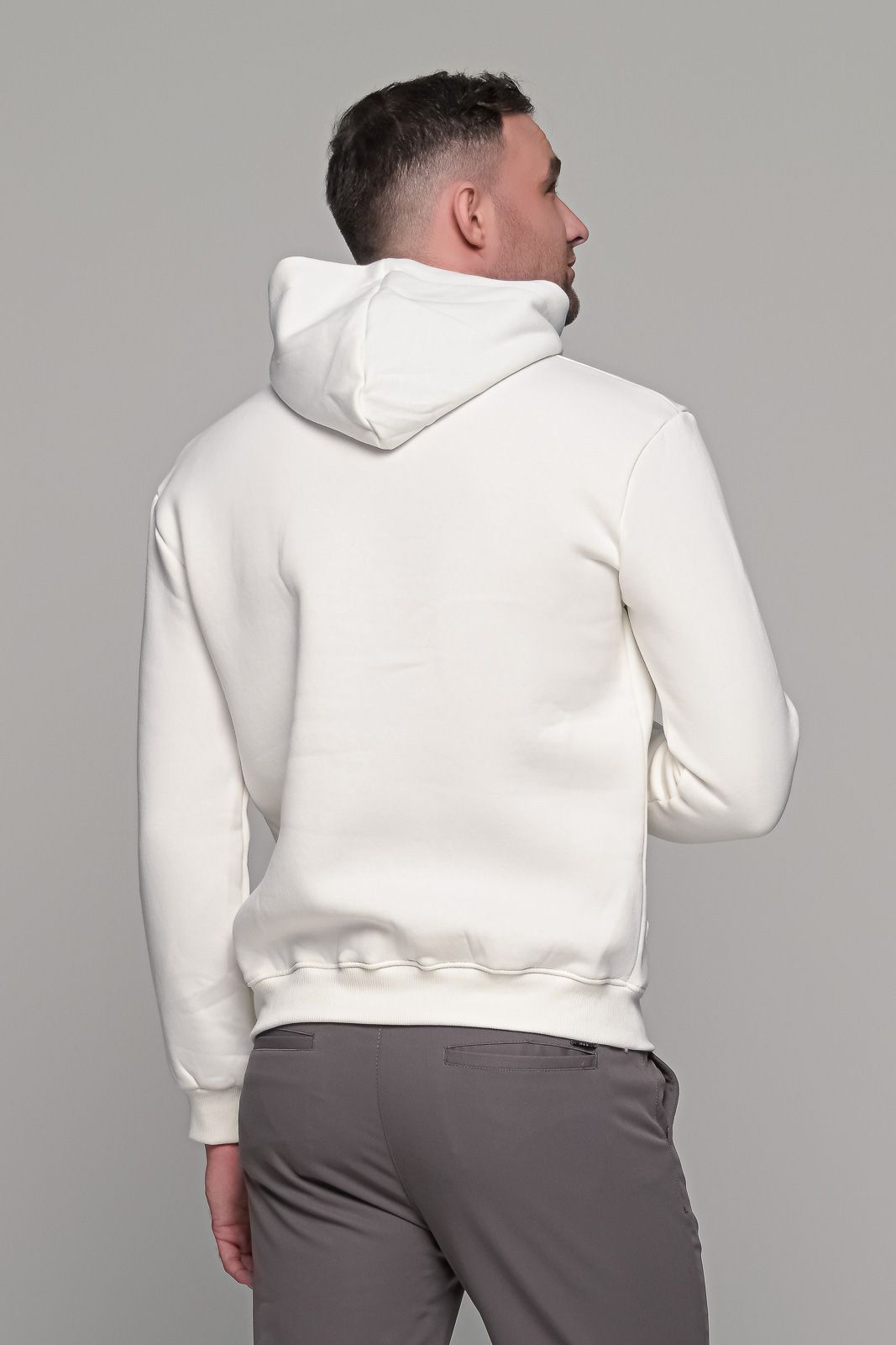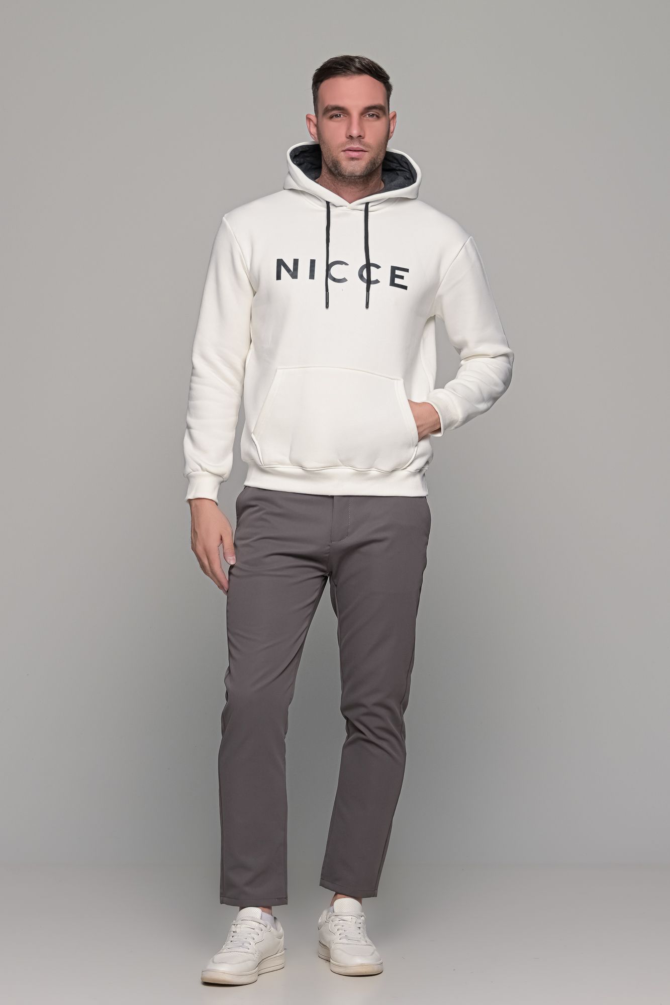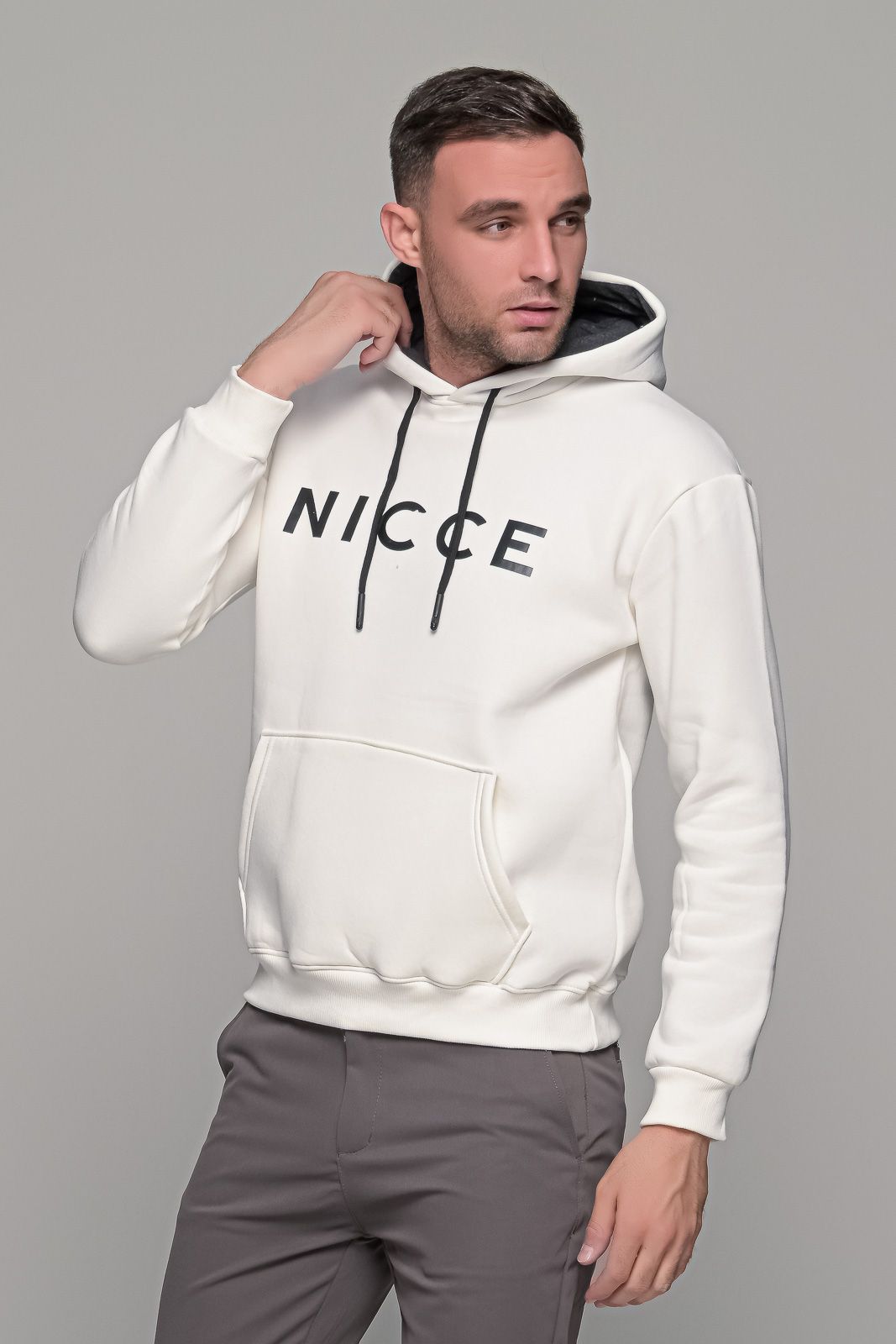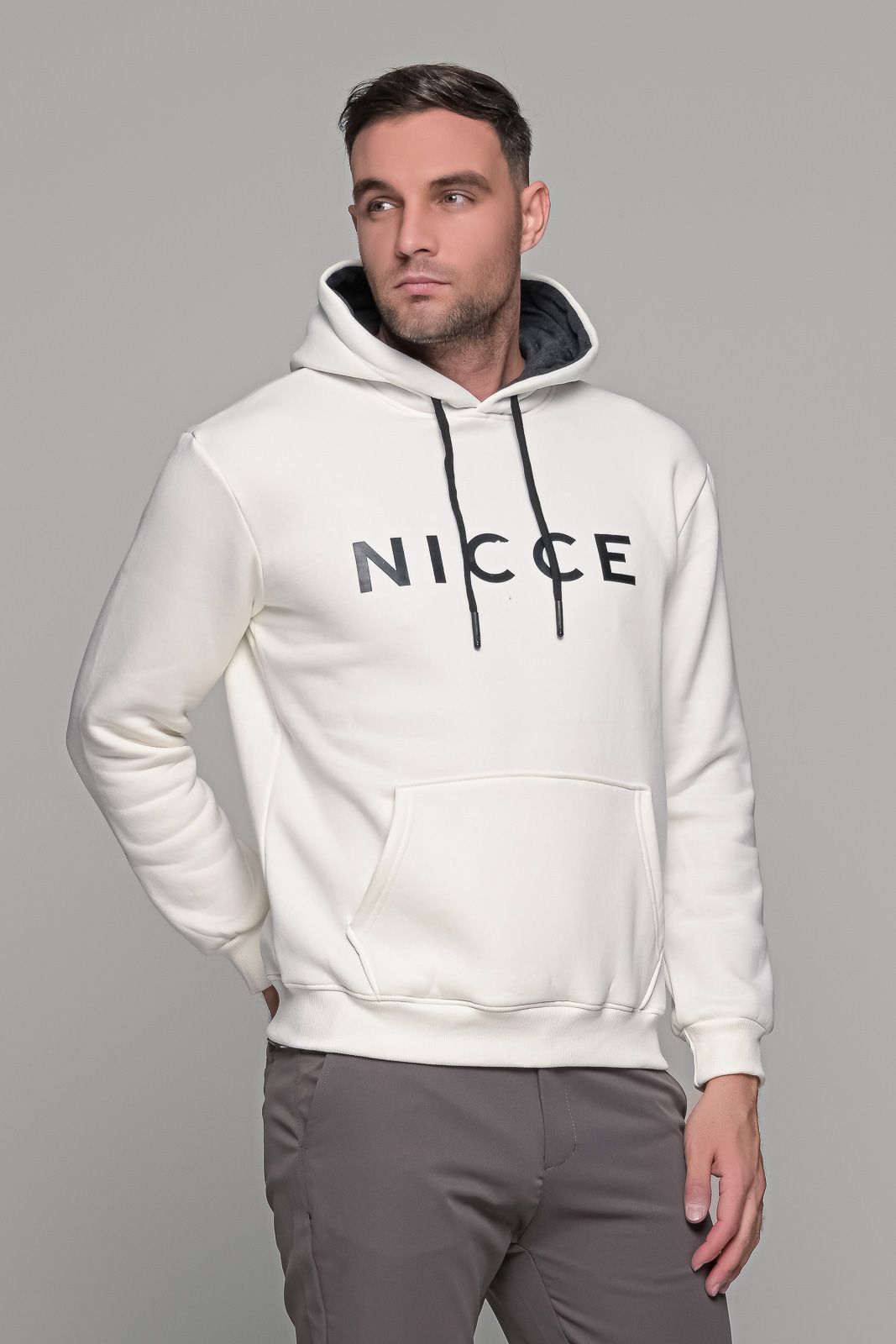 Ανδρικό λευκό φούτερ με στάμπα “NICCE” και κουκούλα