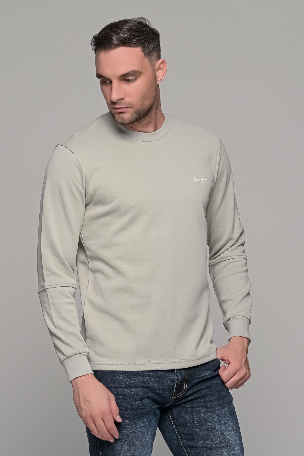 Ανδρική μακρυμάνικη μπλούζα σε ανοιχτό γκρι χρώμα με μικρό σχέδιο στο στήθος (King). Η γραμμή του είναι κανονική (normal fit) οπότε επιλέγετε το μέγεθος που φοράτε συνήθως.