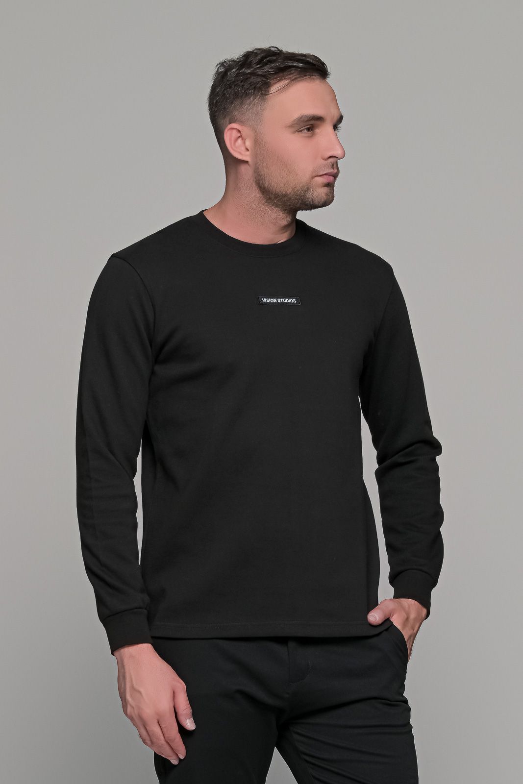 Ανδρική μακρυμάνικη μπλούζα σε μαύρο χρώμα με μικρό σχέδιο στο στήθος (VISION STUDIOS). Η γραμμή του είναι κανονική (normal fit) οπότε επιλέγετε το μέγεθος που φοράτε συνήθως.