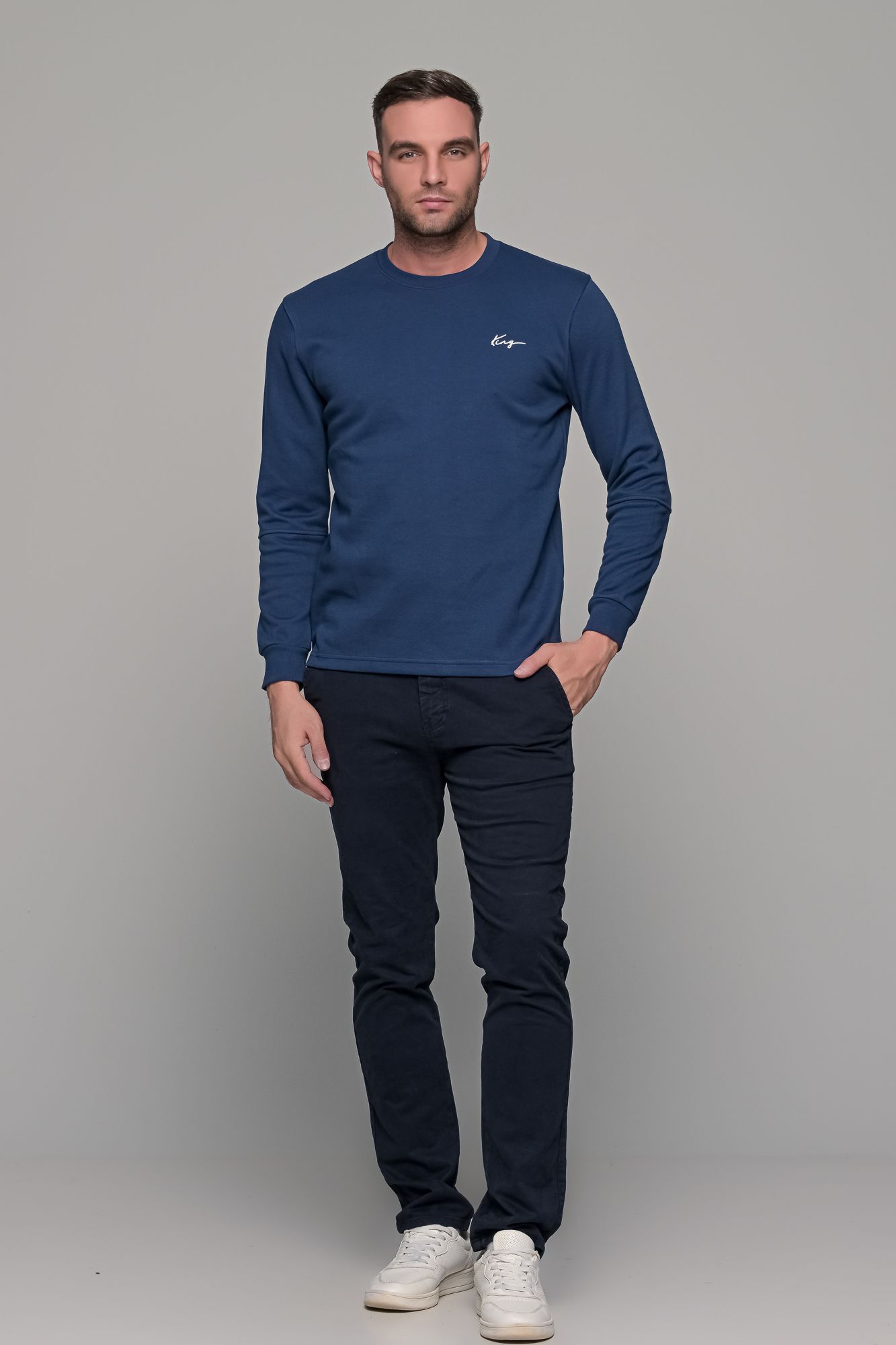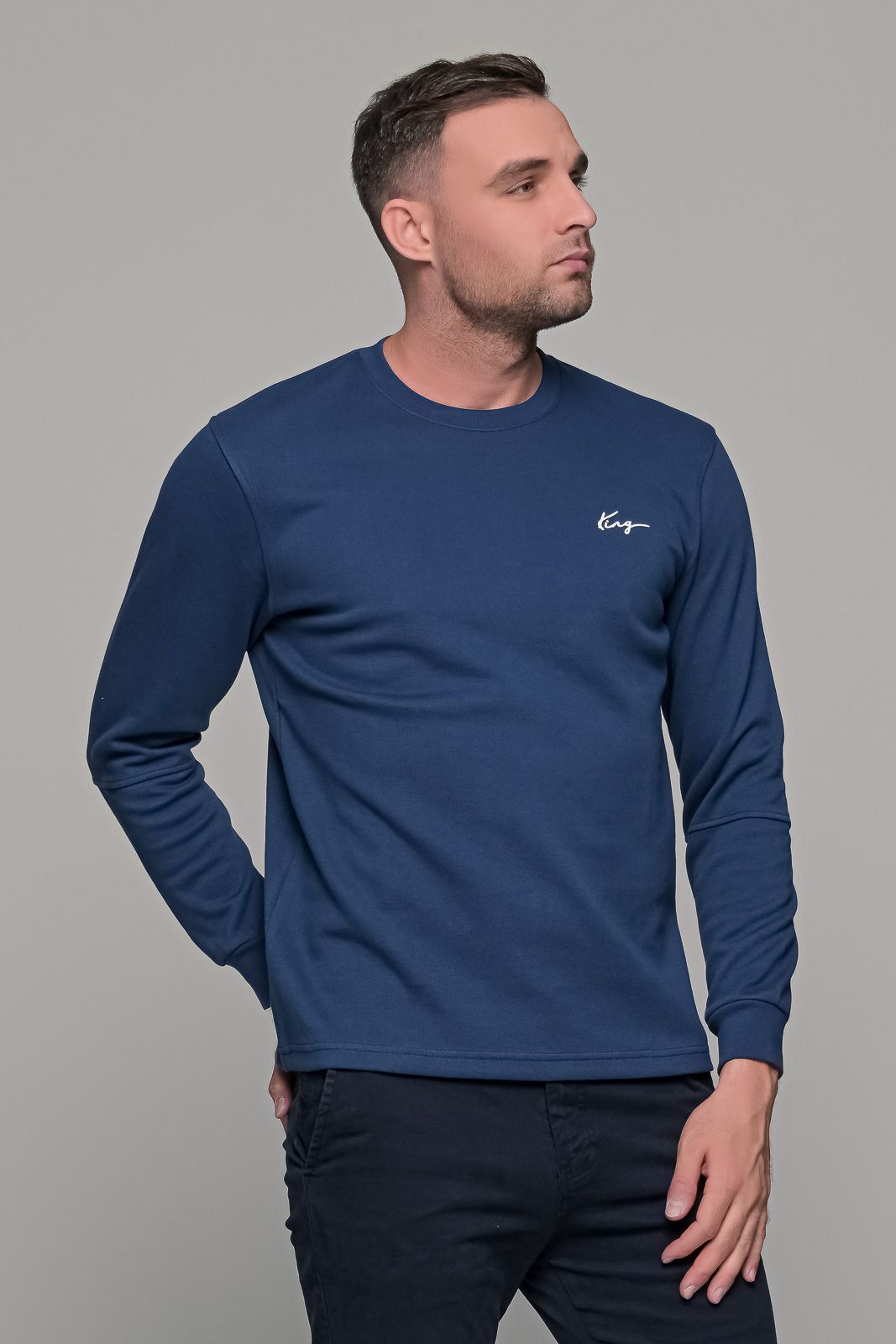 Ανδρική μακρυμάνικη μπλούζα σε μπλε χρώμα με μικρό σχέδιο στο στήθος (King). Η γραμμή του είναι κανονική (normal fit) οπότε επιλέγετε το μέγεθος που φοράτε συνήθως.