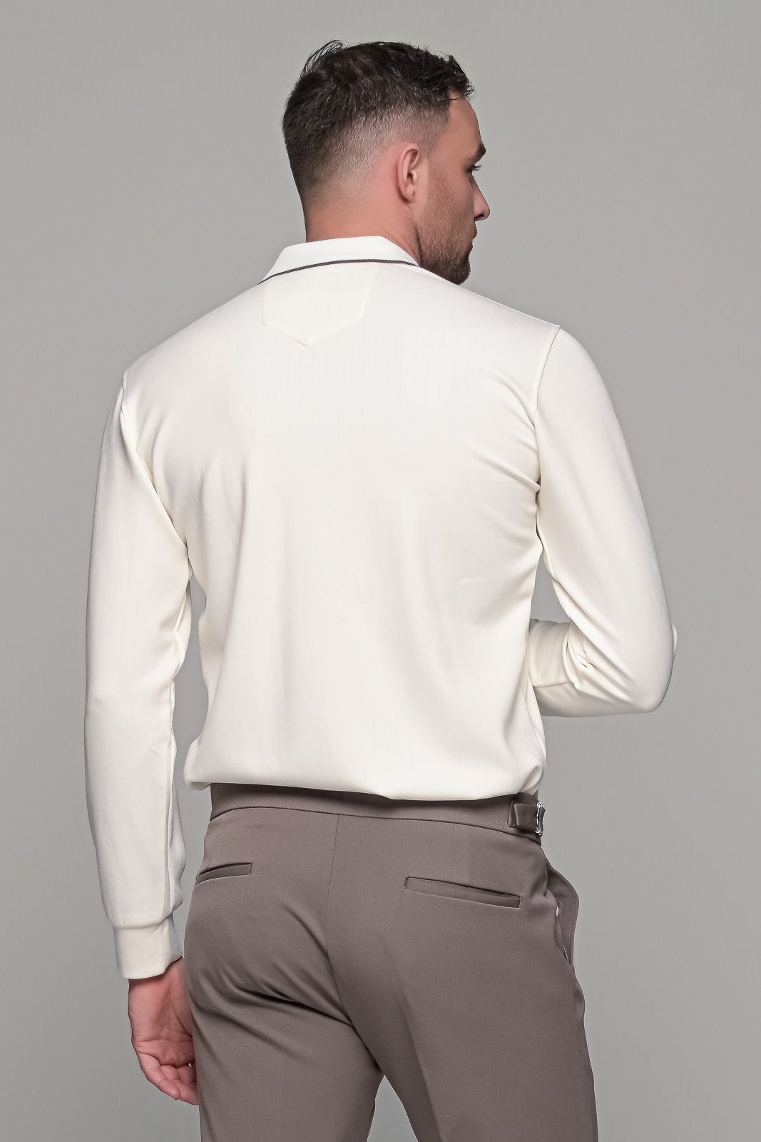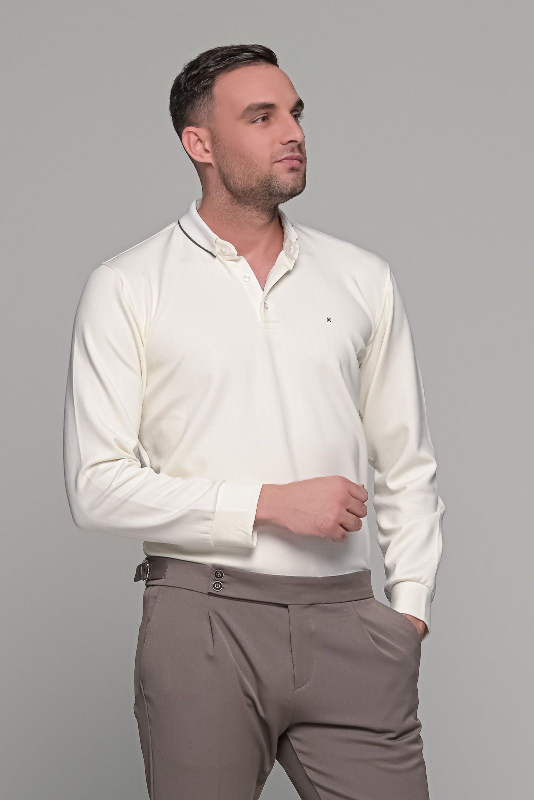 Ανδρικό μακρυμάνικο πόλο σε λευκό χρώμα. Στον λαιμό κλείνει με κουμπιά. Το ύφασμά του αποτελείται από  βισκόζη ώστε να αγκαλιάζει το ρούχο το δέρμα και να είναι μαλακό στην αφή του, συνθετικό για να είναι ζεστό, να μην τσαλακώνει και να έχει αντοχή στη φθορά και ελαστικό για να παίρνει την μορφή από το σώμα. Το ύφασμα του κάνει μικρό σχέδιο με ρίγα στο ίδιο χρώμα. Το ανδρικό μακρυμάνικο πόλο σε λευκό χρώμα μπορεί να φορεθεί με πολλούς διαφορετικούς συνδυασμούς χρωματικά, ενώ συνδυάζεται ιδανικά με παντελόνια (chino, υφασμάτινα τύπου κουστουμιού, cargo και με τζιν). Η γραμμή του είναι κανονική οπότε προτείνεται η αγορά μεγέθους που φοράτε συνήθως.