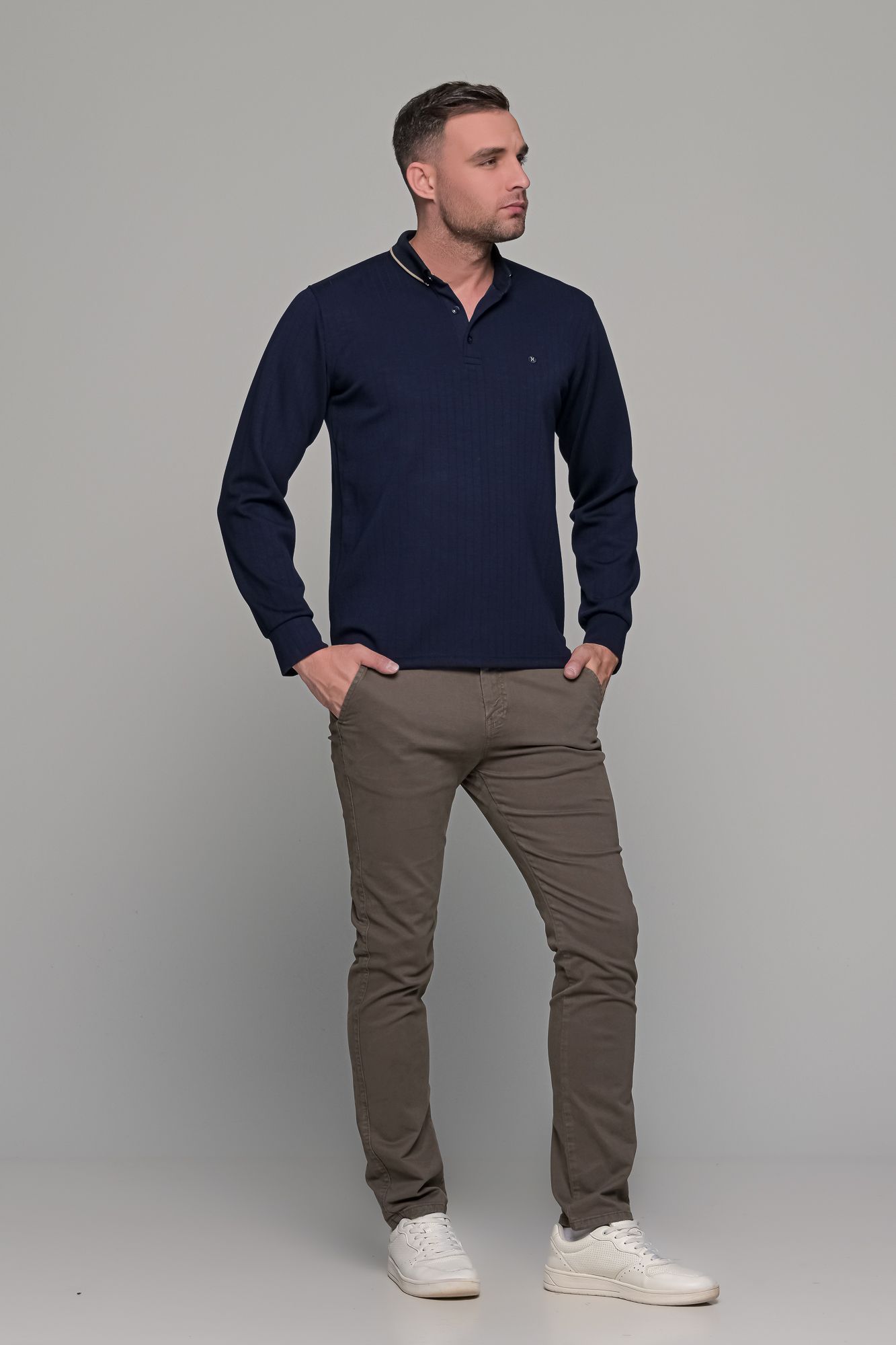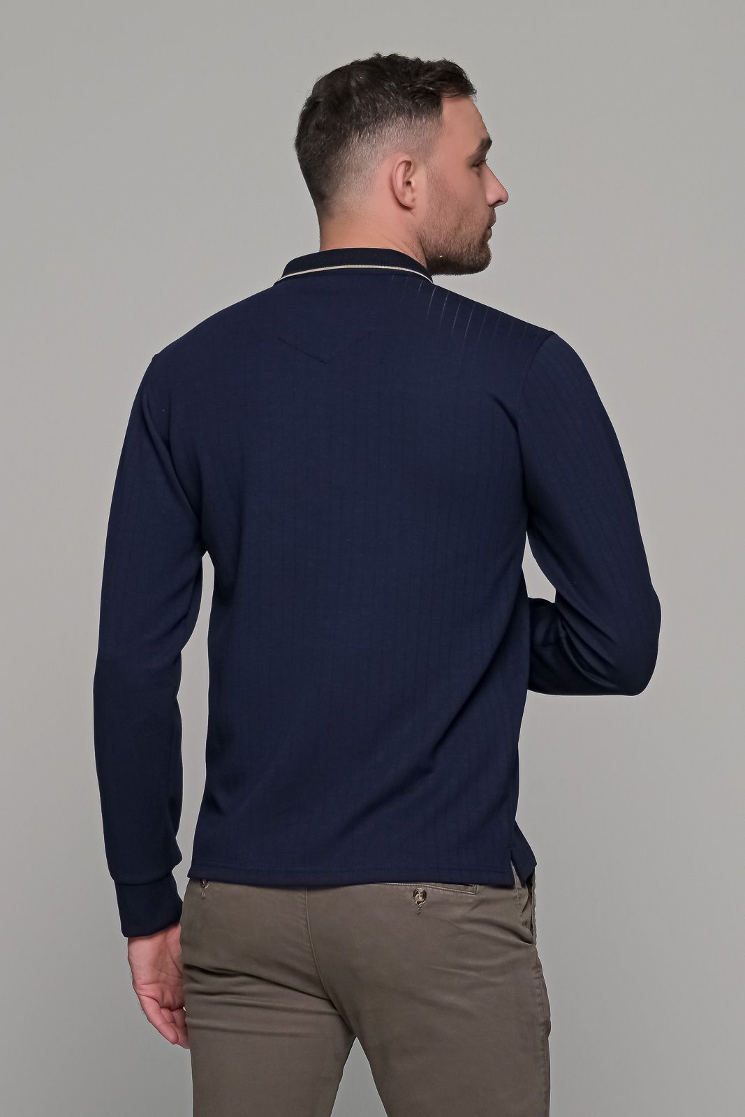 Ανδρικό μακρυμάνικο πόλο σε μπλε (navy) χρώμα. Στον λαιμό κλείνει με κουμπιά. Το ύφασμά του αποτελείται από βισκόζη ώστε να αγκαλιάζει το ρούχο το δέρμα και να είναι μαλακό στην αφή του, συνθετικό για να είναι ζεστό, να μην τσαλακώνει και να έχει αντοχή στη φθορά και ελαστικό για να παίρνει την μορφή από το σώμα. Το ύφασμα του κάνει μικρό σχέδιο με ρίγα στο ίδιο χρώμα. Το ανδρικό μακρυμάνικο πόλο σε μπλε (navy) χρώμα μπορεί να φορεθεί με πολλούς διαφορετικούς συνδυασμούς χρωματικά, ενώ συνδυάζεται ιδανικά με παντελόνια (chino, υφασμάτινα τύπου κουστουμιού, cargo και με τζιν). Η γραμμή του είναι κανονική οπότε προτείνεται η αγορά μεγέθους που φοράτε συνήθως.