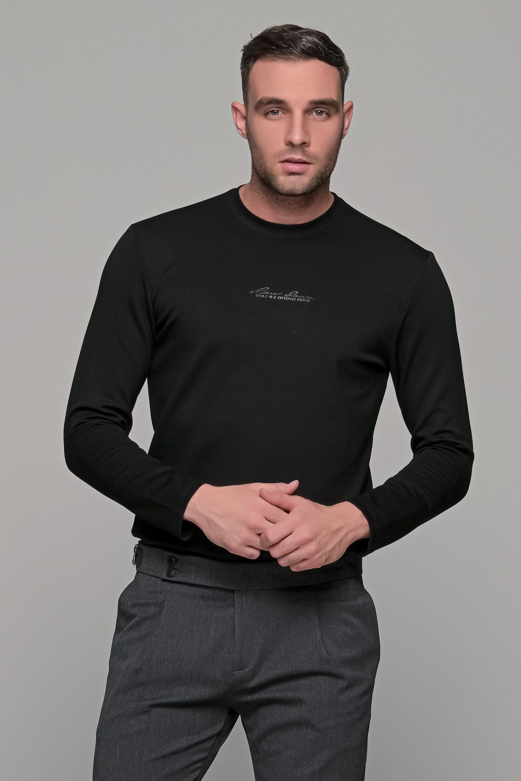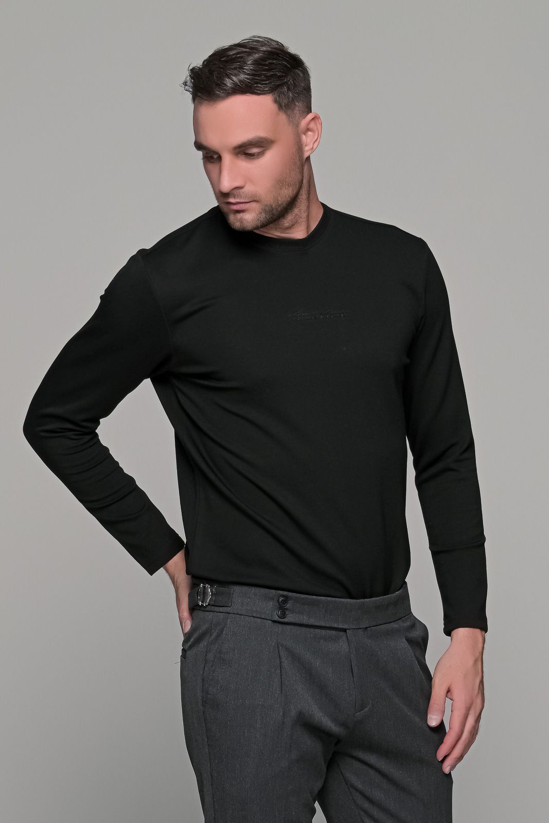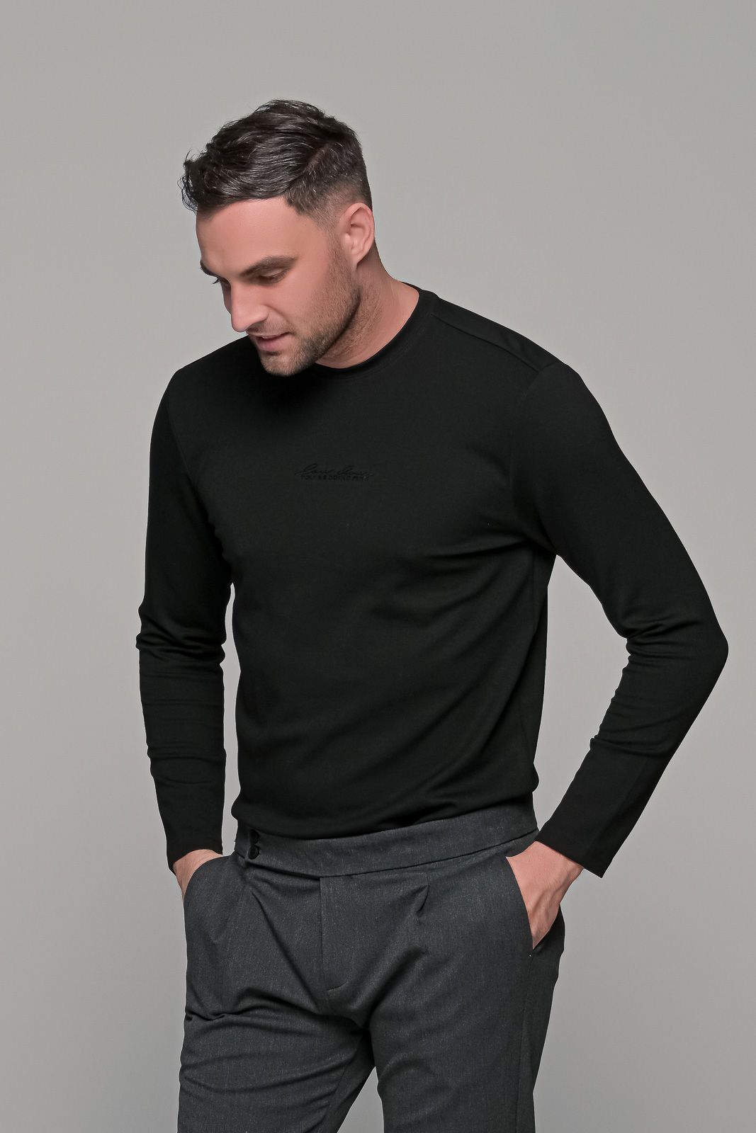 Ανδρική μακρυμάνικη μπλούζα σε μαύροχρώμα με μικρό ανάγλυφο σχέδιο στο στήθος. Η ύφανση της είναι λεία με υφή modal. Η γραμμή της είναι κανονική (normal fit) οπότε επιλέγετε το μέγεθος που φοράτε συνήθως.