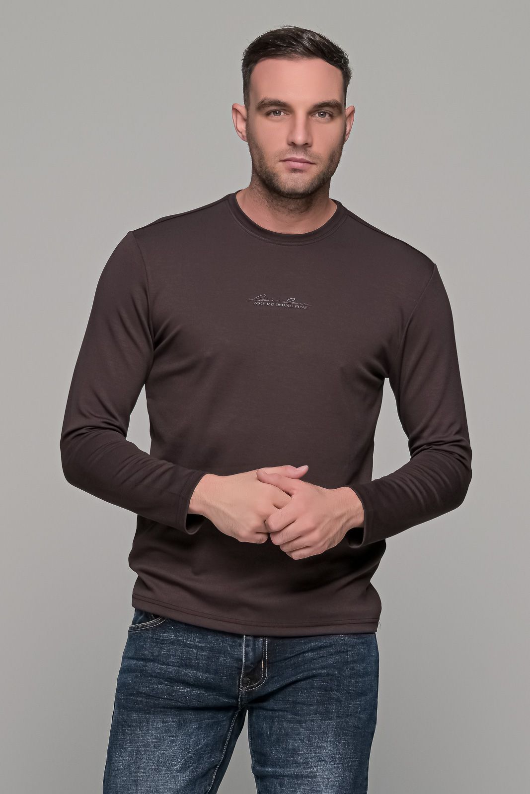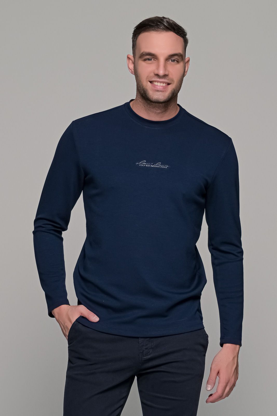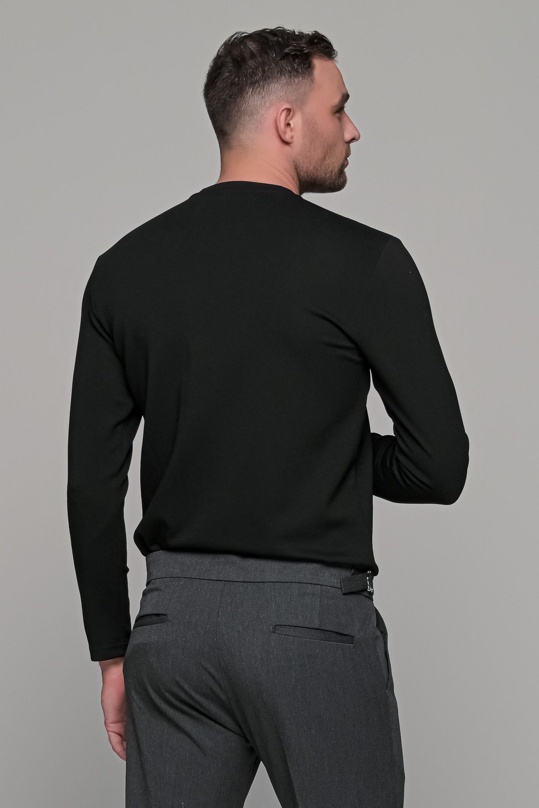 Ανδρική μακρυμάνικη μπλούζα σε μαύροχρώμα με μικρό ανάγλυφο σχέδιο στο στήθος. Η ύφανση της είναι λεία με υφή modal. Η γραμμή της είναι κανονική (normal fit) οπότε επιλέγετε το μέγεθος που φοράτε συνήθως.