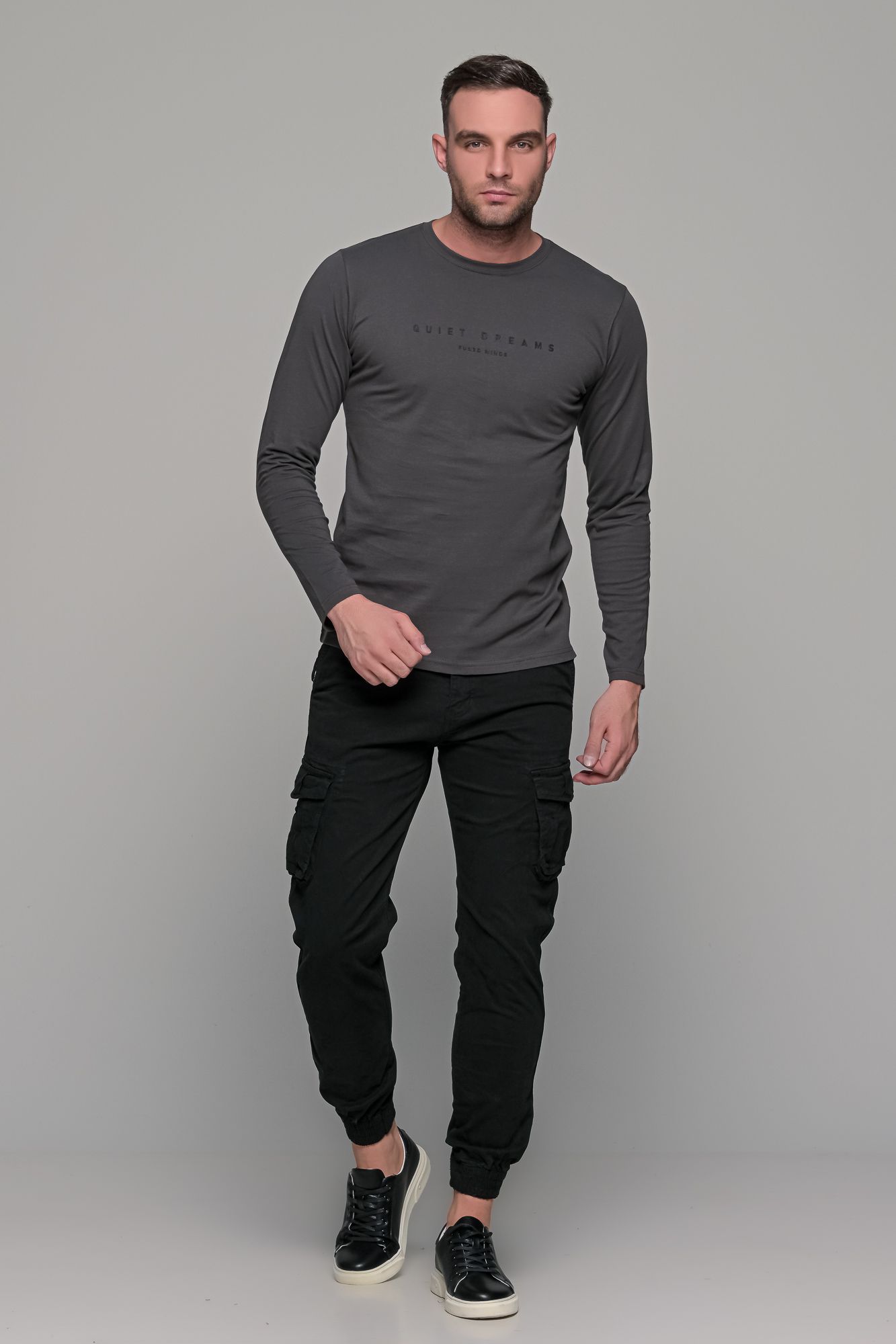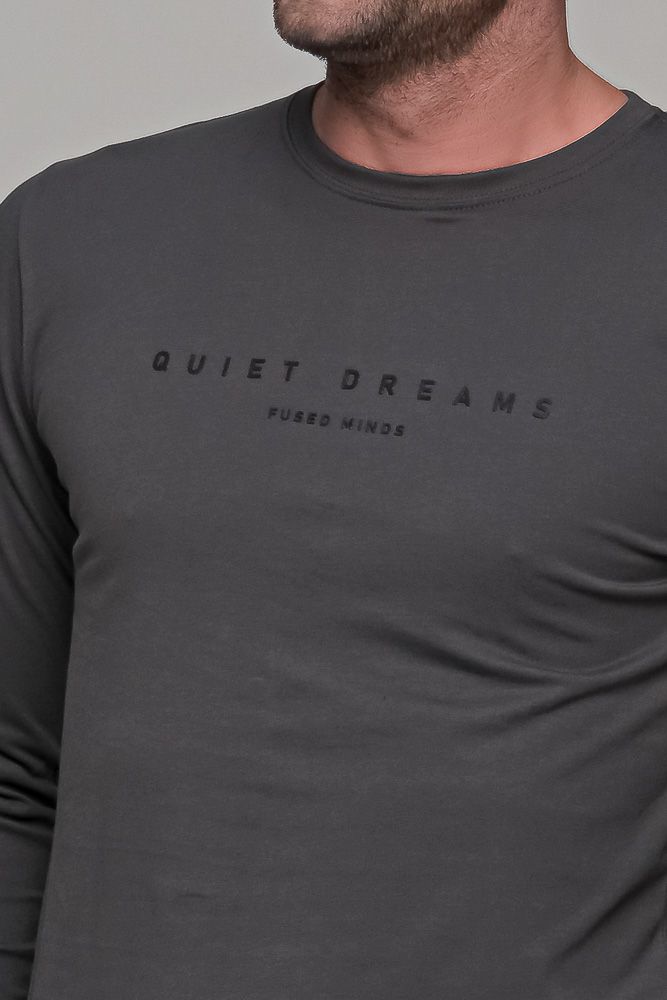 Ανδρικό μακρυμάνικο t-shirt μπλουζάκι σε σκούρο γκρι χρώμα με διακριτική στάμπα Quiet Drems. Η γραμμή του είναι κανονική (normal fit) οπότε επιλέγετε το μέγεθος που φοράτε συνήθως.