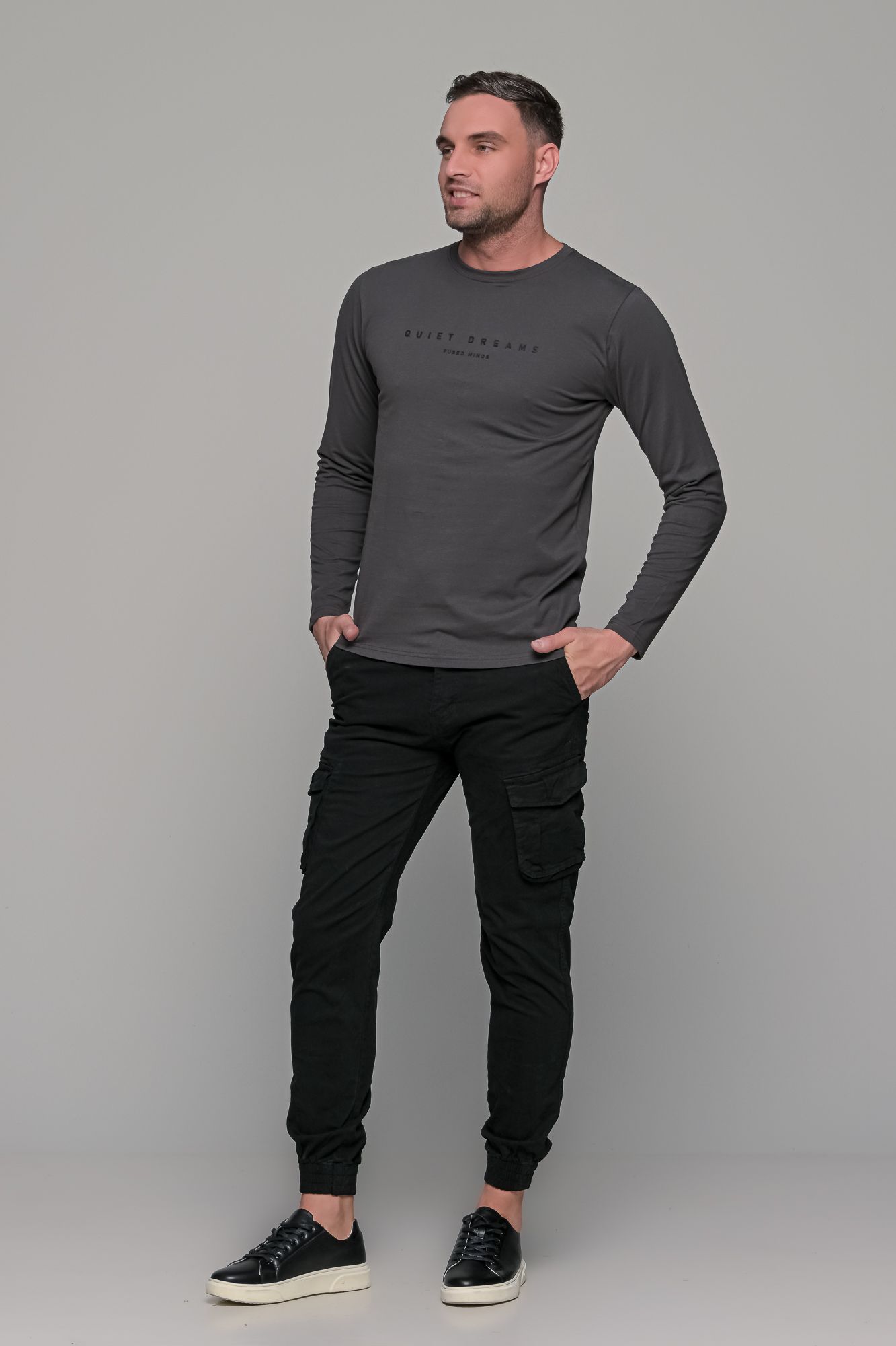 Σκούρο γκρι μακό μακρυμάνικο ανδρικό t-shirt. Έχει διακριτική στάμπα στο στήθος Quiet Drems . Λεπτό και ανάλαφρο, κατασκευασμένο από 100% βαμβάκι, μπορεί να φορεθεί όλες τις ώρες της ημέρας. Τους πολύ κρύους μήνες του χειμώνα μπορεί να συνδυαστεί ιδανικά με ένα πλεκτό ή ένα πανωφόρι ώστε να συμπληρώνει το outfit και να προστατεύει από το κρύο. Μπορεί να συνδυαστεί με τζιν, με cargo αλλά και με υφασμάτινα παντελόνια. Η γραμμή του είναι κανονική (normal fit) οπότε συνίσταται η επιλογή του μεγέθους που φοράτε συνήθως.