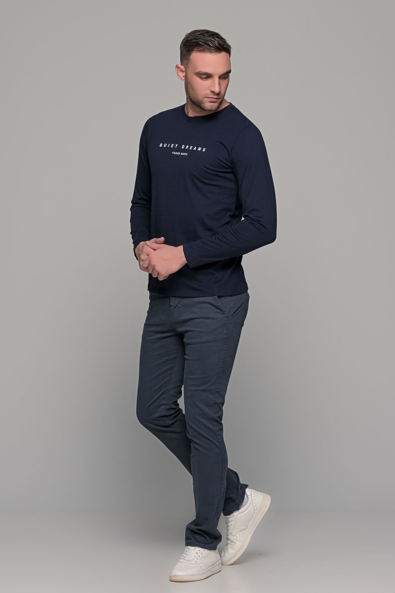 Ανδρικό μακρυμάνικο t-shirt μπλουζάκι σε σκούρο μπλε χρώμα με διακριτική στάμπα Quiet Drems. Η γραμμή του είναι κανονική (normal fit) οπότε επιλέγετε το μέγεθος που φοράτε συνήθως.