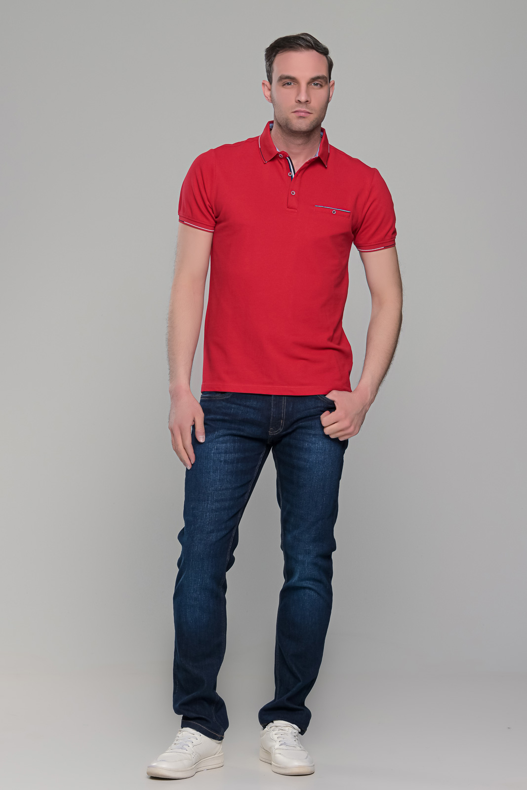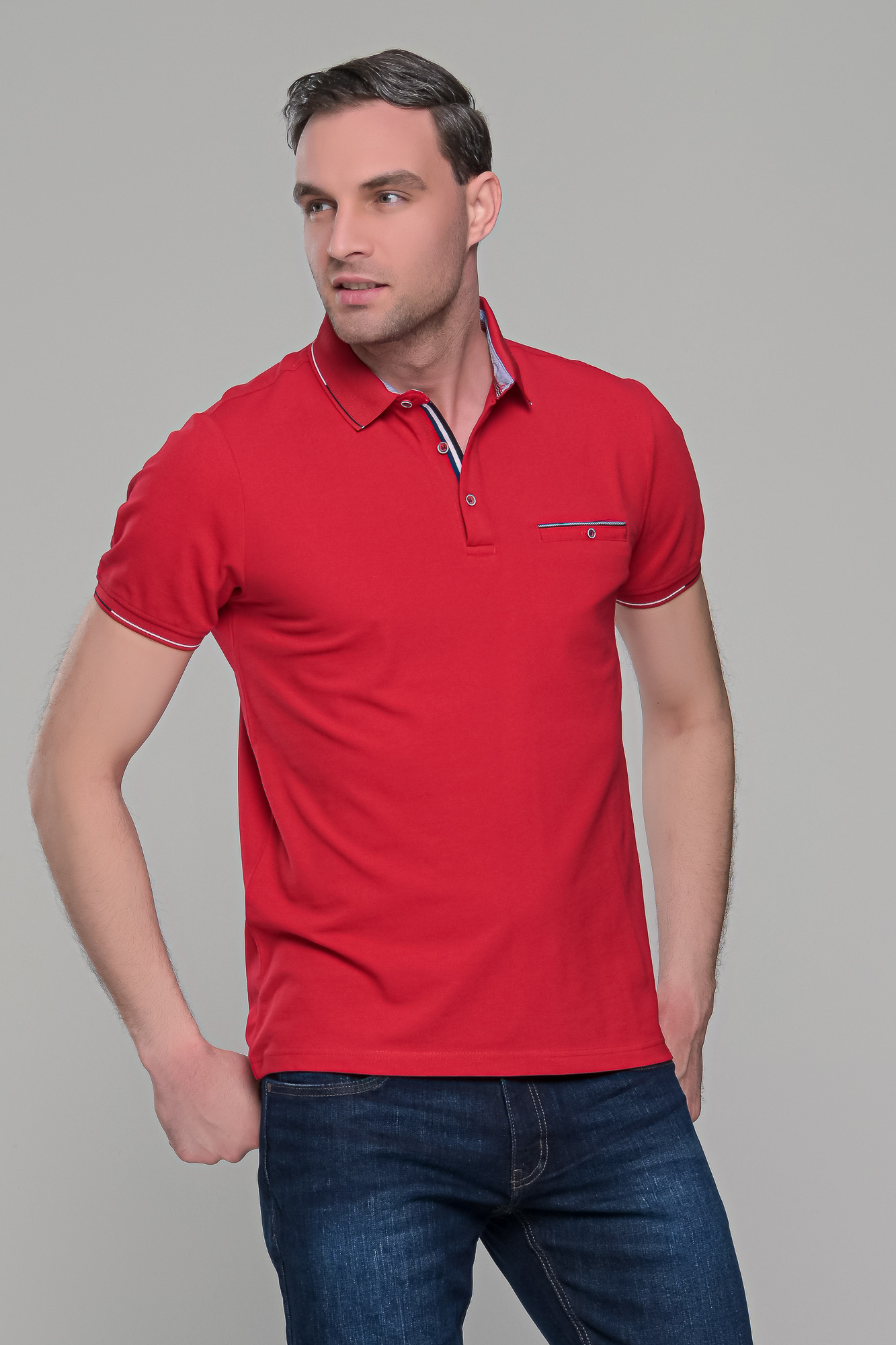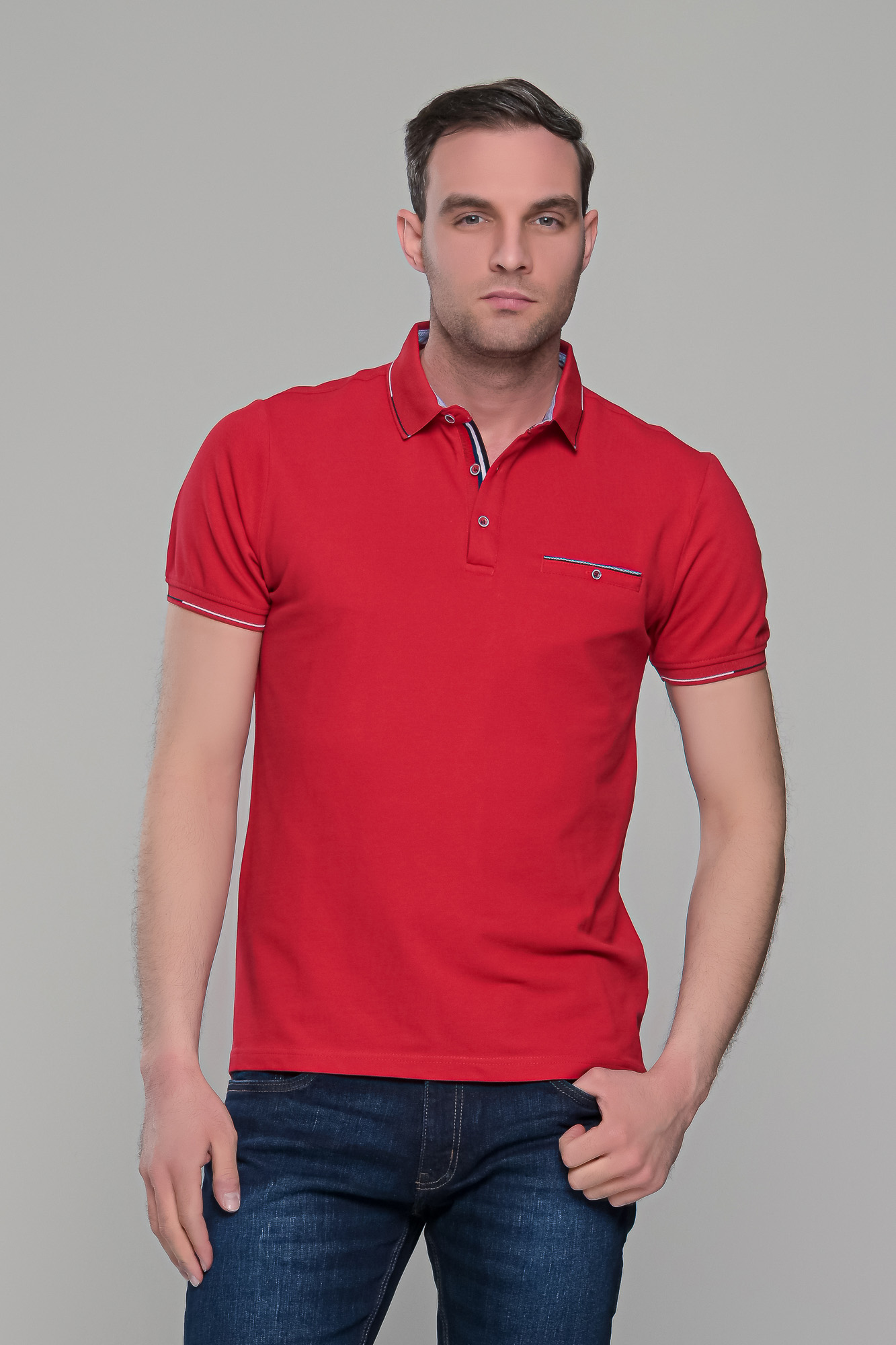 Ανδρικό κόκκινο πόλο μπλουζάκι με τσεπάκι στο στήθος. Ο γιακάς και τα μανίκια έχουν λεπτομέρειες σε μαύρο και λευκό χρώμα και στο στήθος κλείνει με κουμπιά. H γραμμή του είναι στενή (slim fit). Προτείνεται η αγορά ενός μεγέθους μεγαλύτερου από αυτό που φοράτε συνήθως, εκτός αν το θέλετε στενό επάνω σας, οπότε μπορείτε να επιλέξετε το μέγεθος που φοράτε συνήθως.