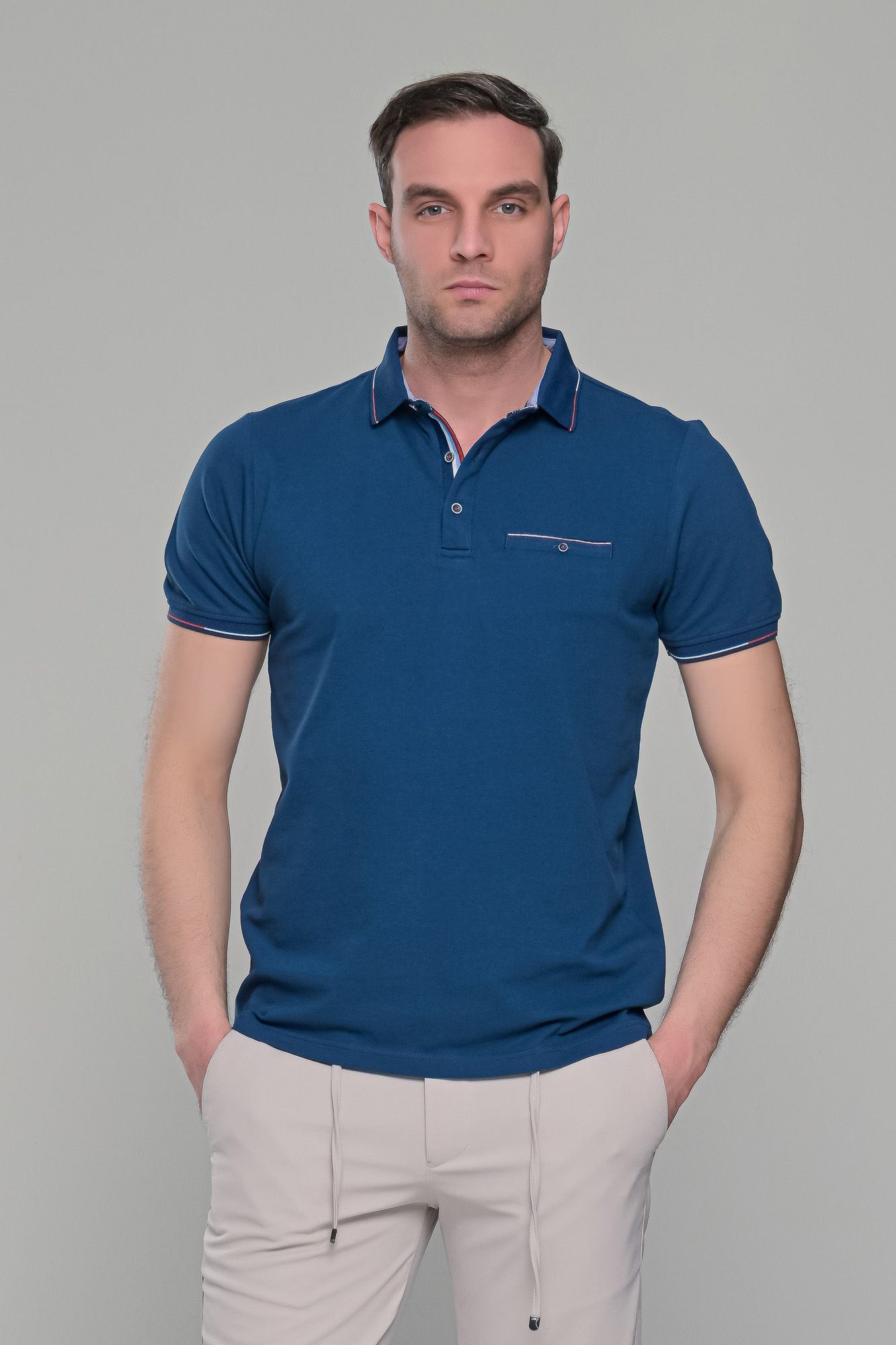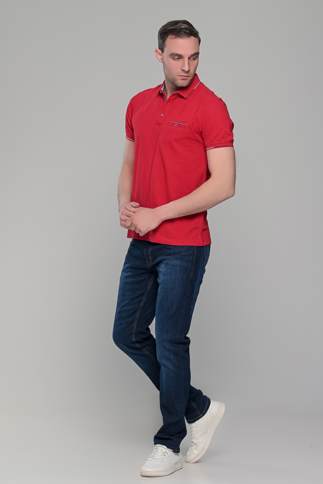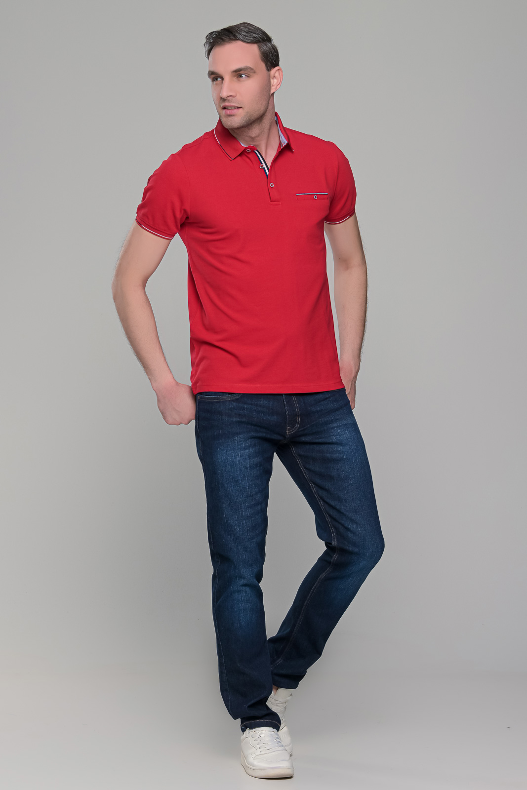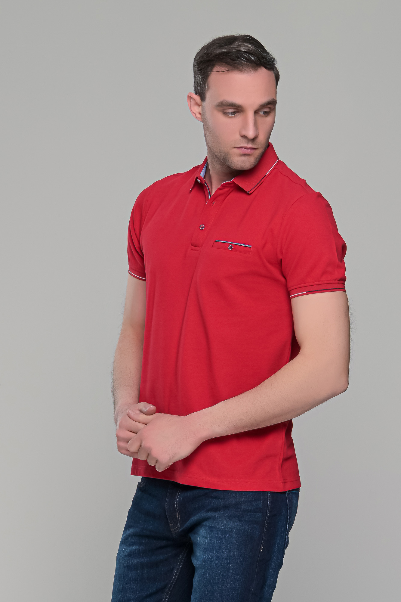 Ανδρικό κόκκινο πόλο μπλουζάκι με τσεπάκι στο στήθος. Ο γιακάς και τα μανίκια έχουν λεπτομέρειες σε μαύρο και λευκό χρώμα και στο στήθος κλείνει με κουμπιά. H γραμμή του είναι στενή (slim fit). Προτείνεται η αγορά ενός μεγέθους μεγαλύτερου από αυτό που φοράτε συνήθως, εκτός αν το θέλετε στενό επάνω σας, οπότε μπορείτε να επιλέξετε το μέγεθος που φοράτε συνήθως.