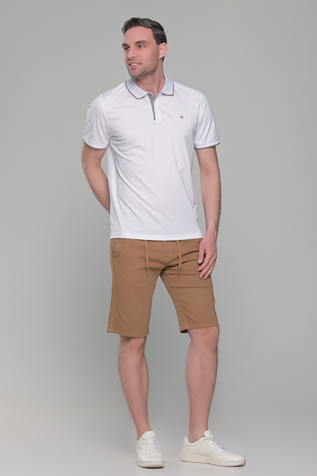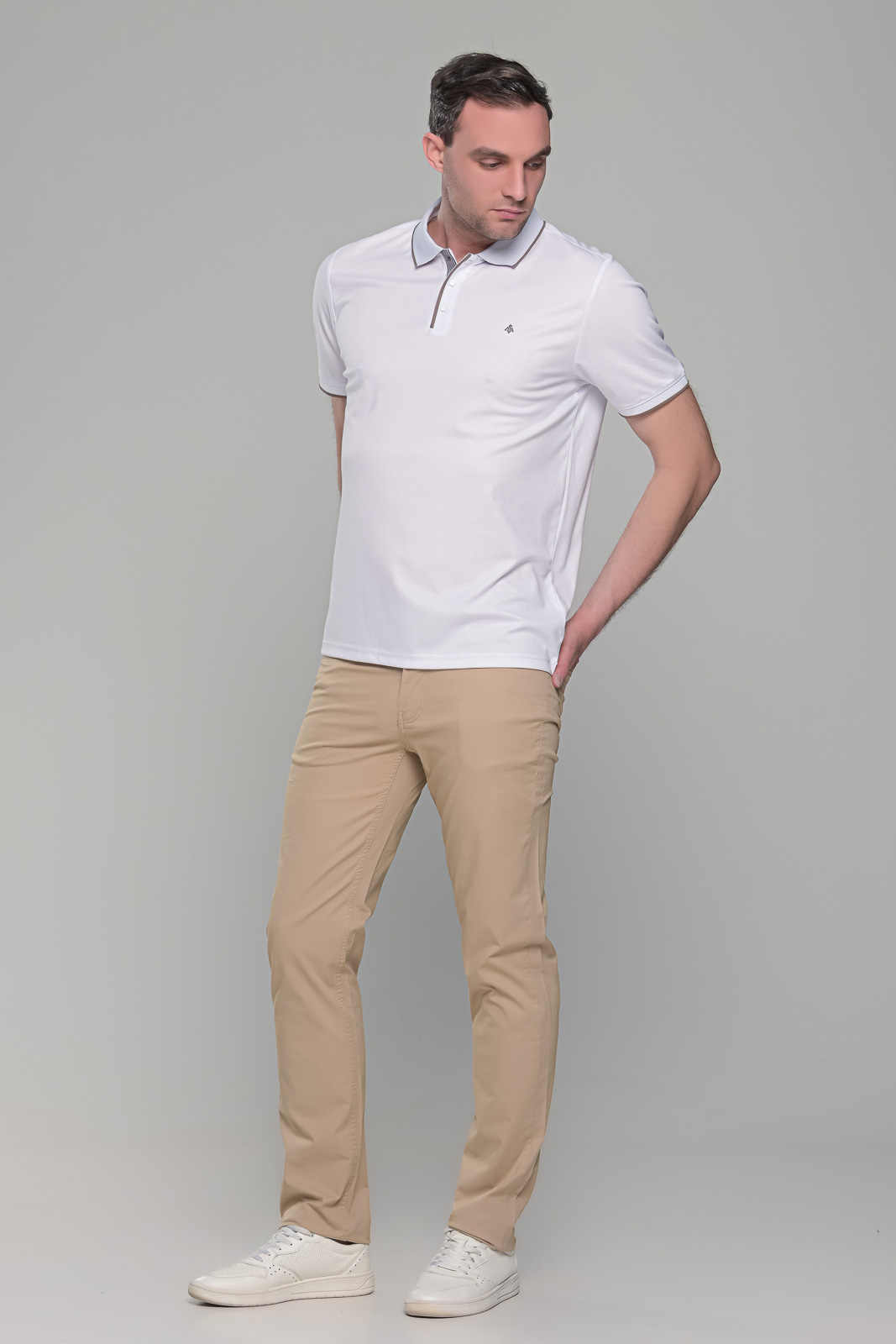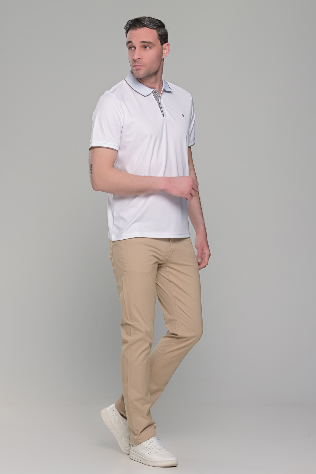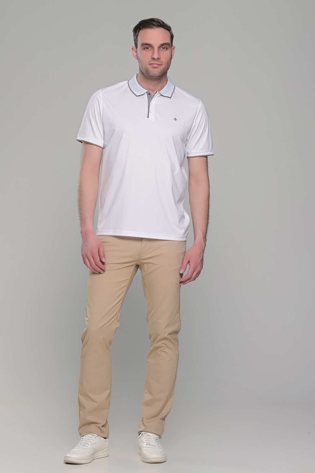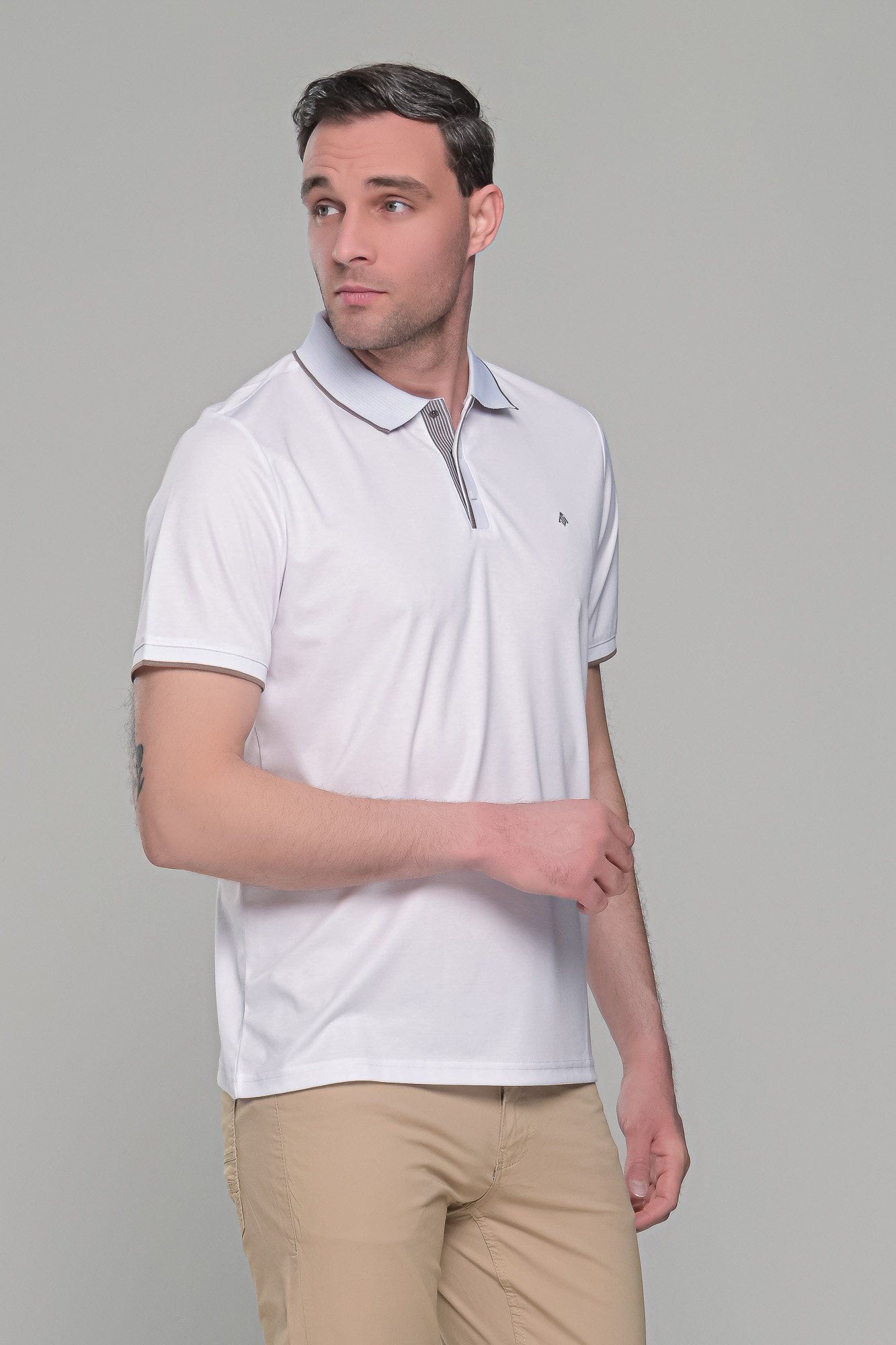 Ανδρικό λευκό πόλο μπλουζάκι MS με κοντό μανίκι. Ο γιακάς και τα μανίκια έχουν λεπτομέρειες σε κάμελ χρώμα. H γραμμή του είναι στενή (slim fit). Το ύφασμά του είναι από 45% βαμβάκι για να αναπνέει το δέρμα και 55% συνθετικό για να εφαρμόζει σε κάθε σώμα. Έχει μικρό σχέδιο στο στήθος και κλείνει με κουμπιά στον λαιμό. Το ύφασμα του έχει ειδική επεξεργασίας ούτως ώστε αν πλυθεί σε χαμηλές στροφές στο πλυντήριο (ή στο χέρι) και τεντωθεί καλά κατά το άπλωμα, να μην χρειάζεται καθόλου σίδερο. Το λευκό πόλο μπλουζάκι MS με κοντό μανίκι και γιακά είναι πολύ λεπτό και ανάλαφρο, ιδανικός σύμμαχος κατά της ζέστης τους θερινούς μήνες. Φίνο και κομψό, ιδανικό για casual αλλά και βραδινά ντυσίματα, μιας και μπορεί να φορεθεί ακόμα και μέσα από σακάκι. Συνδυάζεται ιδανικά με παντελόνια, τζιν και βερμούδες.
