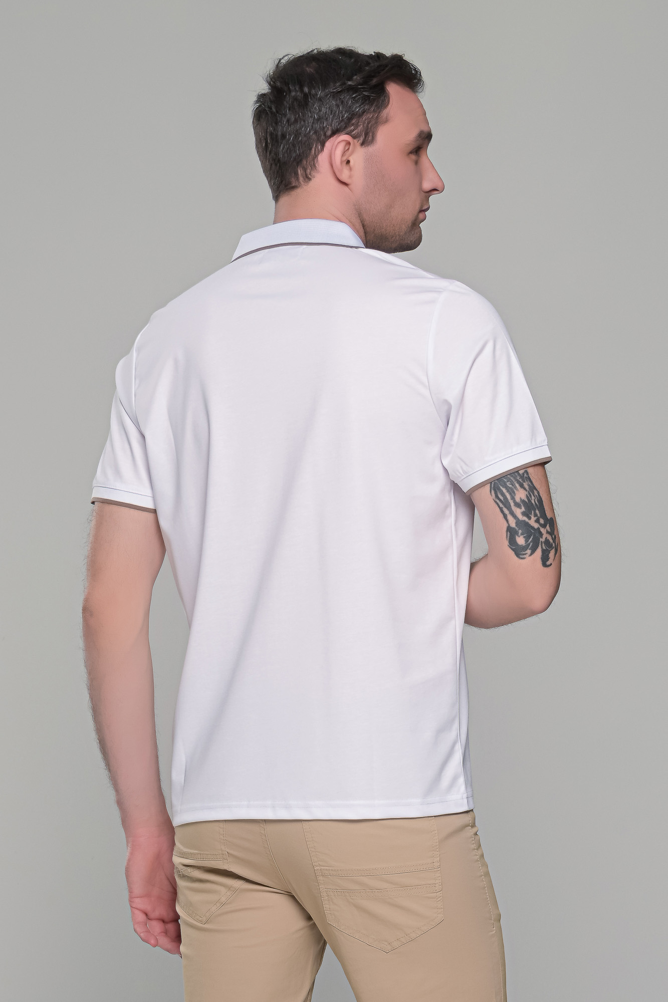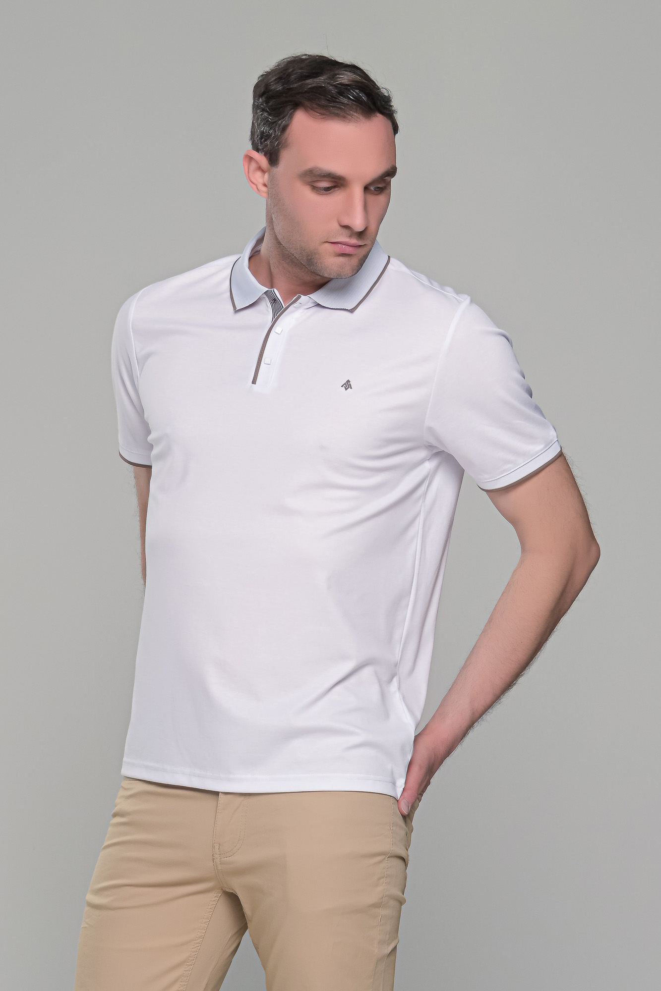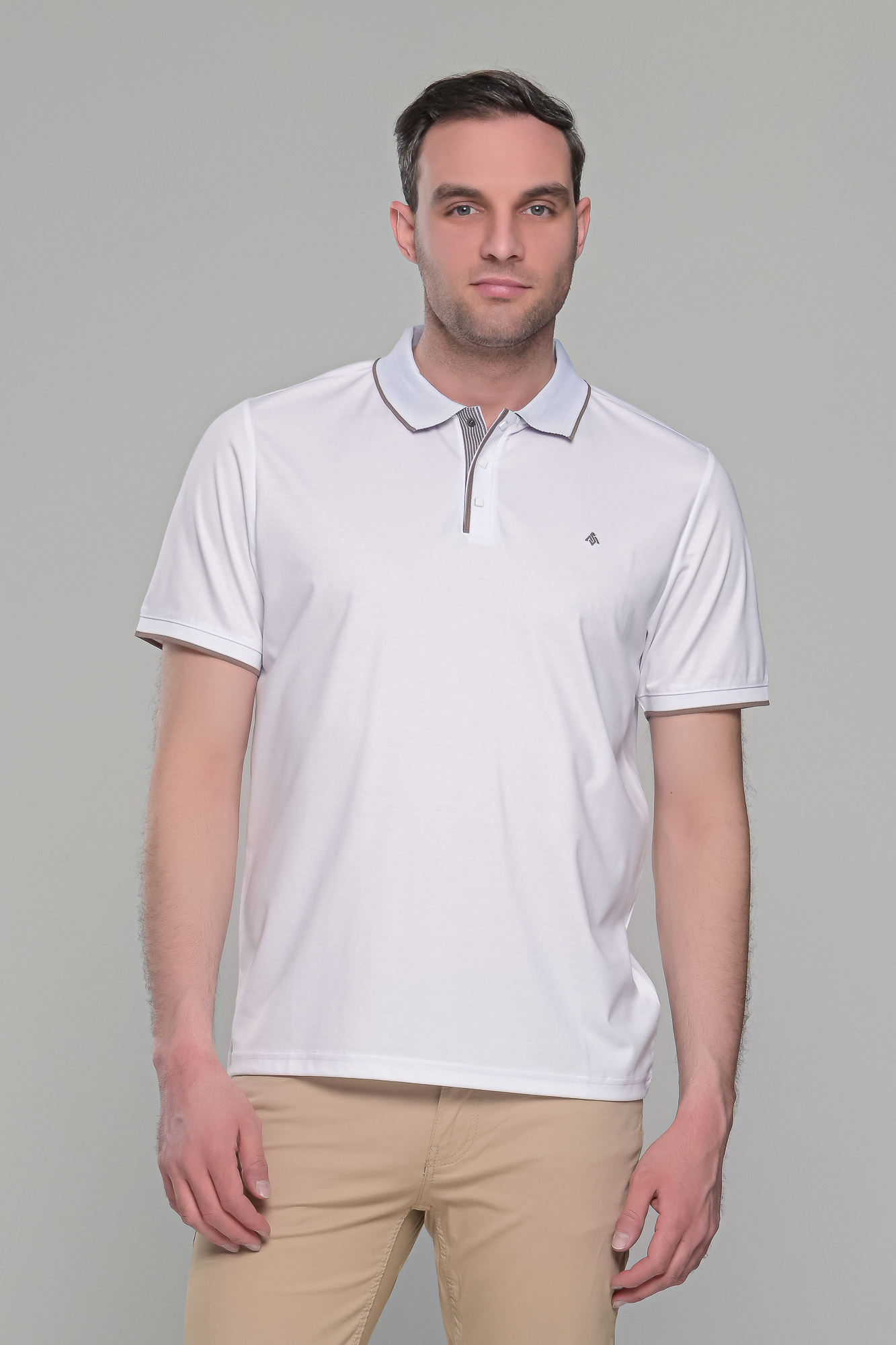 Ανδρικό λευκό πόλο μπλουζάκι MS με κοντό μανίκι. Ο γιακάς και τα μανίκια έχουν λεπτομέρειες σε κάμελ χρώμα και στο στήθος κλείνει με κουμπιά. H γραμμή του είναι στενή (slim fit). Προτείνεται η αγορά ενός μεγέθους μεγαλύτερου από αυτό που φοράτε συνήθως, εκτός αν το θέλετε στενό επάνω σας, οπότε μπορείτε να επιλέξετε το μέγεθος που φοράτε συνήθως.