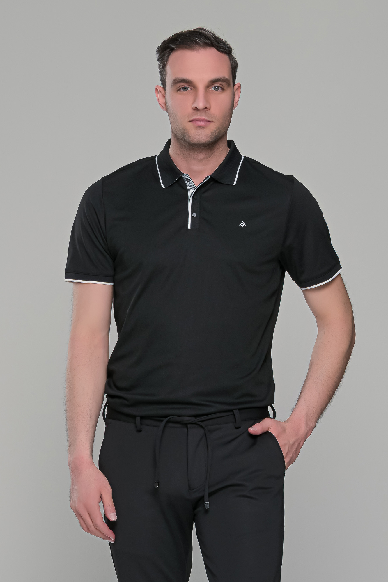 Ανδρικό μαύρο πόλο μπλουζάκι MS με κοντό μανίκι. Ο γιακάς και τα μανίκια έχουν λεπτομέρειες σε λευκό χρώμα και στο στήθος κλείνει με κουμπιά. H γραμμή του είναι στενή (slim fit). Προτείνεται η αγορά ενός μεγέθους μεγαλύτερου από αυτό που φοράτε συνήθως, εκτός αν το θέλετε στενό επάνω σας, οπότε μπορείτε να επιλέξετε το μέγεθος που φοράτε συνήθως.