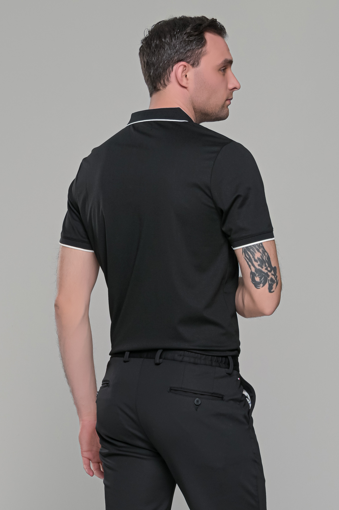 Ανδρικό μαύρο πόλο μπλουζάκι MS με κοντό μανίκι. Ο γιακάς και τα μανίκια έχουν λεπτομέρειες σε λευκό χρώμα. H γραμμή του είναι στενή (slim fit). Το ύφασμά του είναι από 45% βαμβάκι για να αναπνέει το δέρμα και 55% συνθετικό για να εφαρμόζει σε κάθε σώμα. Έχει μικρό σχέδιο στο στήθος και κλείνει με κουμπιά στον λαιμό. Το ύφασμα του έχει ειδική επεξεργασίας ούτως ώστε αν πλυθεί σε χαμηλές στροφές στο πλυντήριο (ή στο χέρι) και τεντωθεί καλά κατά το άπλωμα, να μην χρειάζεται καθόλου σίδερο. Το μαύρο πόλο μπλουζάκι MS με κοντό μανίκι και γιακά είναι πολύ λεπτό και ανάλαφρο, ιδανικός σύμμαχος κατά της ζέστης τους θερινούς μήνες. Φίνο και κομψό, ιδανικό για casual αλλά και βραδινά ντυσίματα, μιας και μπορεί να φορεθεί ακόμα και μέσα από σακάκι. Συνδυάζεται ιδανικά με παντελόνια, τζιν και βερμούδες.