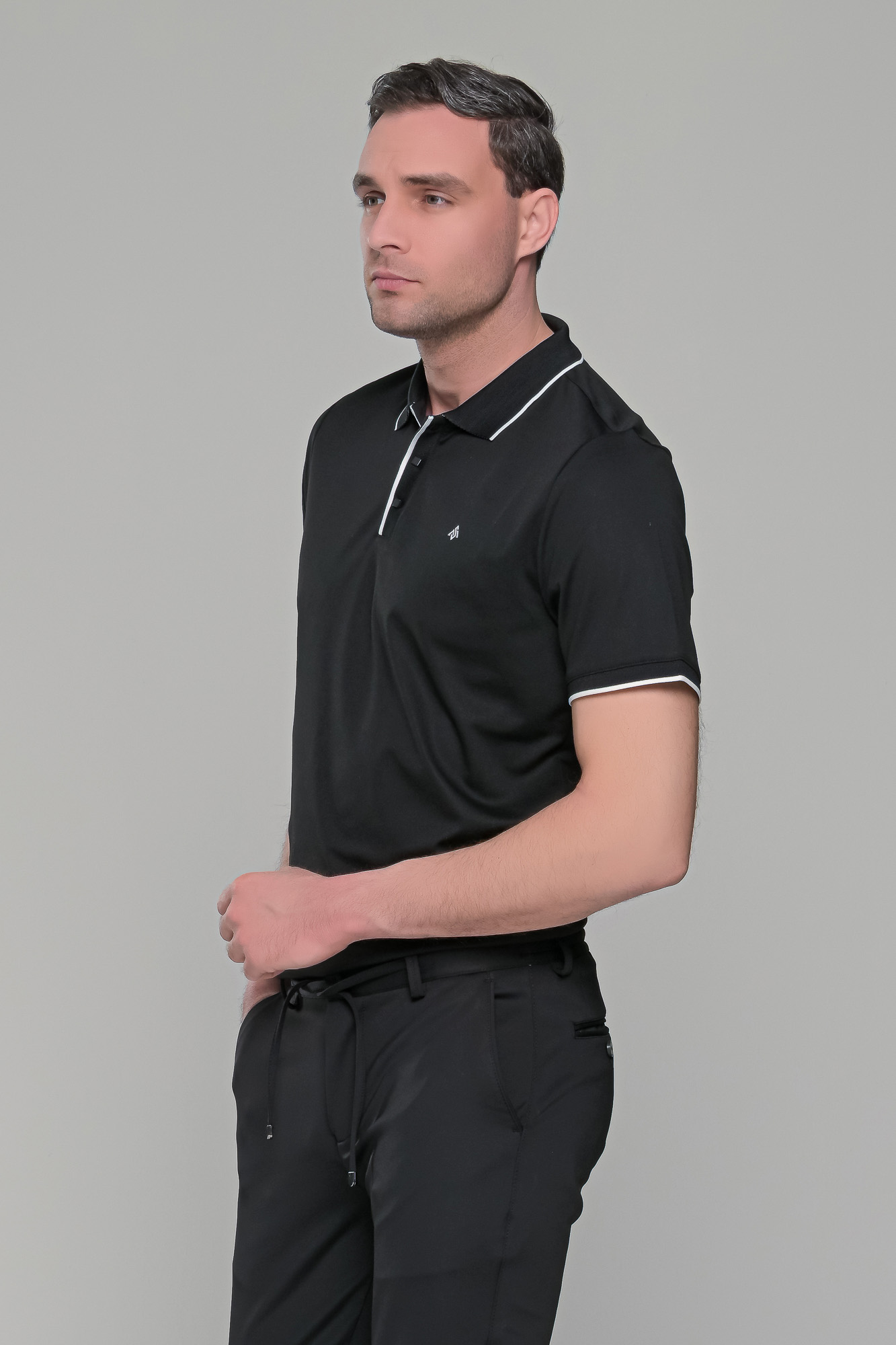Ανδρικό μαύρο πόλο μπλουζάκι MS με κοντό μανίκι. Ο γιακάς και τα μανίκια έχουν λεπτομέρειες σε λευκό χρώμα και στο στήθος κλείνει με κουμπιά. H γραμμή του είναι στενή (slim fit). Προτείνεται η αγορά ενός μεγέθους μεγαλύτερου από αυτό που φοράτε συνήθως, εκτός αν το θέλετε στενό επάνω σας, οπότε μπορείτε να επιλέξετε το μέγεθος που φοράτε συνήθως.
