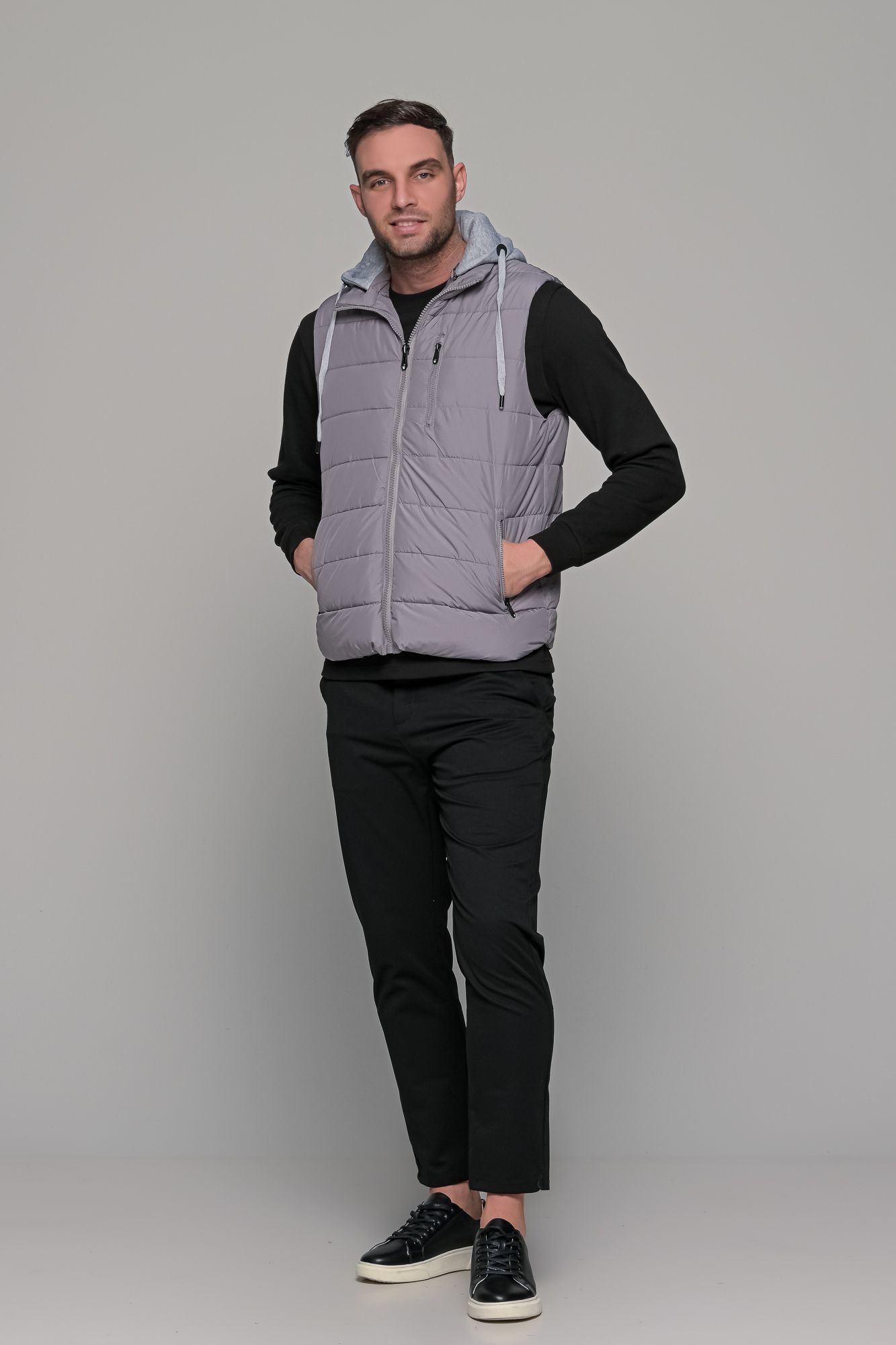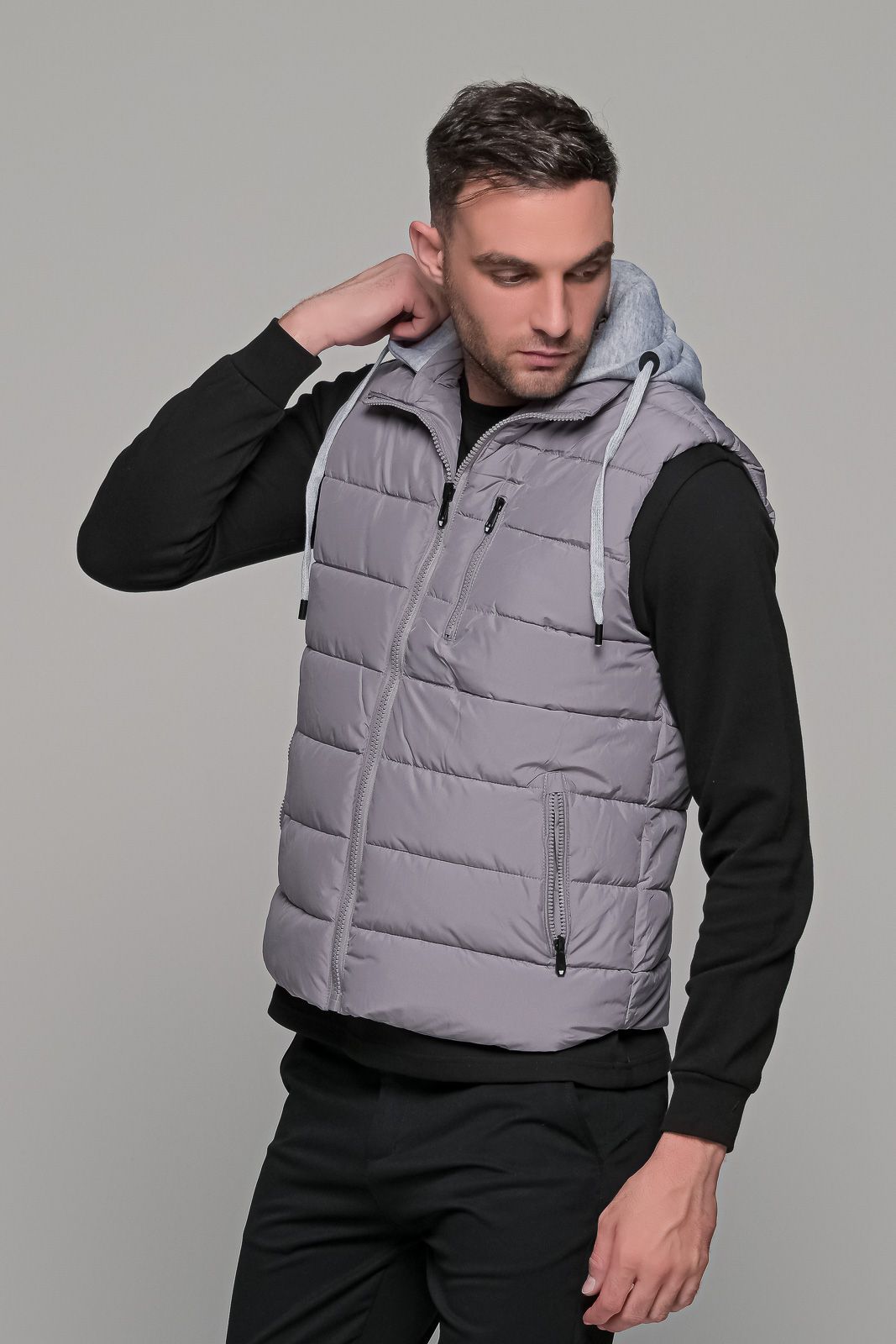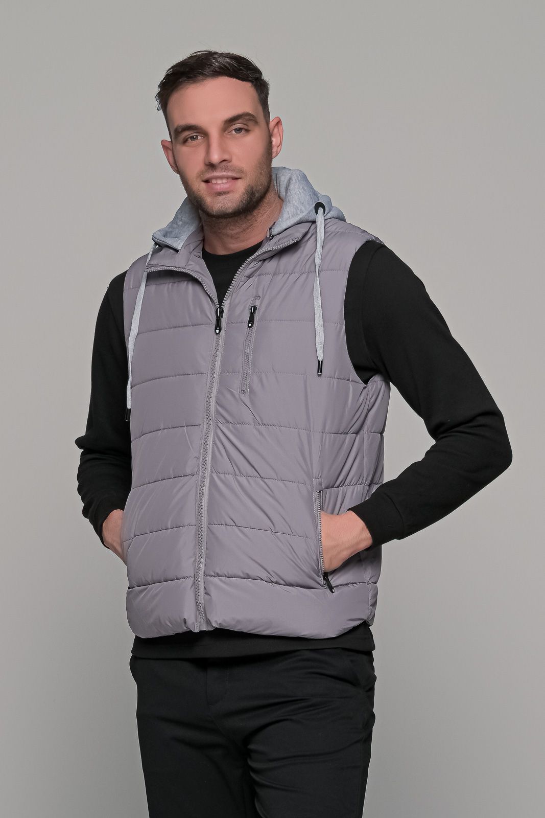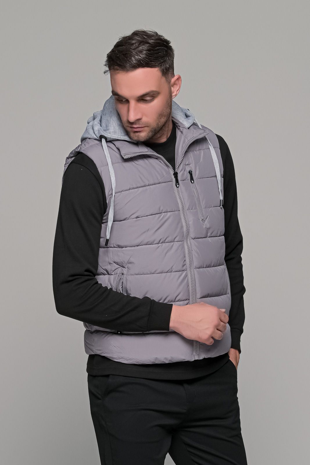 Γκρι αμάνικο ανδρικό μπουφάν γιλέκο PAPARAZZI με κουκούλα, κατάλληλο για όλες τις ώρες. Διαθέτει κουκούλα σε γκρι χρώμα η οποία μπορεί να αφαιρεθεί. Έχει δυο εξωτερικές τσέπες με φερμουάρ στο πλάι. Το ύφασμα του είναι naylon αδιάβροχο. Τα αμάνικα μπουφάν τύπου γιλέκο είναι η τελευταία τάση της μόδας τα τελευταία χρόνια, καθώς μπορεί να φορεθεί με πλεκτό ή φούτερ τους πιο κρύους μήνες ή ακόμα και με κοντομάνικο t-shirt την άνοιξη! Η γραμμή του είναι κανονική και η εφαρμογή του στενή (slim fit) οπότε προτείνεται η επιλογή του μεγέθους που φοράτε συνήθως.