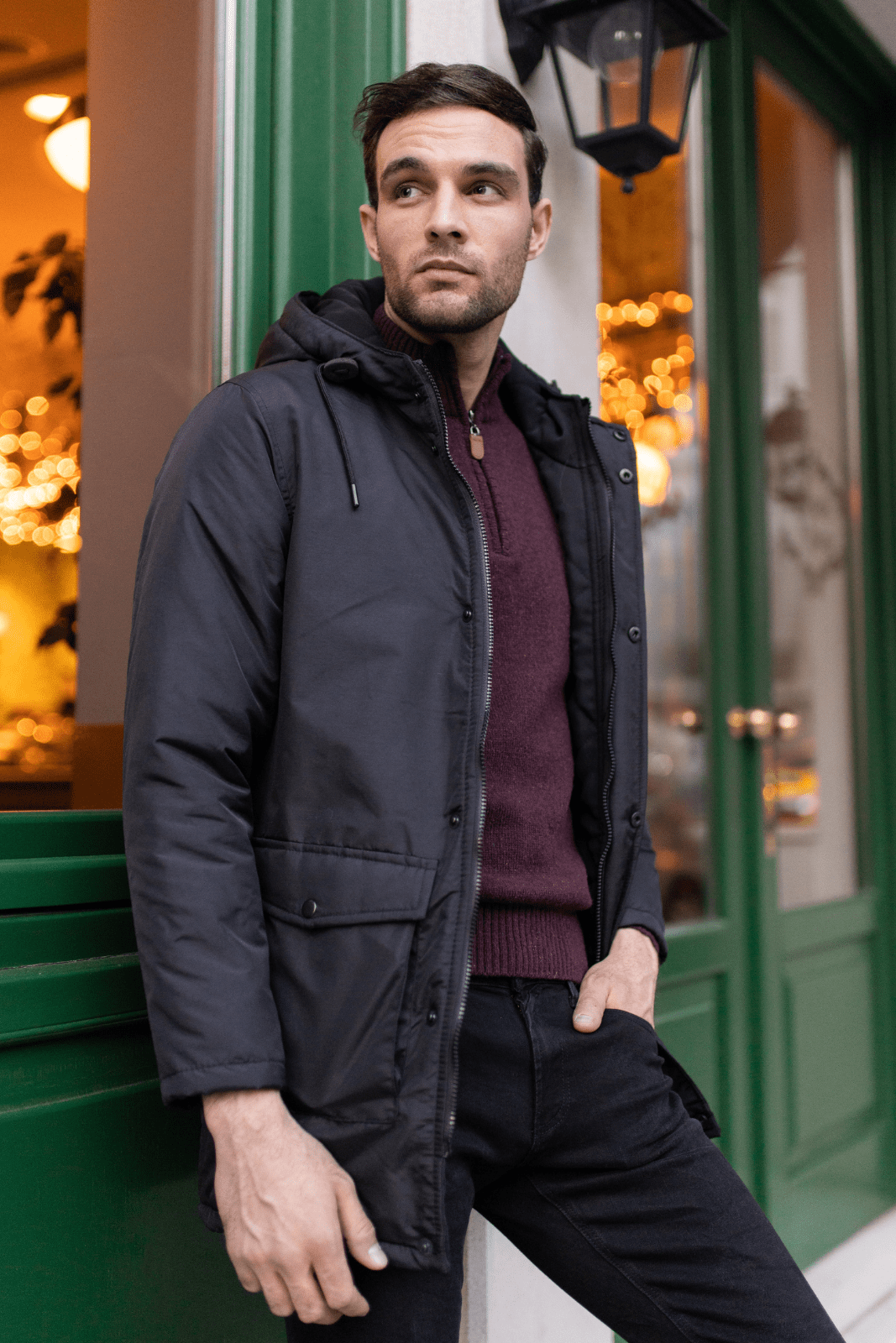 Μαύρο ανδρικό αδιάβροχο μπουφάν τύπου παρκά με  κουκούλα για κάθε μέρα. Η γραμμή του είναι κανονική (regular fit), οπότε επιλέγετε το μέγεθος που φοράτε συνήθως.