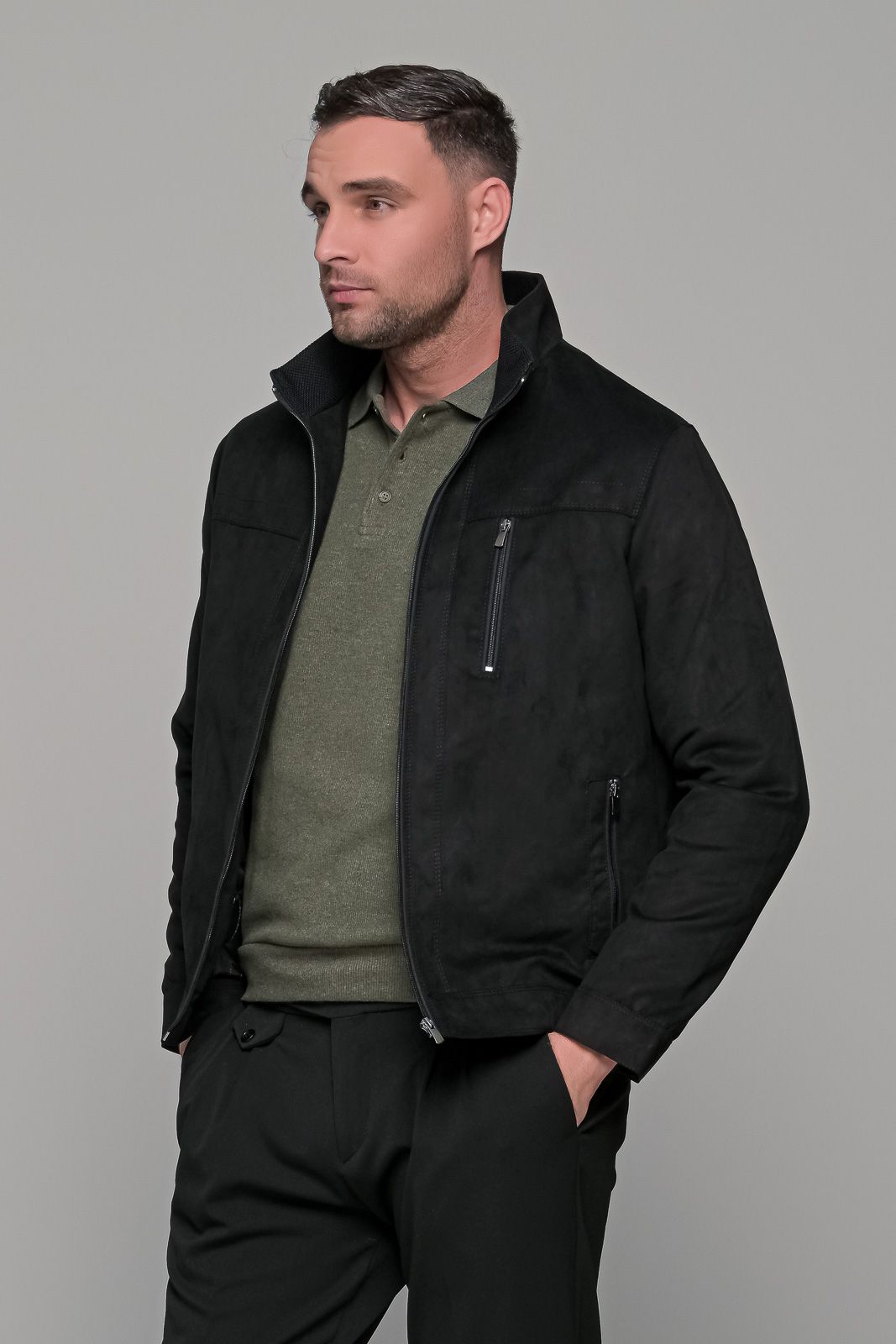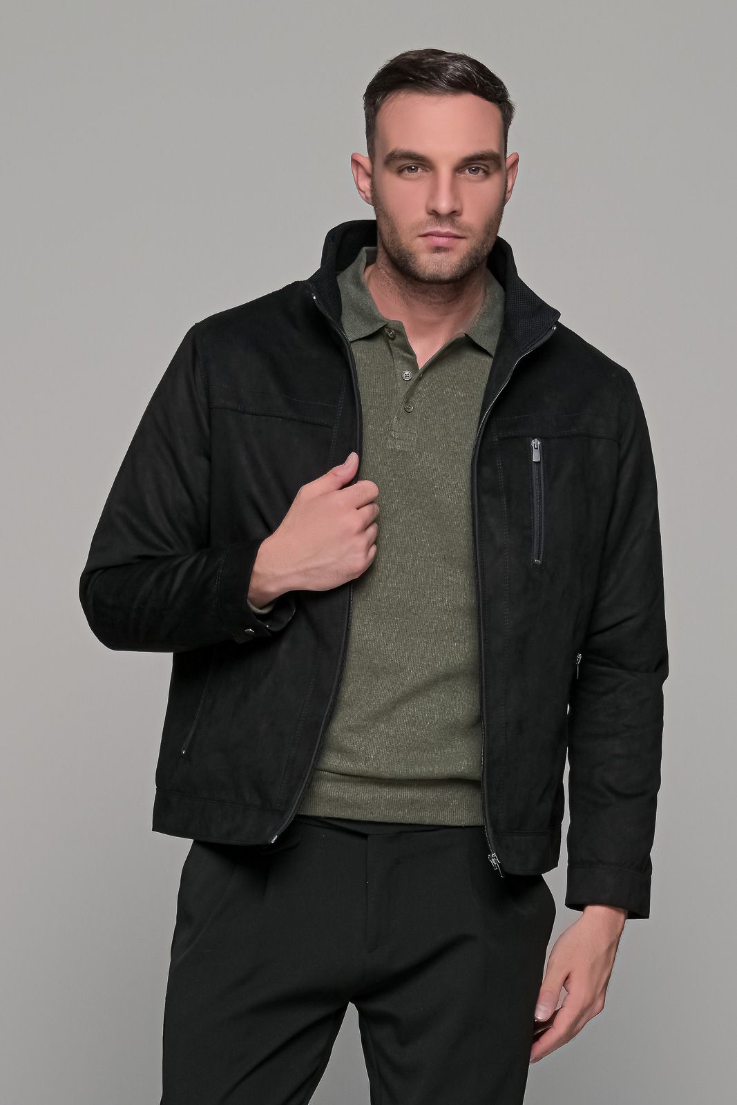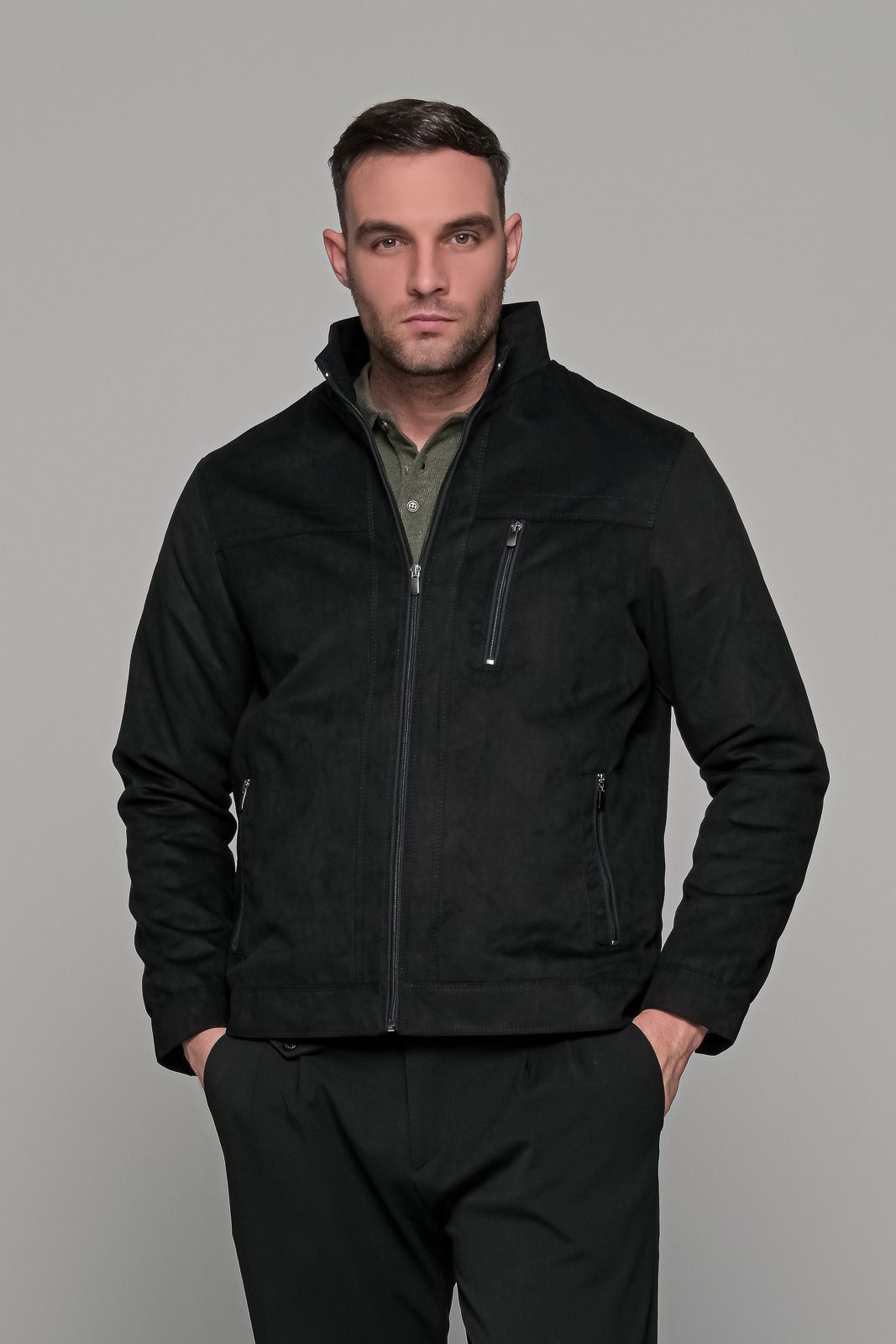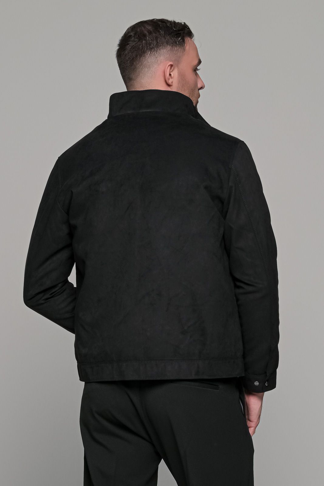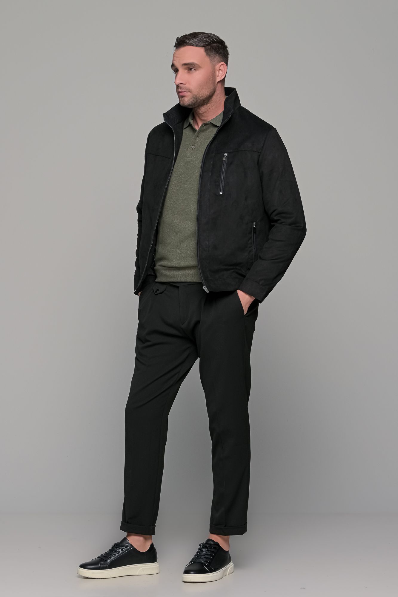 Μαύρο ανδρικό μπουφάν τύπου suede με ψηλό γιακά. Η γραμμή του είναι στενή (slim fit). Συστήνεται η αγορά ενός μεγέθους μεγαλύτερο από αυτό που φοράτε συνήθως.
