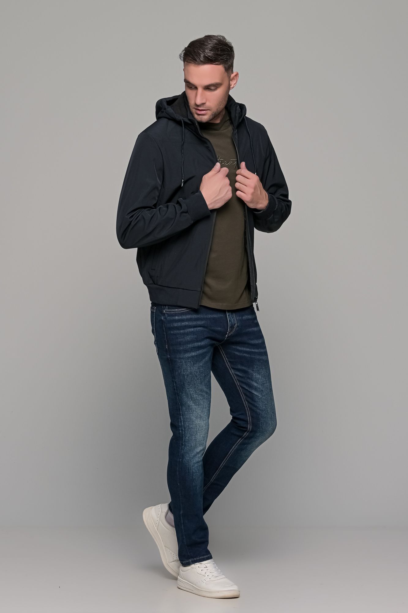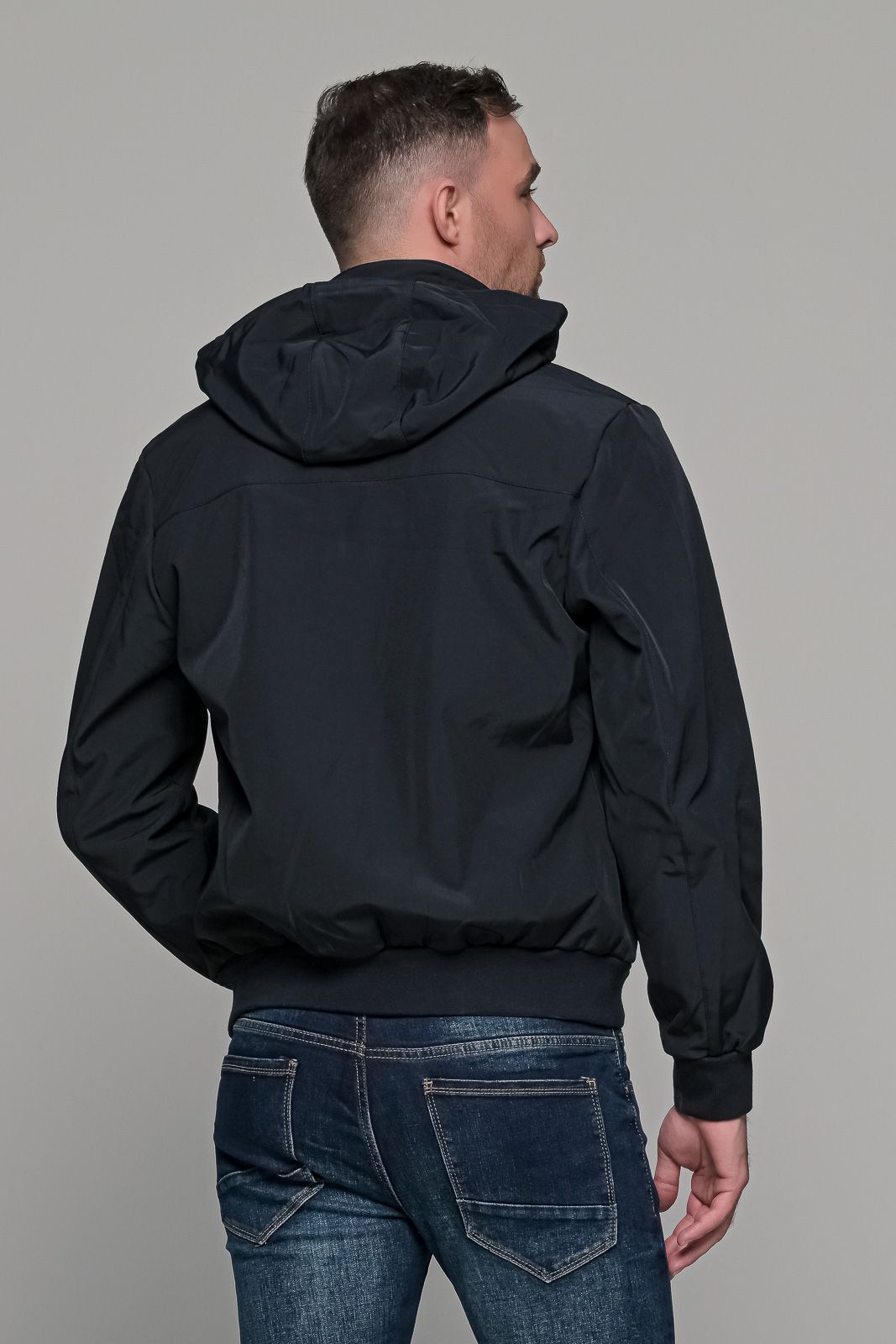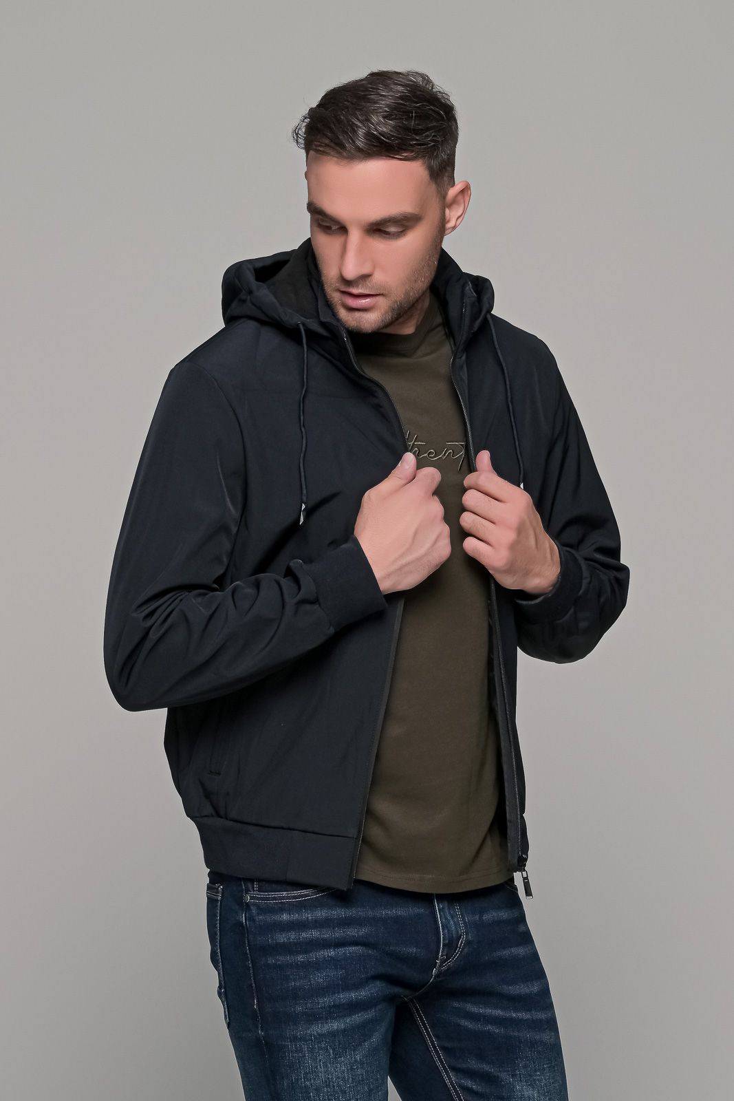 Navy φθινοπωρινό αδιάβροχο ανδρικό κοντό bomber μπουφάν με κουκούλα που αφαιρείται. Η γραμμή του είναι στενή (slim fit). Συστήνεται η αγορά ενός μεγέθους μεγαλύτερο από αυτό που φοράτε συνήθως.