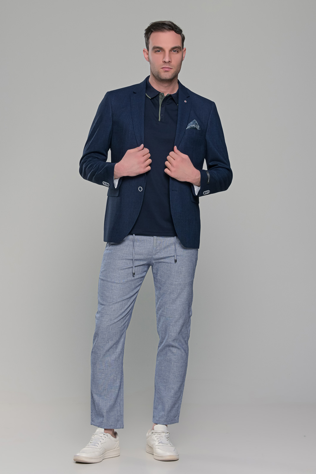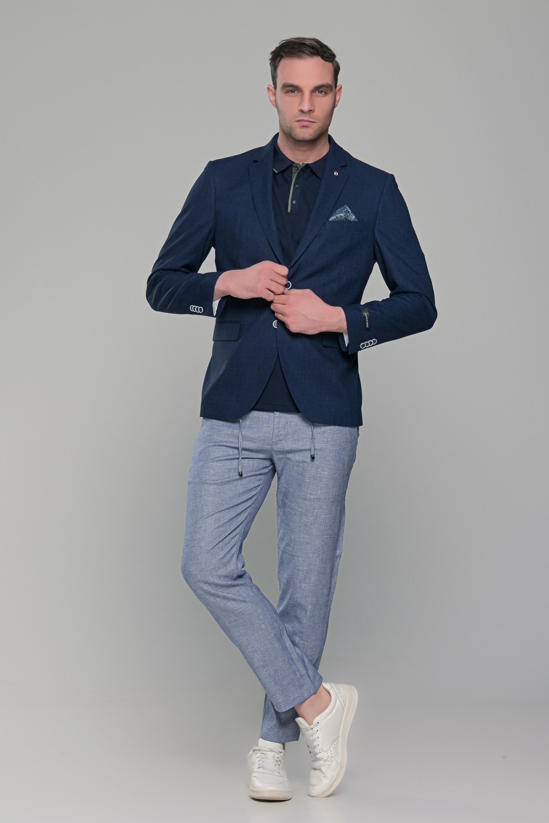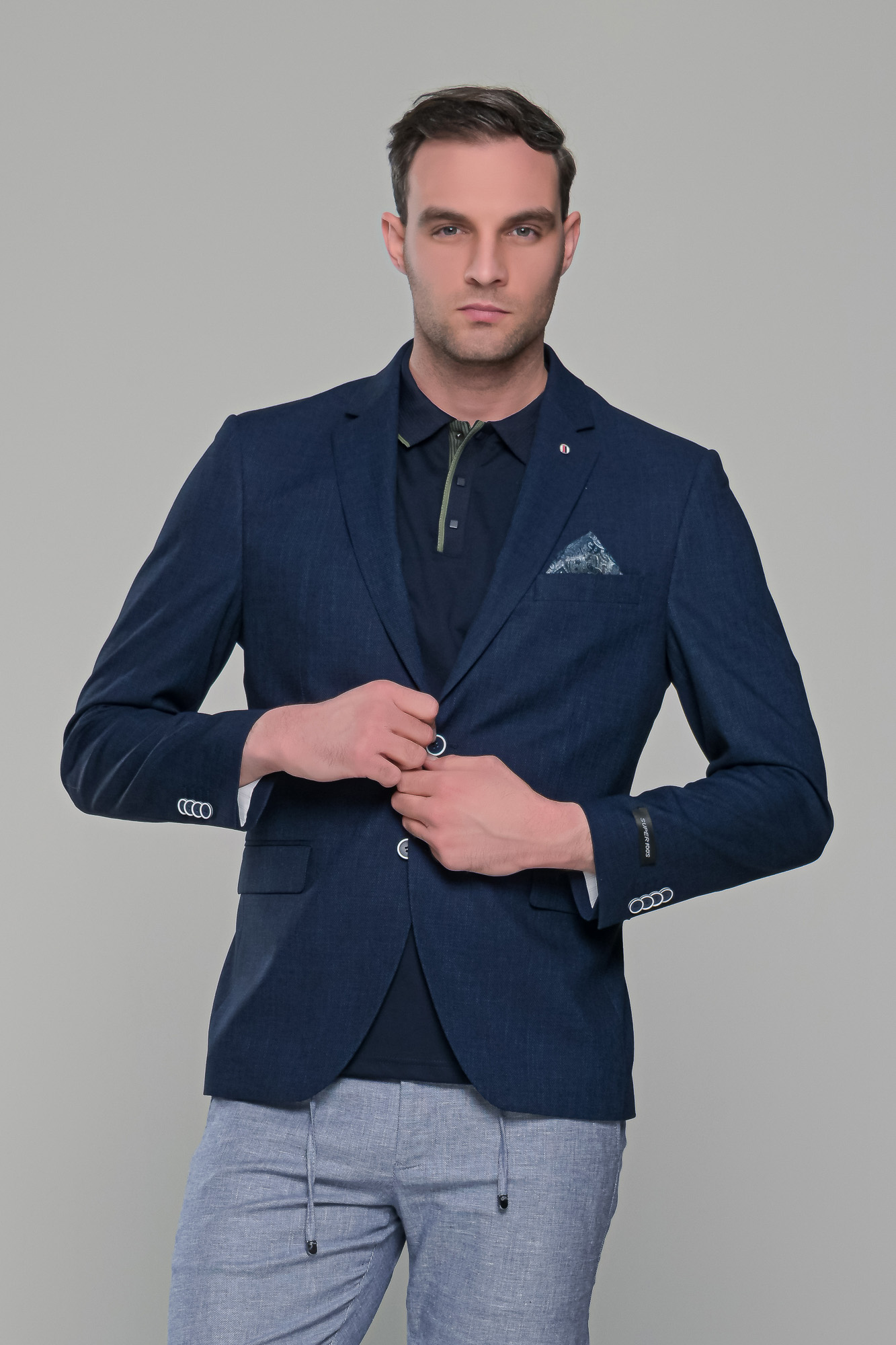 Λινό σκούρο μπλε navy ανδρικό σακάκι καλοκαιρινό. Κατασκευάζετε από 50% λινό, κατάλληλο για τους καλοκαιρινούς μήνες, σε συνδυασμό με 48% συνθετικό για να είναι ακόμη πιο δροσερό, ενώ διαθέτει και λίγο ελαστικό 2%, υλικό που το κάνει να προσαρμόζει άνετα επάνω στο σώμα σας. Έχει δυο πλαϊνές εξωτερικές τσέπες που κλείνουν με καπάκι ενώ διαθέτει και καρφίτσα στο πέτο. Επίσης, έχει δυο ανοίγματα πίσω, τα οποία είναι ραμμένα και τα ανοίγετε μετά την αγορά. Το τσεπάκι που έχει στο στήθος διαθέτει ειδική φόδρα από μέσα ώστε να γίνεται και μαντιλάκι. Το λινό σκούρο μπλε navy ανδρικό σακάκι μπορείτε να το φορέσετε με λεπτό t-shirt ή πόλο για πιο casual εμφανίσεις είτε με πουκάμισο για βραδινές εξόδους. Έχει στενή γραμμή (slim fit) και κανονική εφαρμογή οπότε συστήνεται η αγορά του μεγέθους που φοράτε συνήθως στα σακάκια και στα κοστούμια.