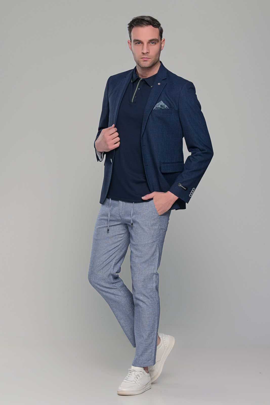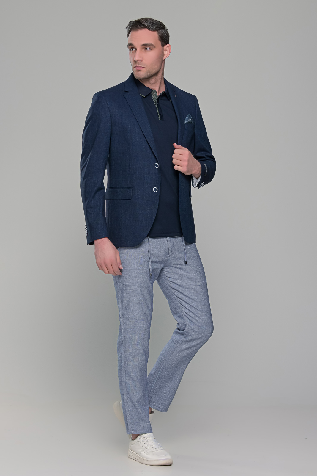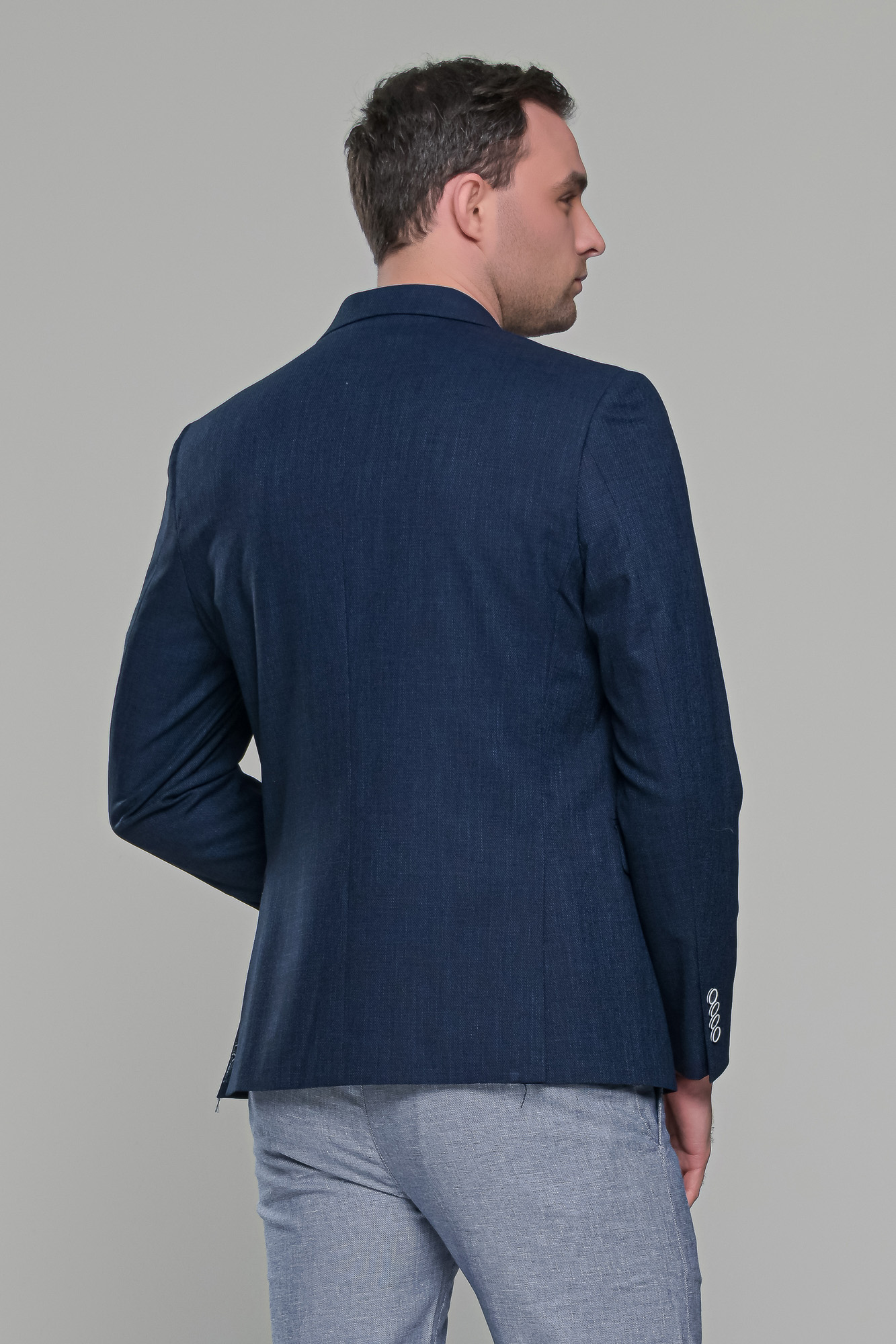 Ανδρικό λινό σακάκι σε σκούρο μπλε navy χρώμα κατάλληλο για το καλοκαίρι. Η γραμμή του είναι κανονική και η εφαρμογή του είναι στενή (slim fit) οπότε συστήνεται η αγορά του μεγέθους που φοράτε συνήθως στα σακάκια και στα κοστούμια.