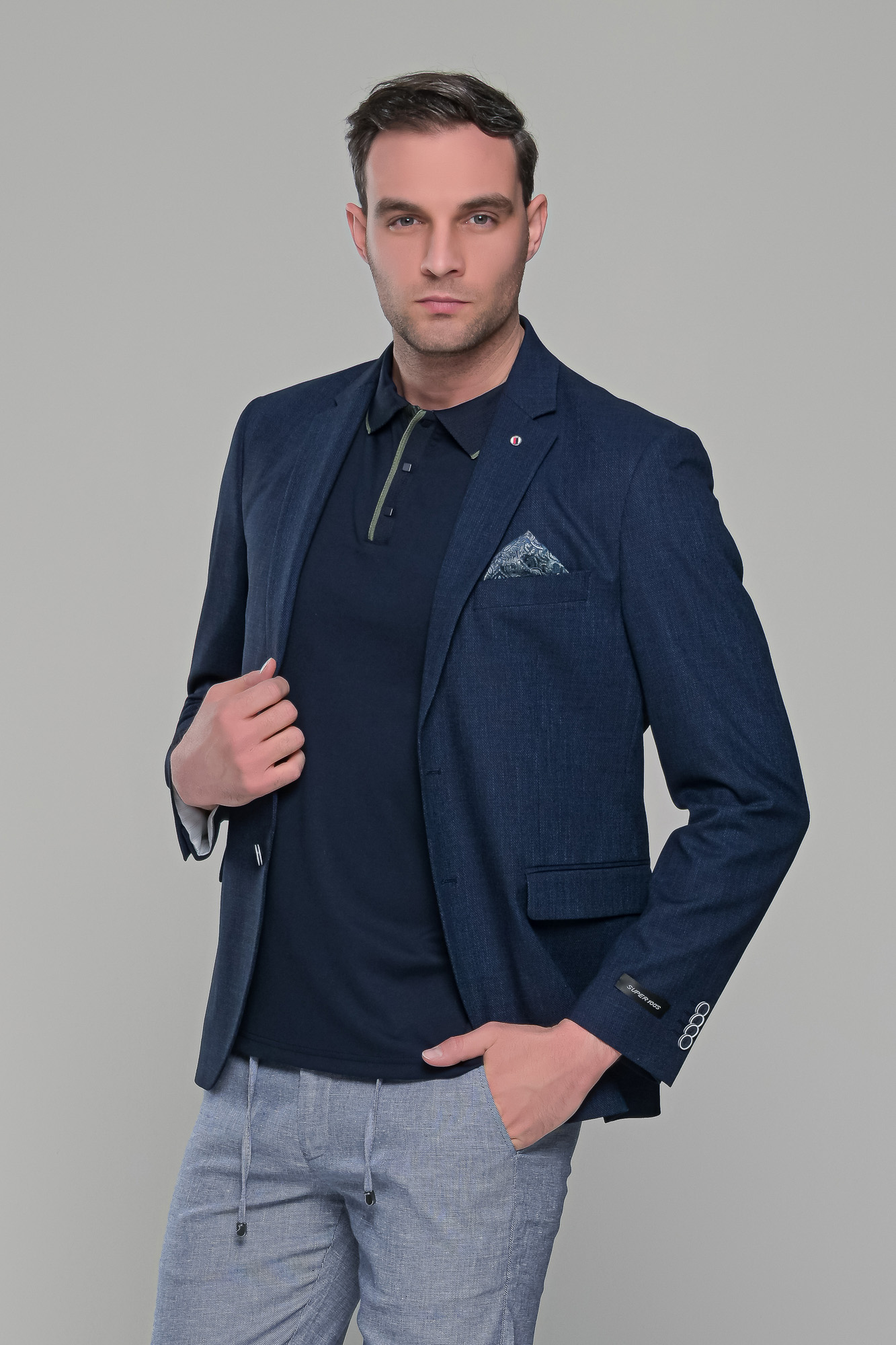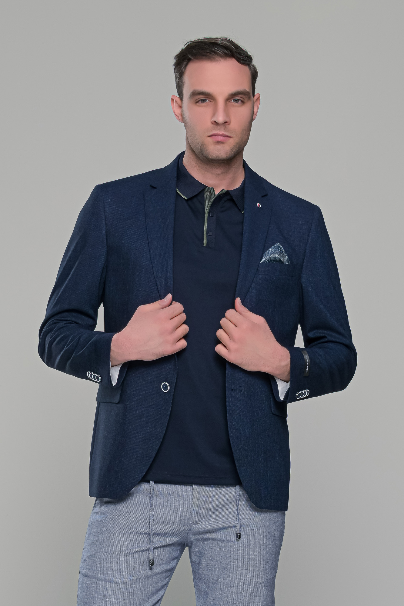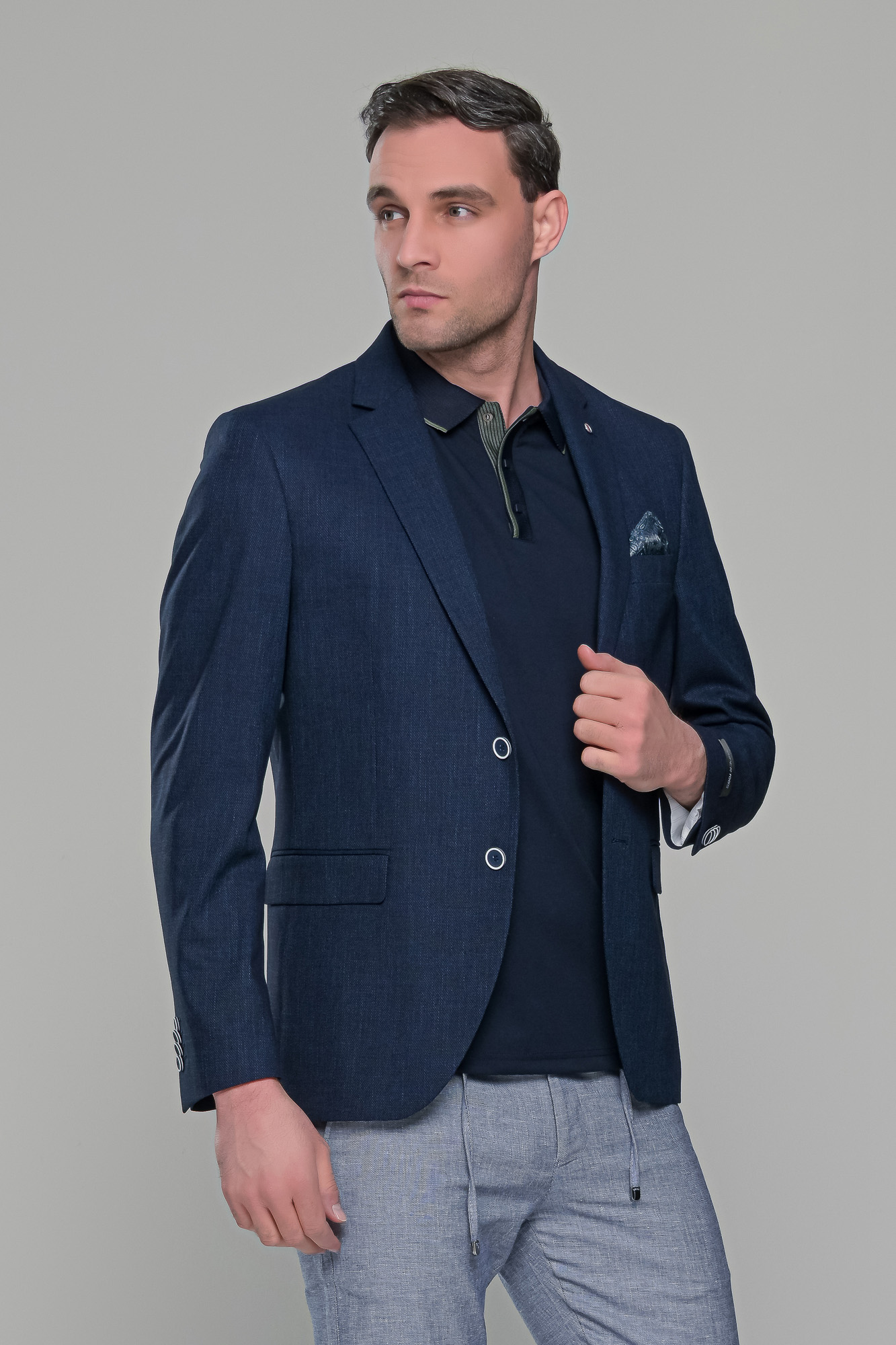 Ανδρικό λινό σακάκι σε σκούρο μπλε navy χρώμα κατάλληλο για το καλοκαίρι. Η γραμμή του είναι κανονική και η εφαρμογή του είναι στενή (slim fit) οπότε συστήνεται η αγορά του μεγέθους που φοράτε συνήθως στα σακάκια και στα κοστούμια.