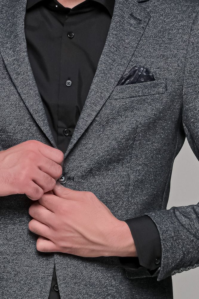 Γκρι ανθρακί ανδρικό χειμερινό σακάκι. Η ύφανση του είναι λεία και απαλή. Το ύφασμα του είναι μαλλί με συνθετικό και ελαστικό, ενώ το βάρος του το καθιστά κατάλληλο για τους χειμερινούς μήνες. Έχει δυο πλαϊνές εξωτερικές τσέπες που κλείνουν με καπάκι και αφαιρούμενη καρφίτσα στην κουμπότρυπα στο πέτο. Έχει δυο ανοίγματα πίσω, τα οποία είναι ραμμένα και ανοίγουν μετά την αγορά. Το τσεπάκι του στο στήθος έχει ειδική φόδρα από μέσα ώστε να γίνεται και μαντιλάκι. Το Γκρι ανθρακί ανδρικό χειμερινό σακάκι μπορεί να φορεθεί με λεπτό βαμβακερό πλεκτό ή ζιβάγκο για πιο casual εμφανίσεις είτε με πουκάμισο για βραδινές εξόδους. Έχει στενή γραμμή (slim fit) και κανονική εφαρμογή οπότε συστήνεται η αγορά του μεγέθους που φοράτε συνήθως στα σακάκια και στα κοστούμια.