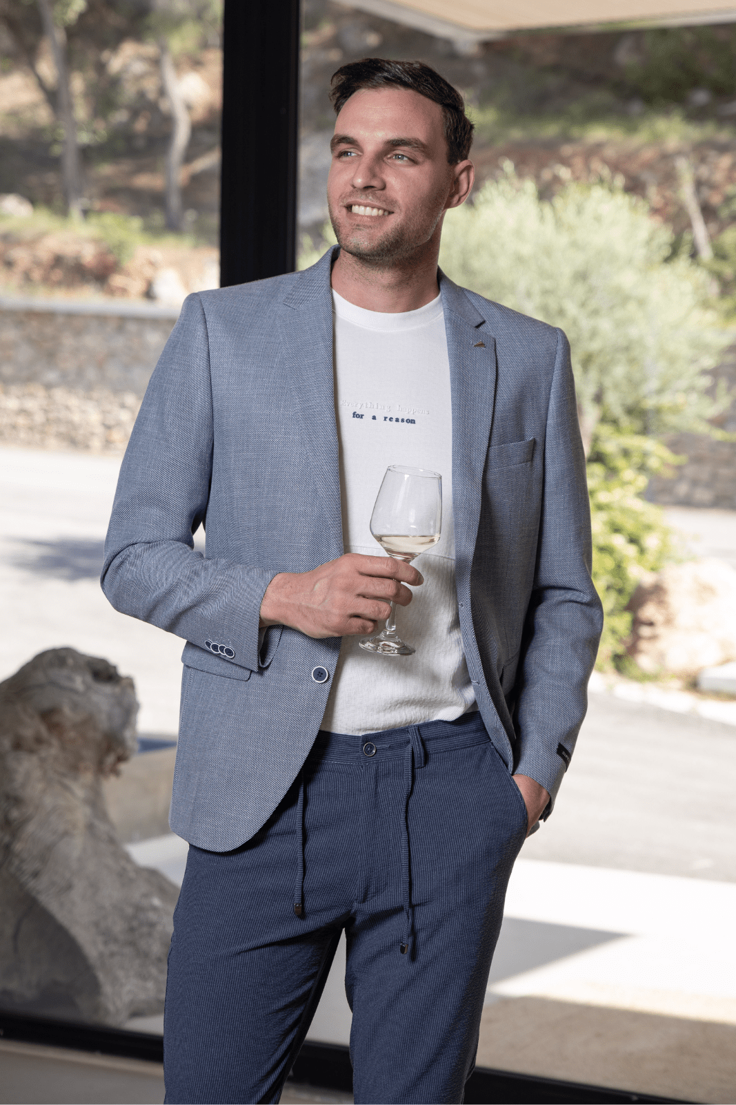 Ανδρικό σακάκι καλοκαιρινό με δίχρωμη πλέξη σε γκρι σιελ χρώμα. Η γραμμή του είναι κανονική και η εφαρμογή του είναι στενή (slim fit) οπότε συστήνεται η αγορά του μεγέθους που φοράτε συνήθως στα σακάκια και στα κοστούμια.