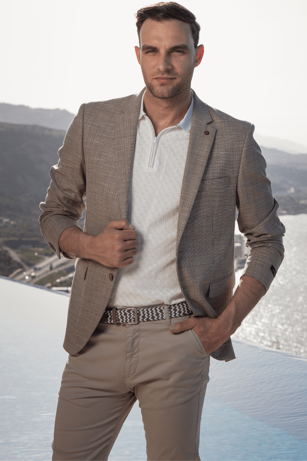 Ανδρικό σακάκι καλοκαιρινό με σχέδιο στην ύφανση σε μπεζ χρώμα. Η γραμμή του είναι κανονική και η εφαρμογή του είναι στενή (slim fit) οπότε συστήνεται η αγορά του μεγέθους που φοράτε συνήθως στα σακάκια και στα κοστούμια.