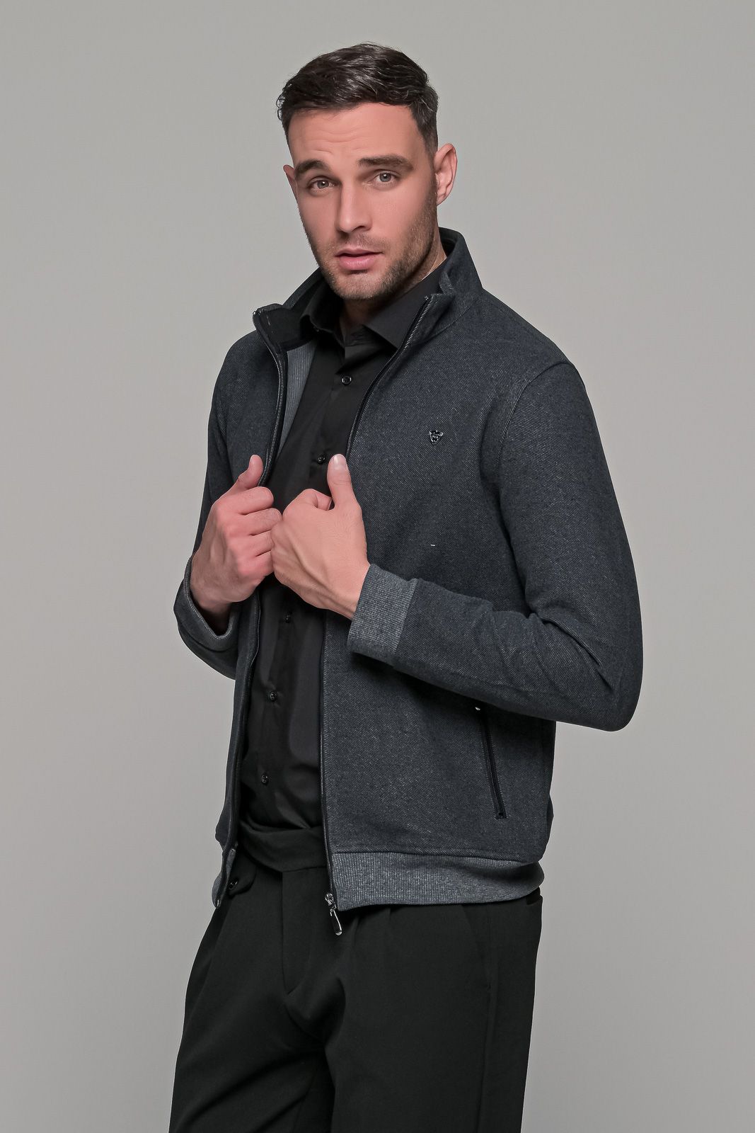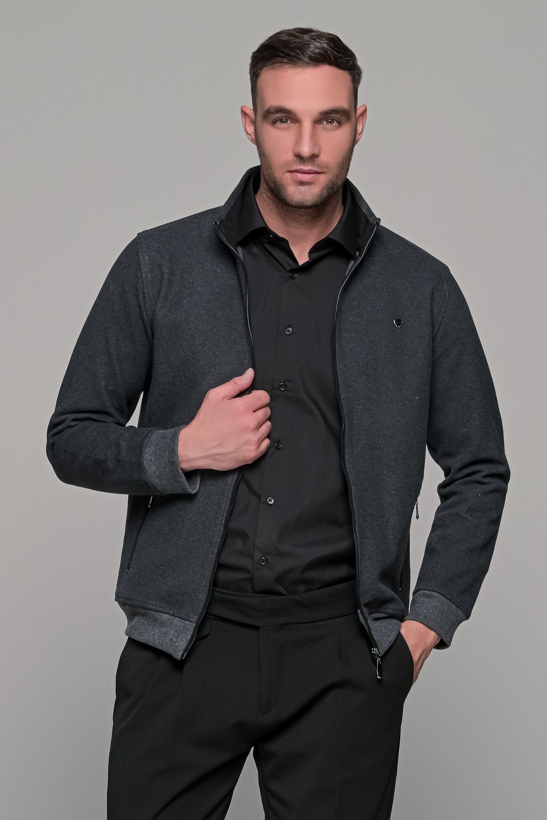 Γκρι ανθρακί ανδρική ζακέτα MS με τσέπες και διακριτικό μαύρο σχέδιο στο φερμουάρ. Η σύνθεση της είναι συνδυασμός από βαμβάκι και συνθετικό έτσι ώστε το ρούχο να είναι μαλακό, ανθεκτικό και να αφήνει το δέρμα να αναπνέει. Έχει δυο πλαϊνές εξωτερικές τσέπες που κλείνουν με φερμουάρ ενώ ο γιακάς της είναι όρθιος, τύπου λουπέτο. Διαθέτει λάστιχο στο τελείωμα και στα μανίκια για καλύτερη εφαρμογή. Έχει διακριτικό μεταλλικό λογότυπο στο στήθος. Μπορεί να φορεθεί με μπλουζάκι μακρυμάνικο ή με λεπτό βαμβακερό πλεκτό για πιο casual εμφανίσεις είτε με ένα πουκάμισο για βραδινές εξόδους. Η γραμμή της, όπως και η εφαρμογή της, είναι στενή (slim fit) οπότε συστήνεται η αγορά ενός μεγέθους μεγαλύτερου από το σύνηθες μέγεθος σας.