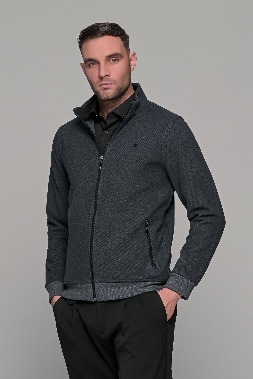 Γκρι ανθρακί ανδρική ζακέτα με τσέπες και διακριτική μαύρη λεπτομέρεια στο φερμουάρ. Η γραμμή της, όπως και η εφαρμογή της, είναι στενή (slim fit) οπότε συστήνεται η αγορά ενός μεγέθους μεγαλύτερου από το σύνηθες μέγεθος σας.
