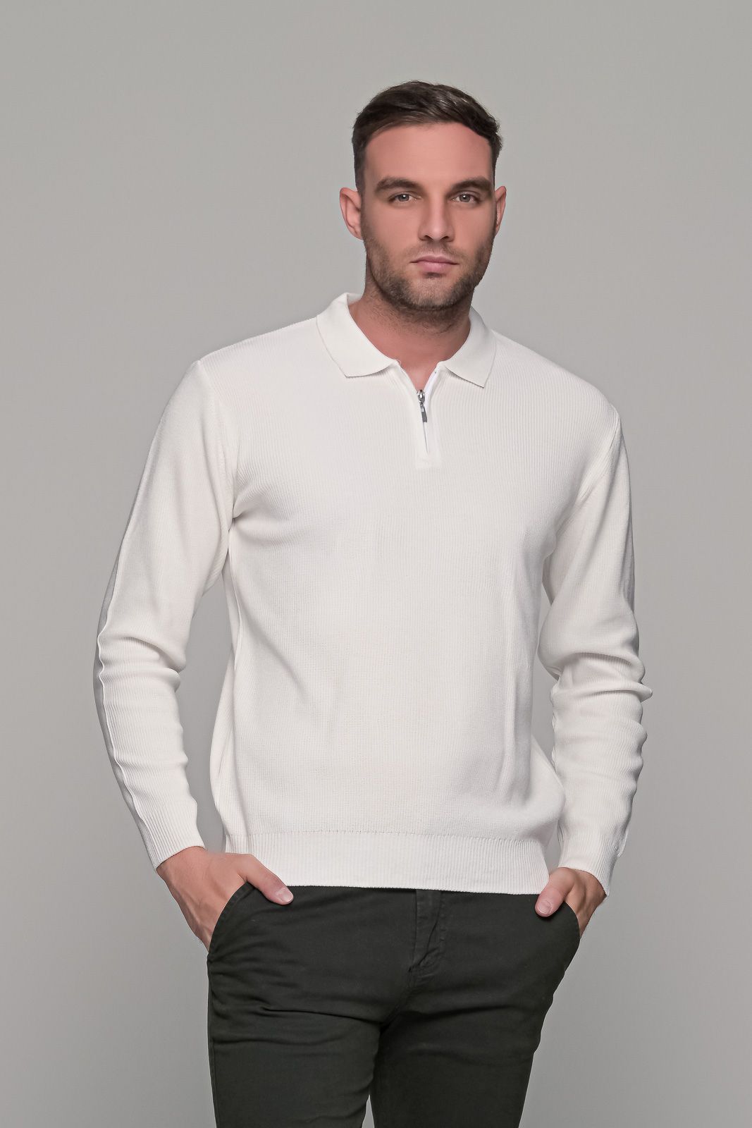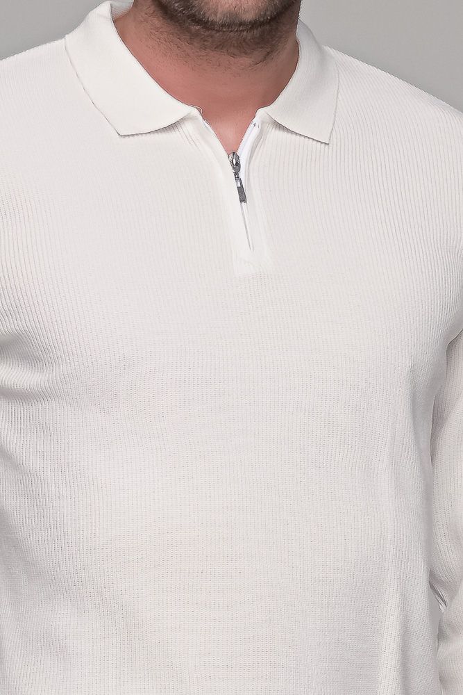 Λευκό ανδρικό πλεκτό μπλουζάκι με φερμουάρ στο γιακά. Έχει διακριτική πλέξη τύπου ρίγα μονόχρωμη. Η γραμμή του είναι κανονική (normal fit) ενώ η εφαρμογή της είναι άνετη (loose fit).