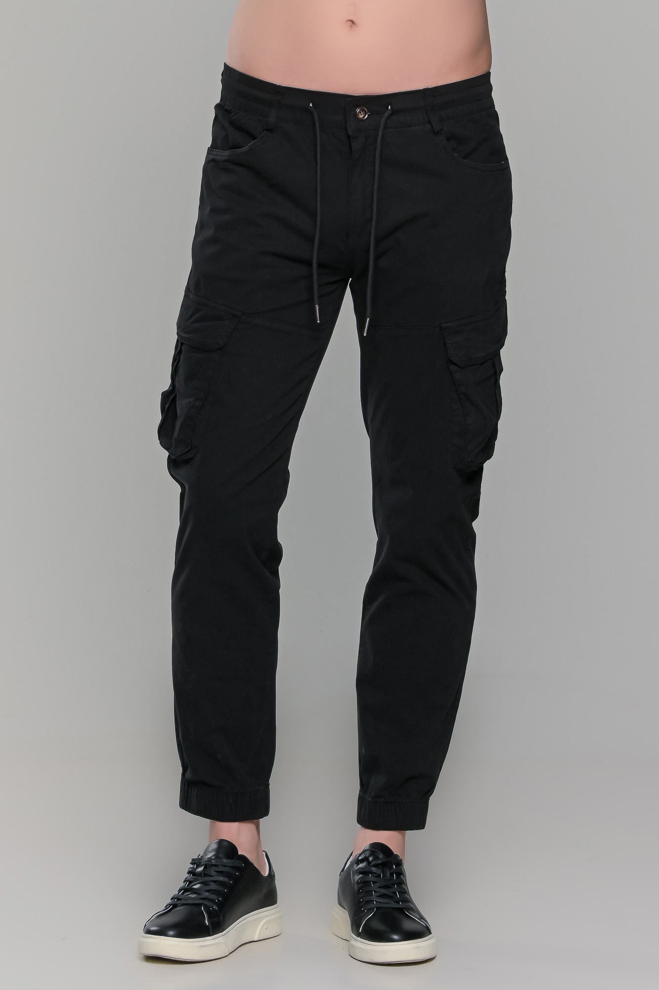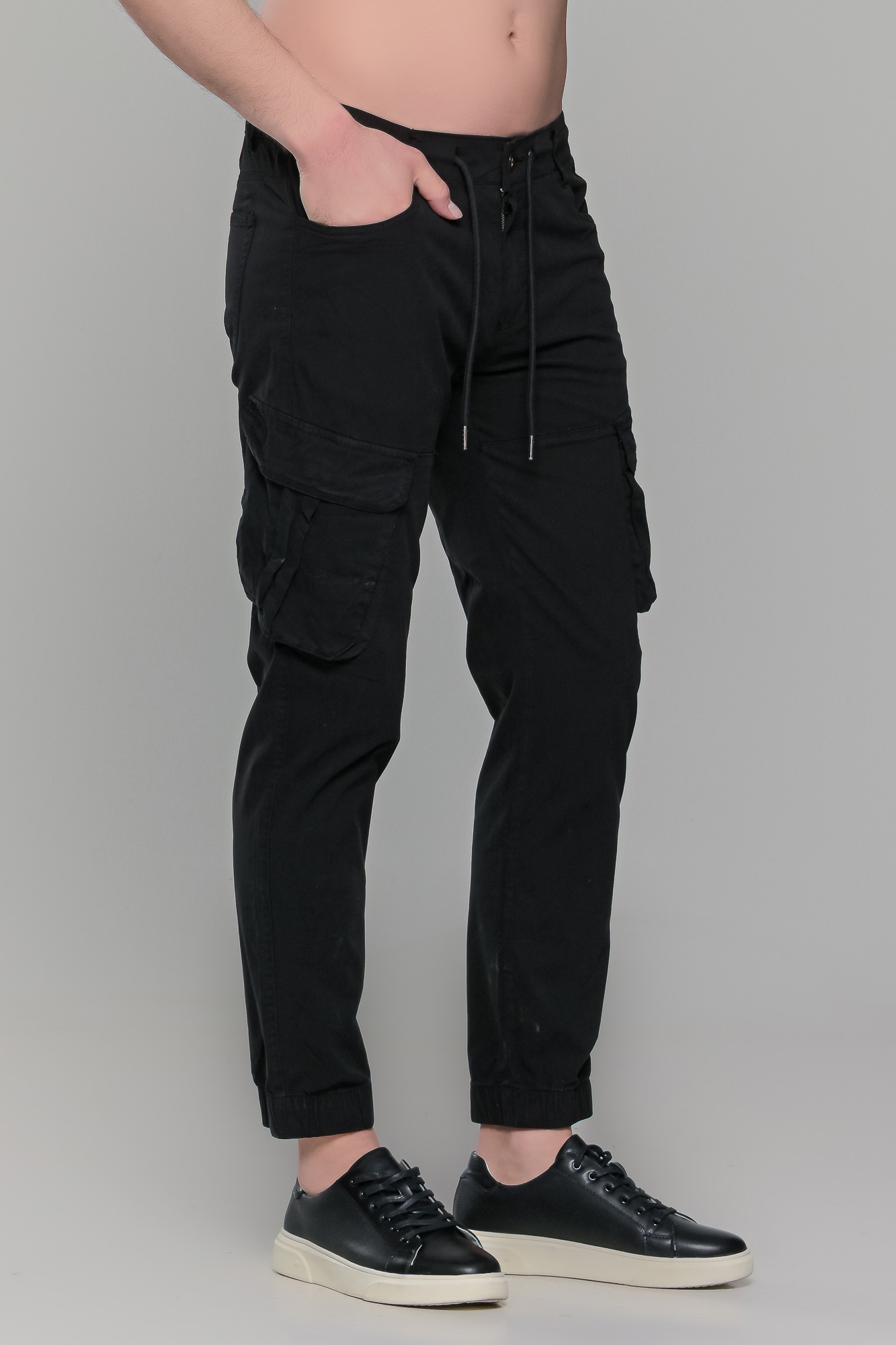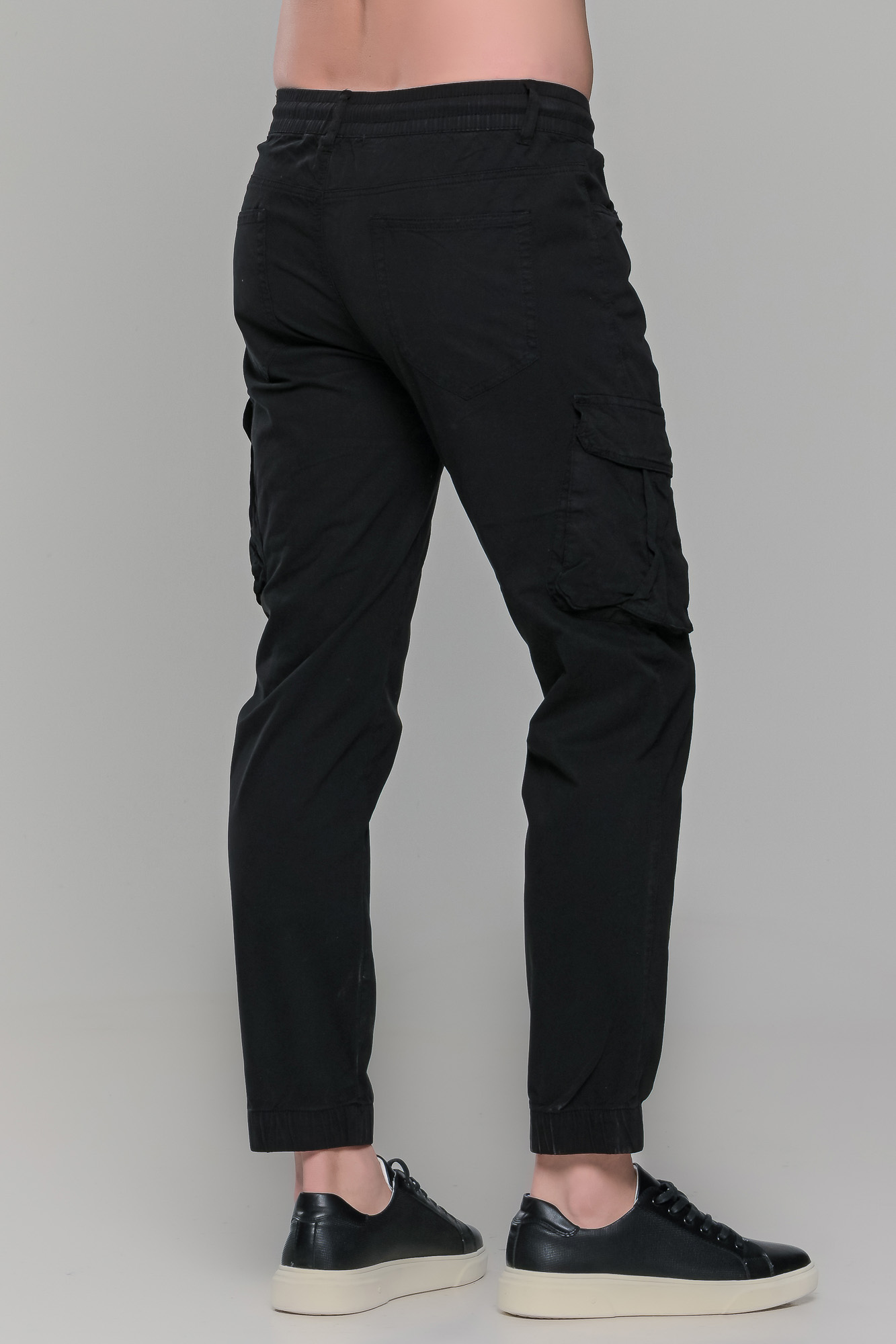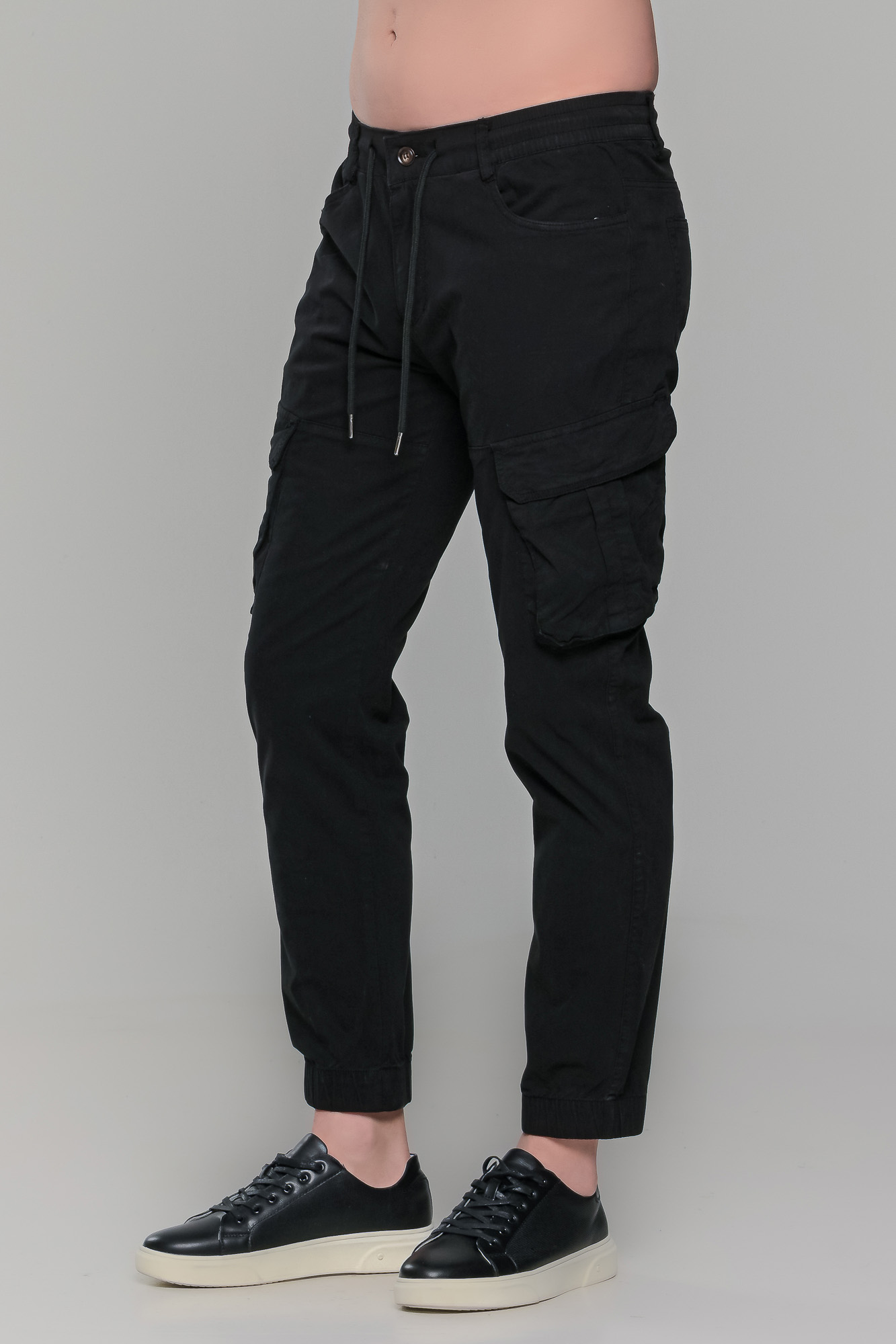 Μαύρο cargo ανδρικό καλοκαιρινό παντελόνι με τσέπες και λάστιχο. Η γραμμή του είναι στενή (slim fit), ενώ τα μεγέθη του είναι κανονικά, οπότε επιλέγετε το μέγεθος που φοράτε συνήθως στα παντελόνια ή τα τζιν σας.