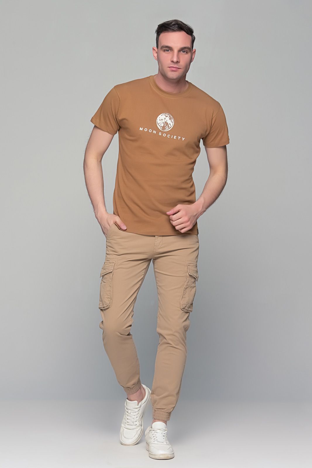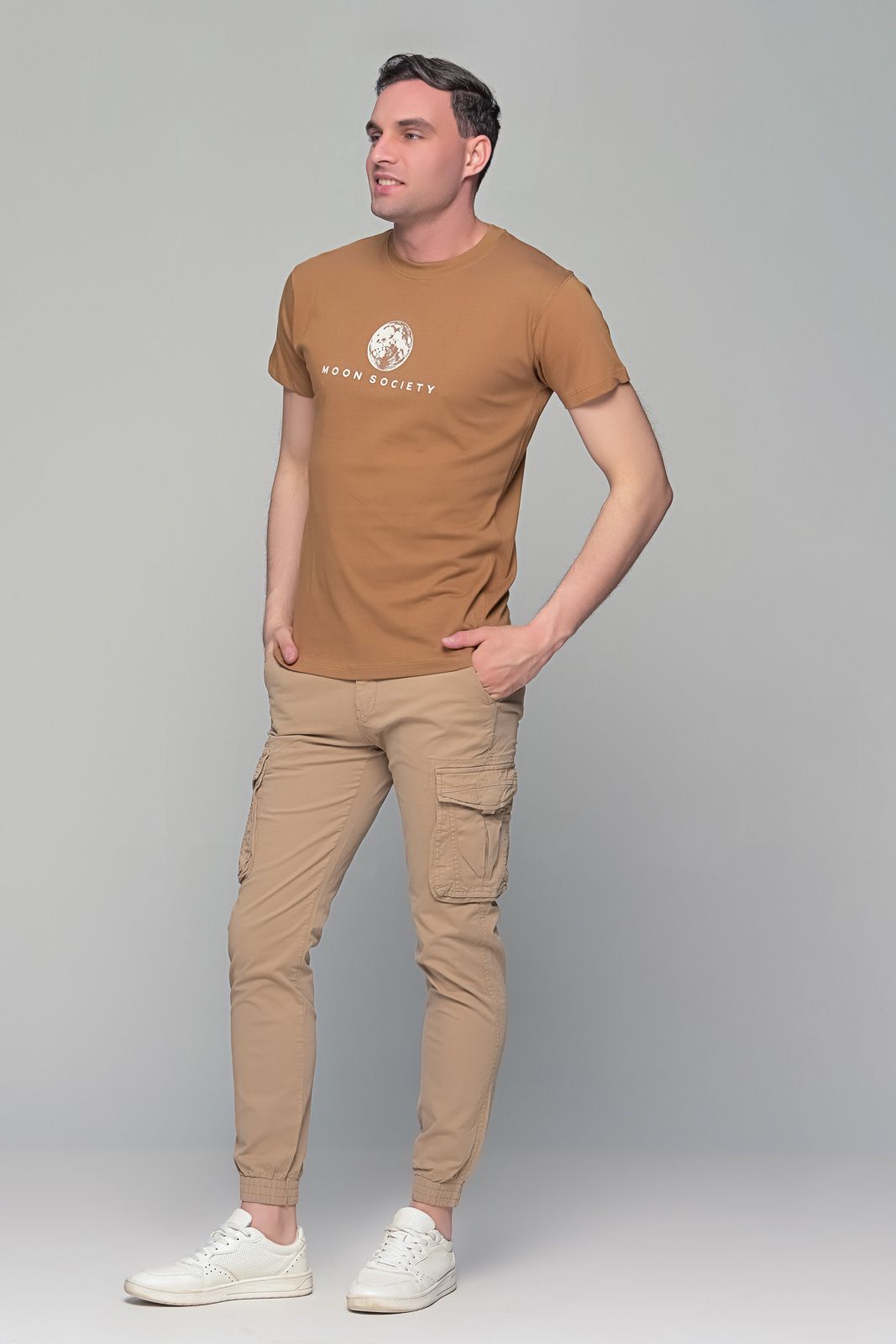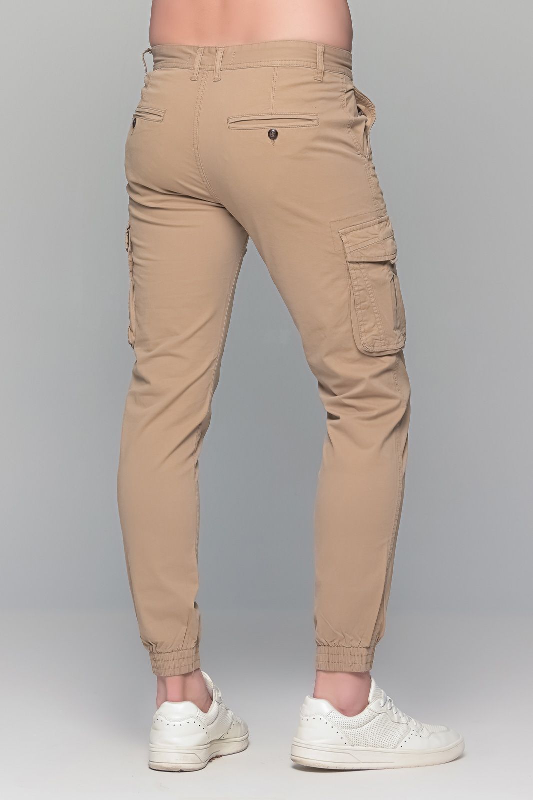 Casual ανδρικό παντελόνι cargo με τσέπες και λάστιχο σε μπεζ χρώμα. Η γραμμή του είναι στενή (slim fit), ενώ τα μεγέθη του είναι κανονικά, οπότε επιλέγετε το μέγεθος που φοράτε συνήθως στα παντελόνια ή τα τζιν σας.
