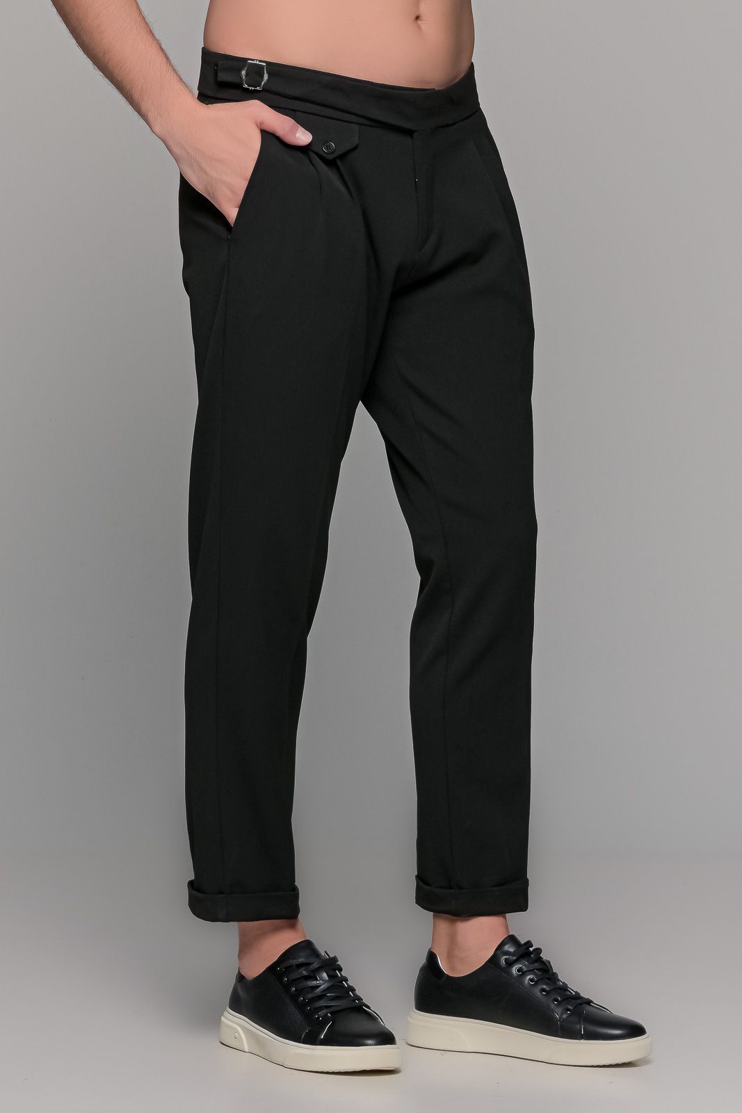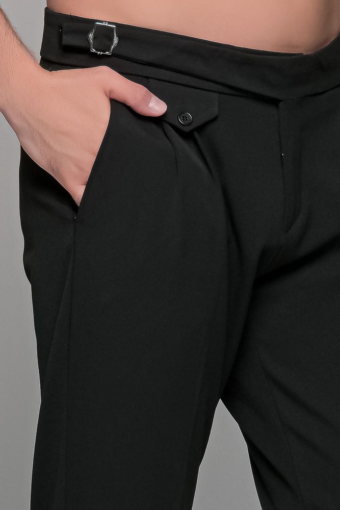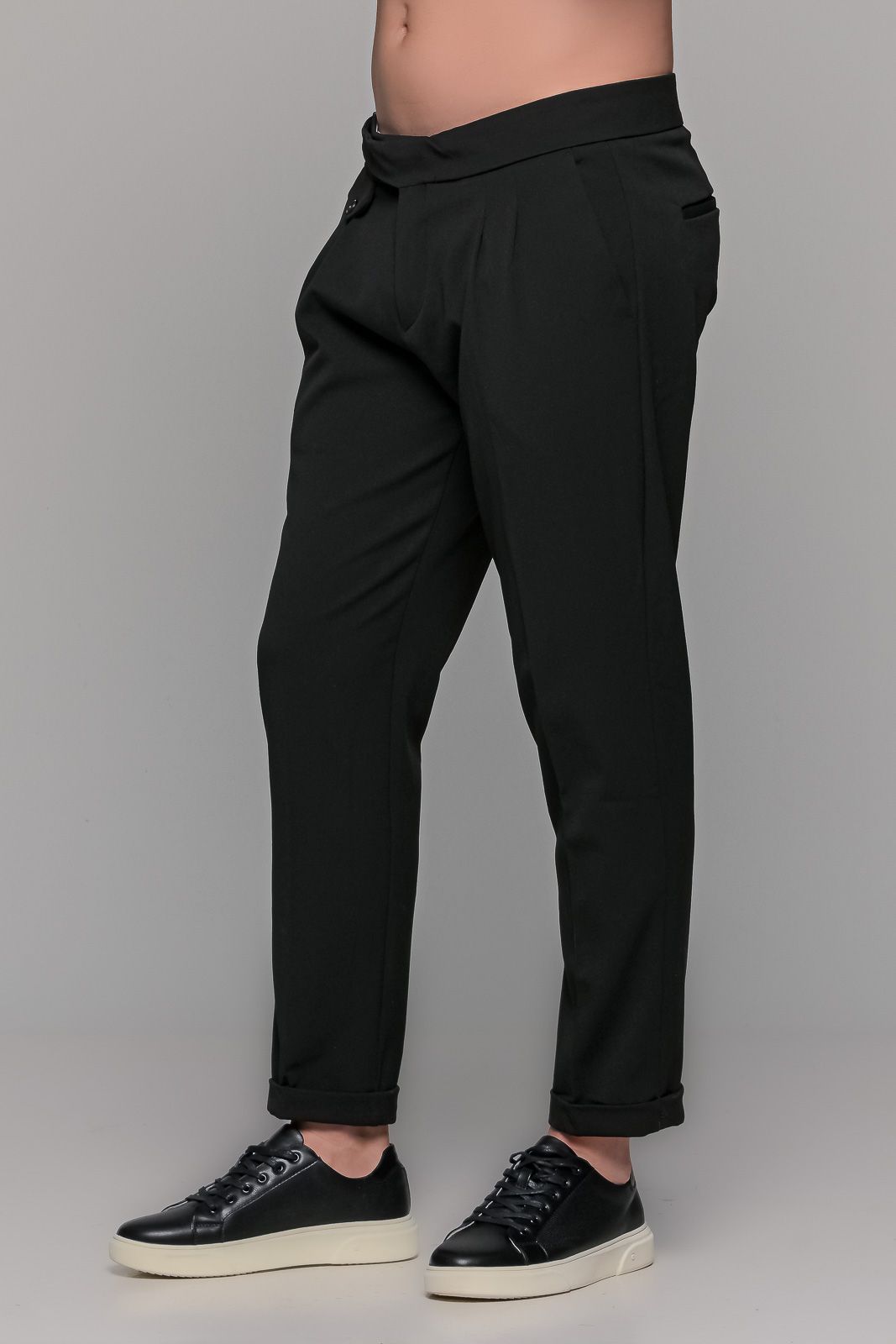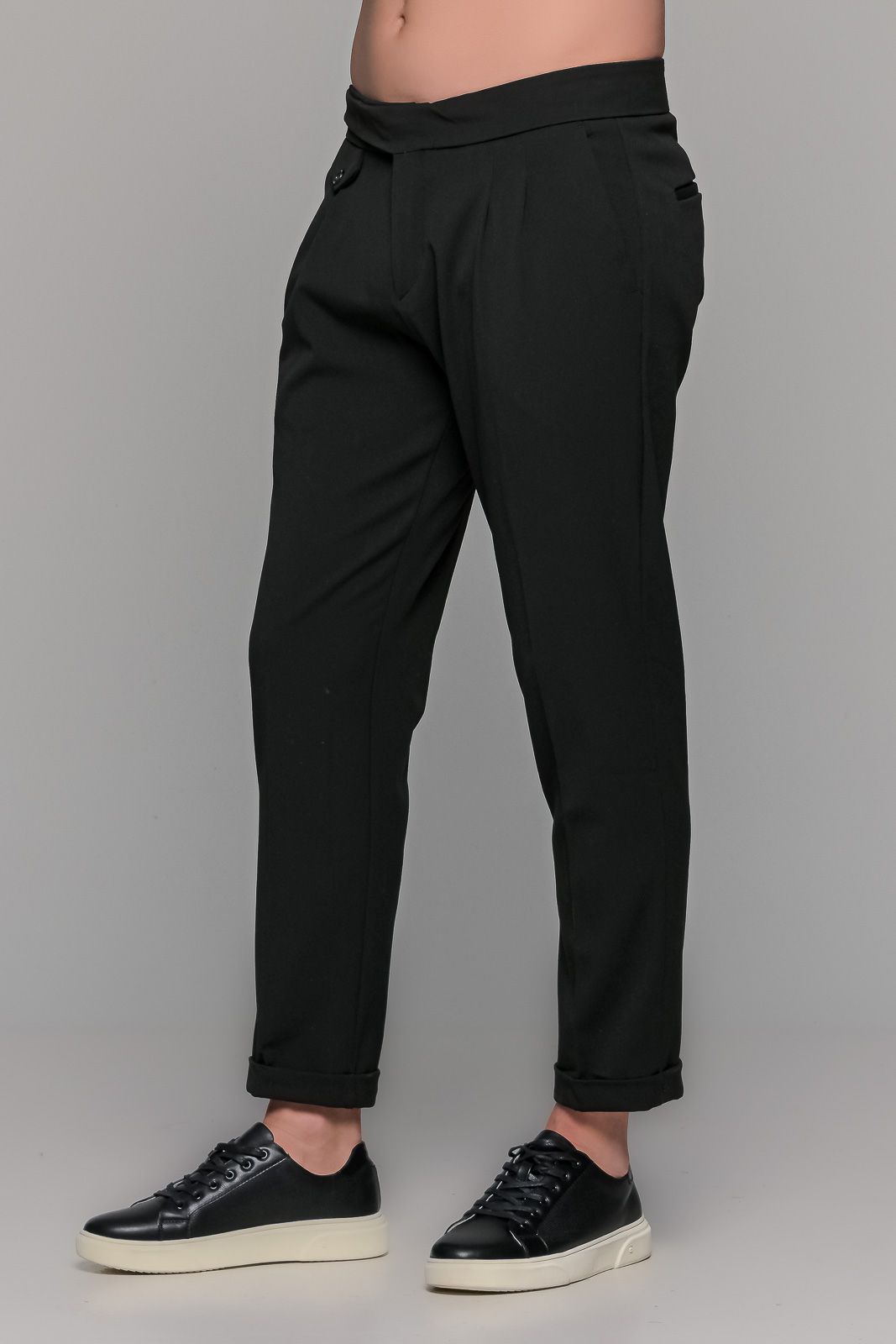 Υφασμάτινο ανδρικό παντελόνι με διπλή πιέτα τύπου κοστουμιού σε χρώμα Μαύρο και φαρδύ ζωνάρι. Η γραμμή του είναι στενή (slim fit) και ενδείκνυται κυρίως για όσους προτιμούν τα εφαρμοστά ρούχα. Για όσους δεν προτιμούν τα στενά ρούχα μπορείτε να επιλέξετε ένα νούμερο μεγαλύτερο από αυτό που φοράτε συνήθως.
