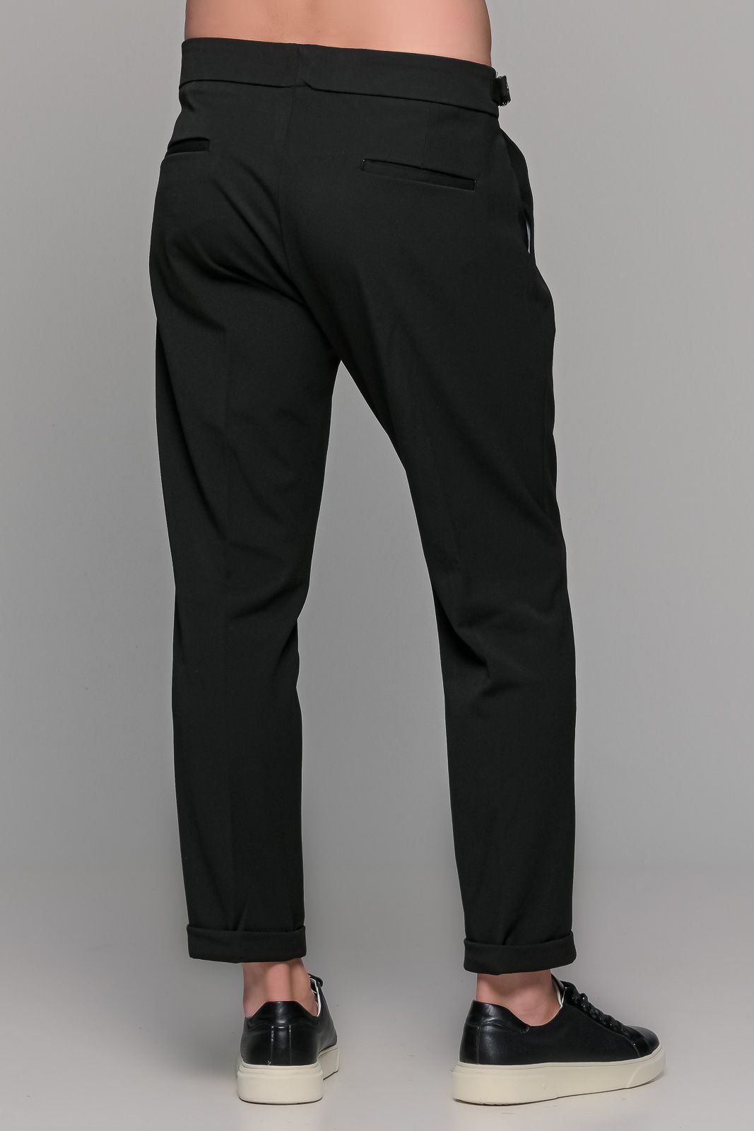 Υφασμάτινο ανδρικό παντελόνι με διπλή πιέτα σε χρώμα Μαύρο σε στενή γραμμή (slim fit). Κλείνει με φερμουάρ και κουμπί. Διαθέτει φαρδύ ζωνάρι το οποίο καταλήγει σε μεταλλική πιάστρα. Η σύνθεση του είναι συνδυασμός από συνθετικό και βισκόζη, η οποία προσφέρει στο ρούχο ιδιαίτερα λεία και μεταξένια υφή. Επίσης, διαθέτει και ελαστικό για άνετη εφαρμογή. Το υφασμάτινο ανδρικό παντελόνι με διπλή πιέτα σε χρώμα Μαύρο σε στενή γραμμή (slim fit) που κολλάει επάνω στο πόδι και το αναδεικνύει, ενδείκνυται κυρίως για όσους προτιμούν τα εφαρμοστά ρούχα. Έχει δυο πλαϊνές εξωτερικές τσέπες. Στο τελείωμα του έχει γύρισμα στο μπατζάκι με ριβερ. Μπορεί να φορεθεί τόσο για casual εμφανίσεις όσο και με σακάκι. Μπορεί να συνδυαστεί με μπλουζάκι τύπου polo αλλά και με πουκάμισο.