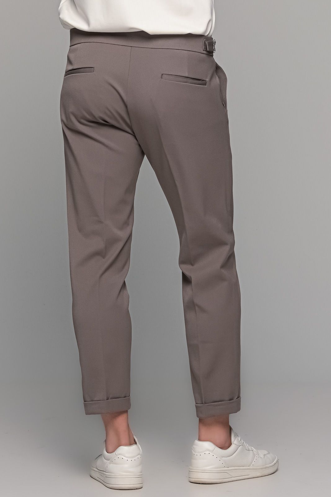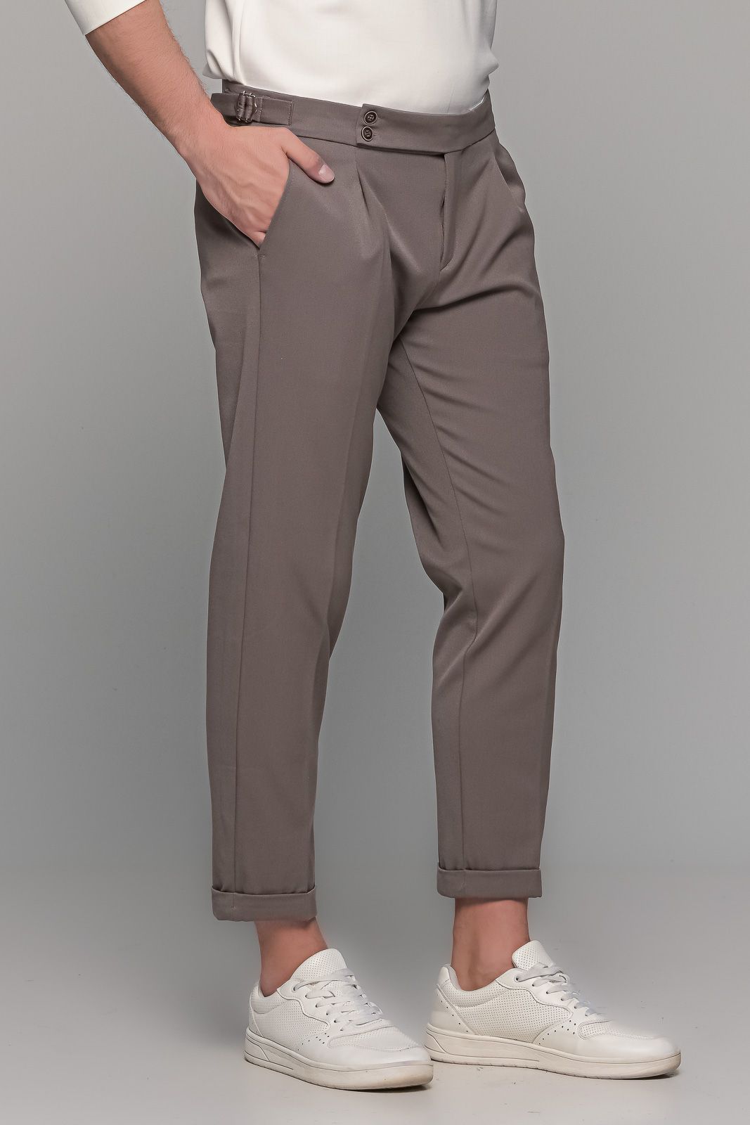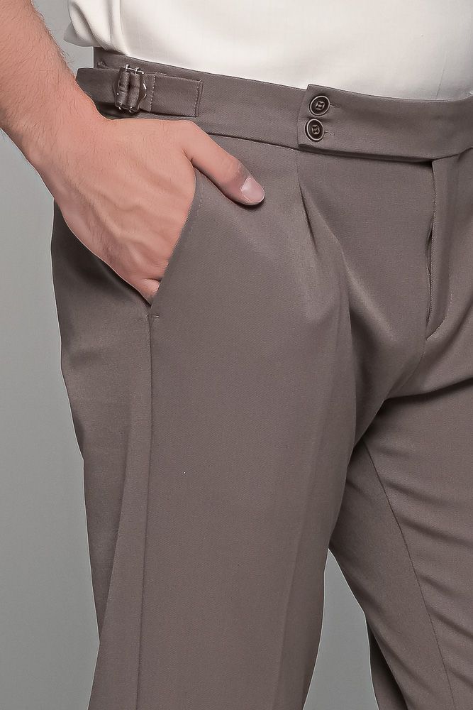 Υφασμάτινο ανδρικό παντελόνι με μονή πιέτα τύπου κοστουμιού σε χρώμα Πούρου και φαρδύ ζωνάρι. Η γραμμή του είναι στενή (slim fit) και ενδείκνυται κυρίως για όσους προτιμούν τα εφαρμοστά ρούχα. Για όσους δεν προτιμούν τα στενά ρούχα μπορείτε να επιλέξετε ένα νούμερο μεγαλύτερο από αυτό που φοράτε συνήθως.