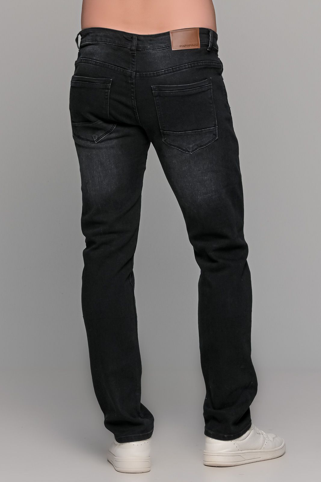 Μαύρο ανδρικό τζιν παντελόνι PAPARAZZI με ξέβαμμα στα πόδια μπροστά και πίσω σε στενή γραμμή (slim fit). Έχει δυο πλαϊνές εξωτερικές τσέπες ενώ κλείνει με φερμουάρ και τρουκ. Το μεγεθολόγιο του είναι κανονικό οπότε επιλέγετε το μέγεθος που φοράτε συνήθως στα παντελόνια ή τα τζιν σας.