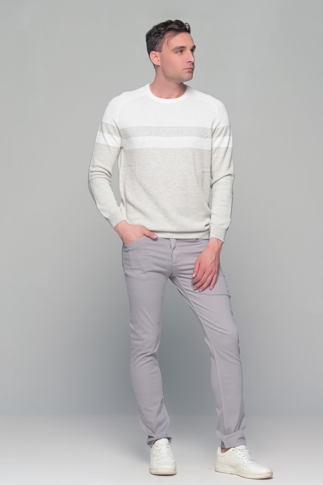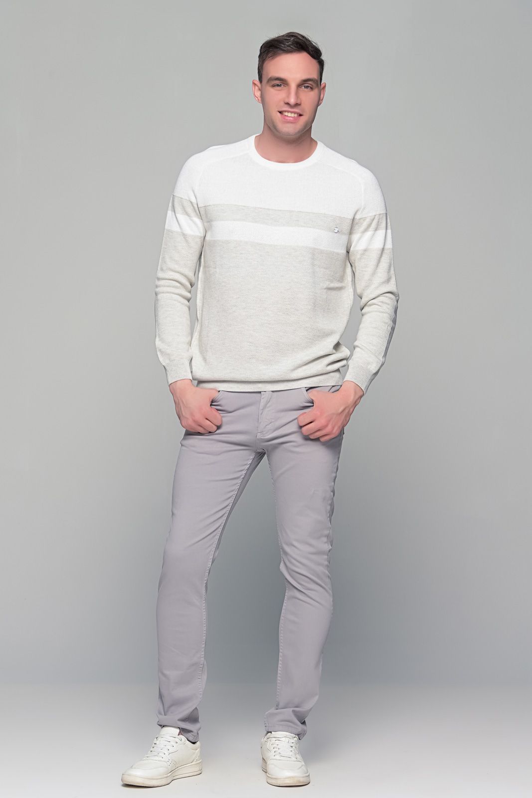 Δίχρωμο λευκό-μπεζ ανδρικό πουλόβερ Massaro με λαιμόκοψη. Η σύνθεση του αποτελείται από βαμβάκι και ακριλικό με αποτέλεσμα να αναπνέει το δέρμα αλλά και πολύ μαλακό στην άνετη εφαρμογή του στο σώμα. Δίχρωμο λευκό-μπεζ ανδρικό πουλόβερ αποτελεί μια διαχρονική επιλογή στο ανδρικό ντύσιμο, ενώ αποτελεί μια εξαιρετική επιλογή για δώρο επειδή μπορεί να φορεθεί με πολλούς διαφορετικούς συνδυασμούς. Συνδυάζεται ιδανικά με παντελόνια (chino ή cargo) και με τζιν. Επειδή είναι μαλακό μπορεί να φορεθεί με κάποιο μπλουζάκι ή πουκάμισο από μέσα. Ταιριάζει τόσο με γήινα χρώματα (όπως το καφέ και κάμελ) όσο και με πιο ψυχρά χρώματα όπως το γκρι και το μαύρο. Η γραμμή του είναι κανονική (true to size) οπότε προτιμήστε για αγορά το συνηθισμένο μέγεθος σας.