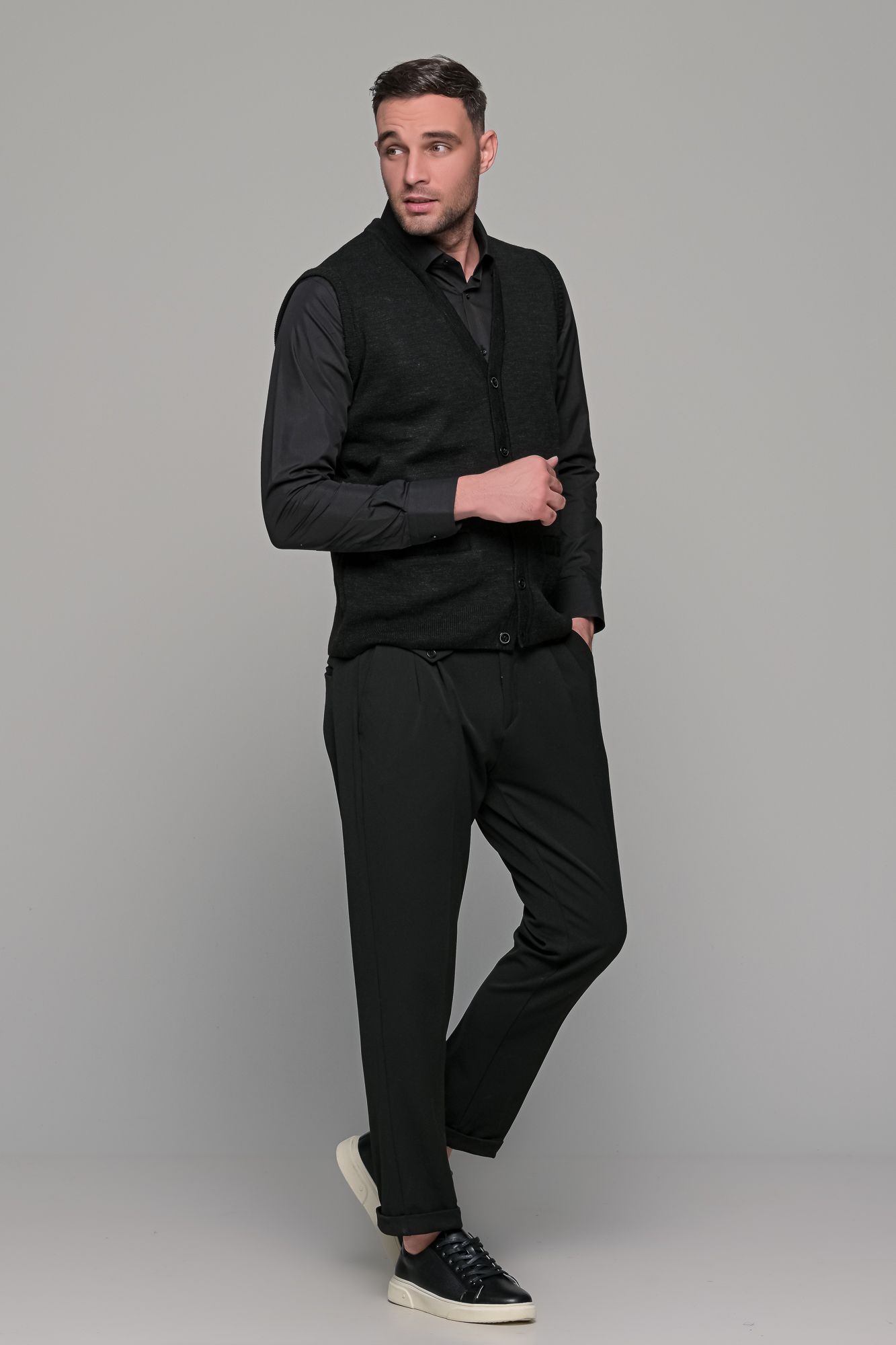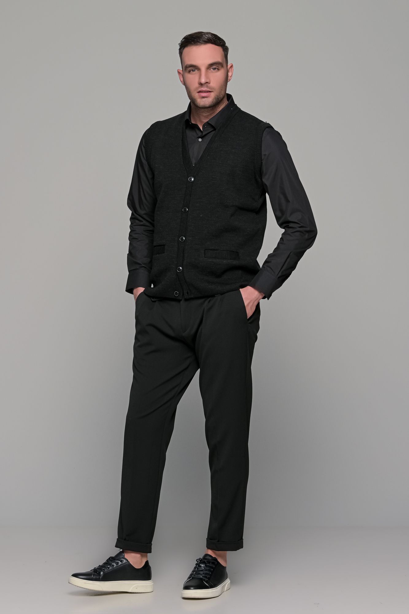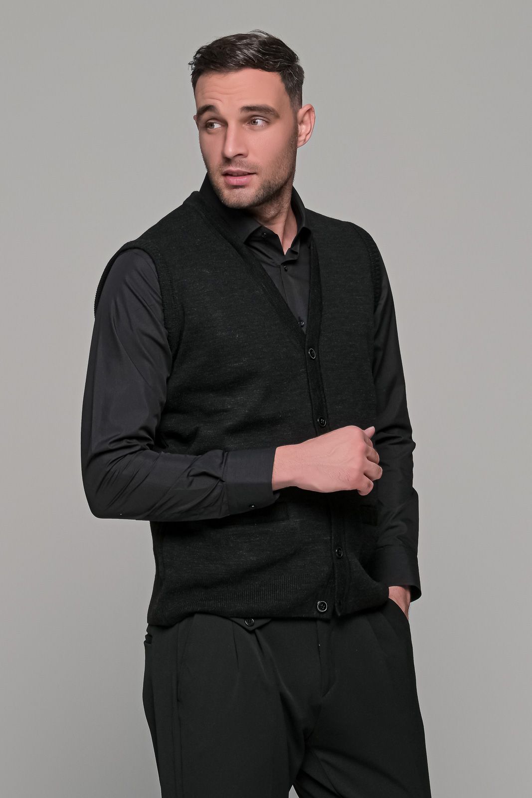 Μαύρη ανδρική καζάκα με κουμπιά και ve κόψιμο στο λαιμό. Το ύφασμά της  είναι μαλλί με ακρυλικό για να μην κομπιάζει. Η πλέξη της είναι δίχρωμη, σκούρο γκρι ανθρακί με μαύρο. Έχει λάστιχο στο τελείωμα για καλύτερη εφαρμογή. Μπορεί να φορεθεί είτε με σκέτο πουκάμισο μακρυμάνικο για πιο casual εμφανίσεις είτε με ένα πουκάμισο και γραβάτα, ακόμα και με κοστούμι για βραδινές εξόδους. Η μαύρη ανδρική καζάκα με κουμπιά μπορεί να φορεθεί με πολλούς διαφορετικούς συνδυασμούς χρωματικά. Αυτό άλλωστε την καθιστά και ιδανική επιλογή για όσους αναζητούν ένα όμορφο και πρακτικό δώρο. Προτείνεται η αγορά του μεγέθους που φοράτε συνήθως (true to size). Η γραμμή της είναι κανονική (normal fit) ενώ η εφαρμογή της είναι κανονική (regular fit).