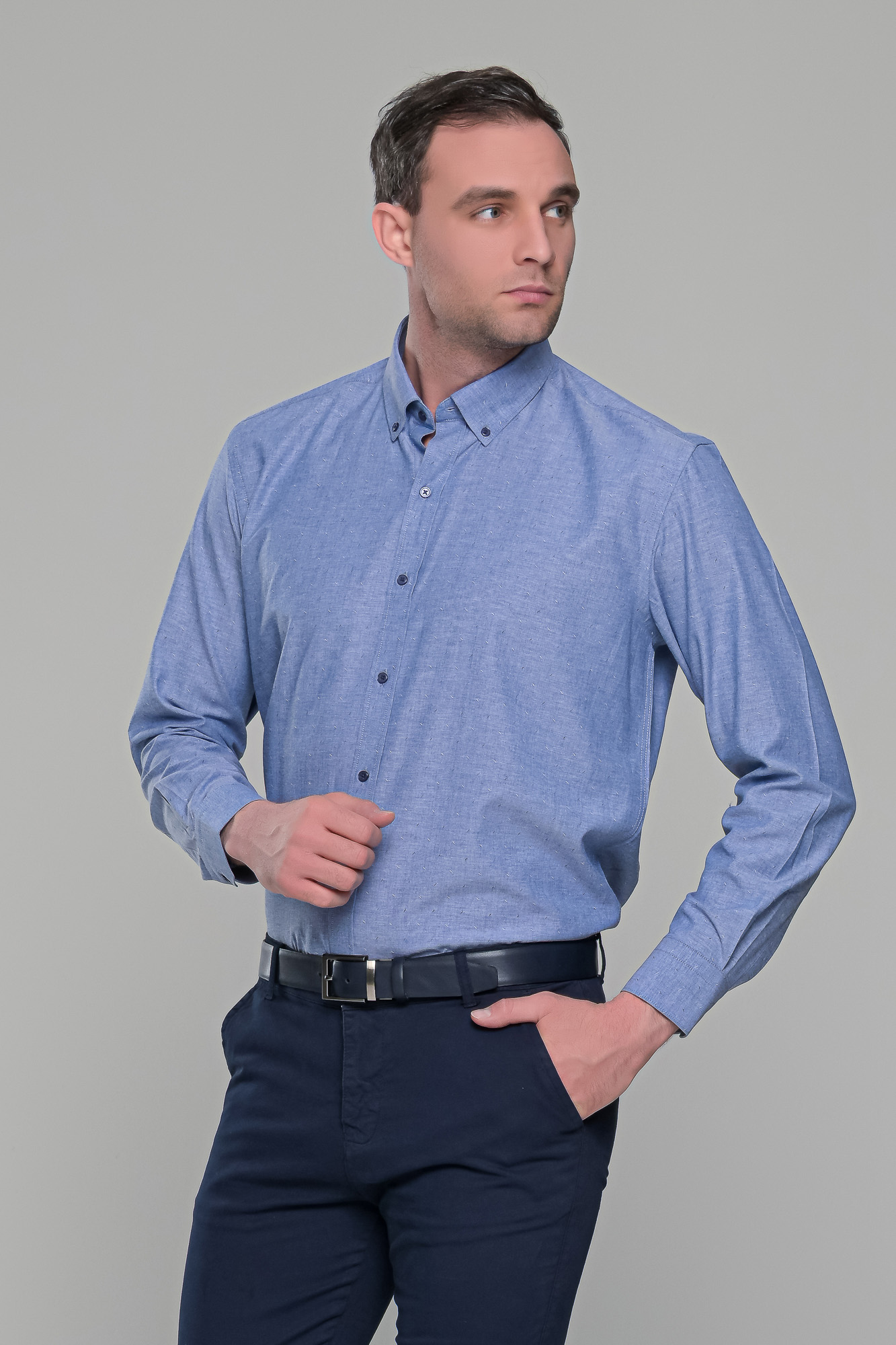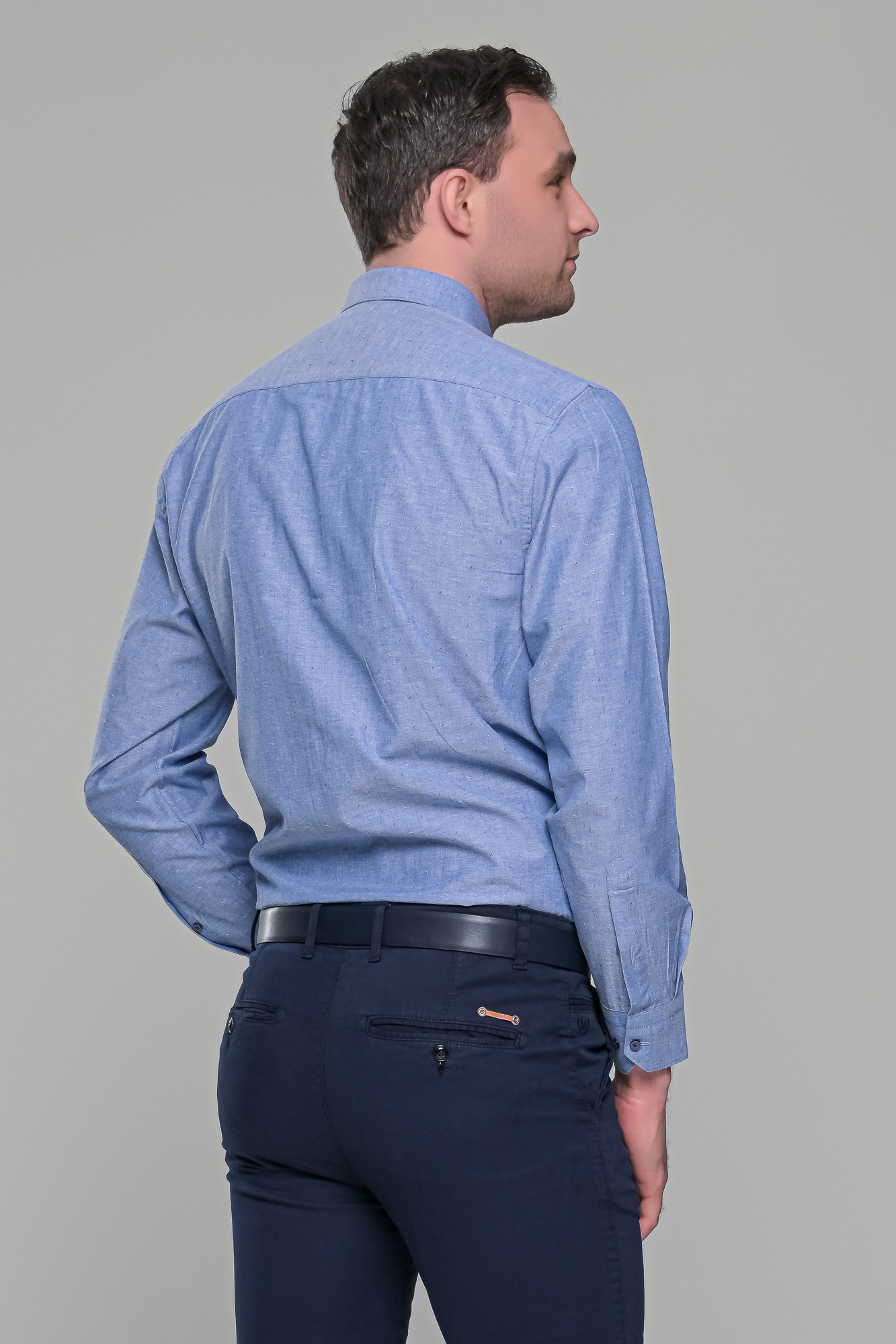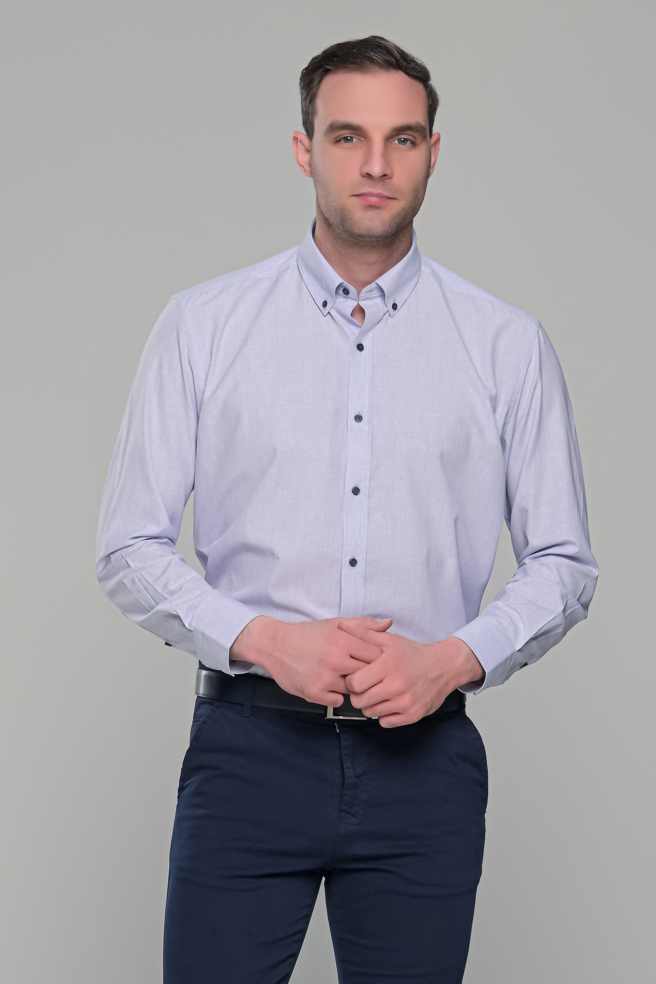 Μακρυμάνικο ανδρικό πουκάμισο PAPARAZZI σε γκρι μπλε χρώμα με μικροσχέδιο και κουμπί στον γιακά. Η γραμμή του είναι κλασική (classic fit) και η εφαρμογή του άνετη (loose fit). Τα μεγέθη του είναι κανονικά, οπότε επιλέγετε το μέγεθος που φοράτε συνήθως στην κλασική γραμμή.